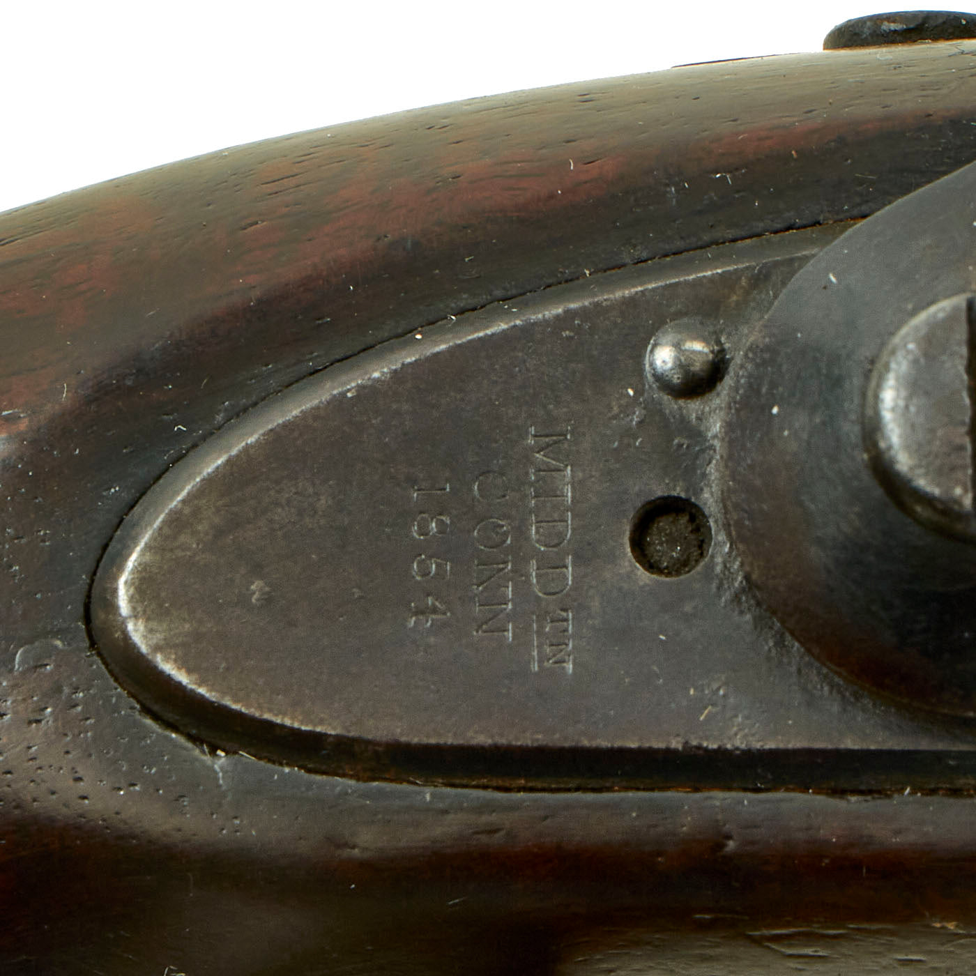 The lock plate on this example is marked U.S. / I.N. JOHNSON in front of the hammer, and MIDDTN / CONN / 1854 on the tail of the lock plate. The barrel is proof marked with the inspectors initials: US / JCB / P, and is also marked STEEL on the left barrel facet. The inspector marking is for John C. Beaumont Lt., USN, who is specifically noted for inspecting "I.N. Johnson Pistols, Ames Pistols and Cutlasses 1852-1855." Overall the metalwork has a very nice blued finish, probably applied during an arsenal reconditioning.