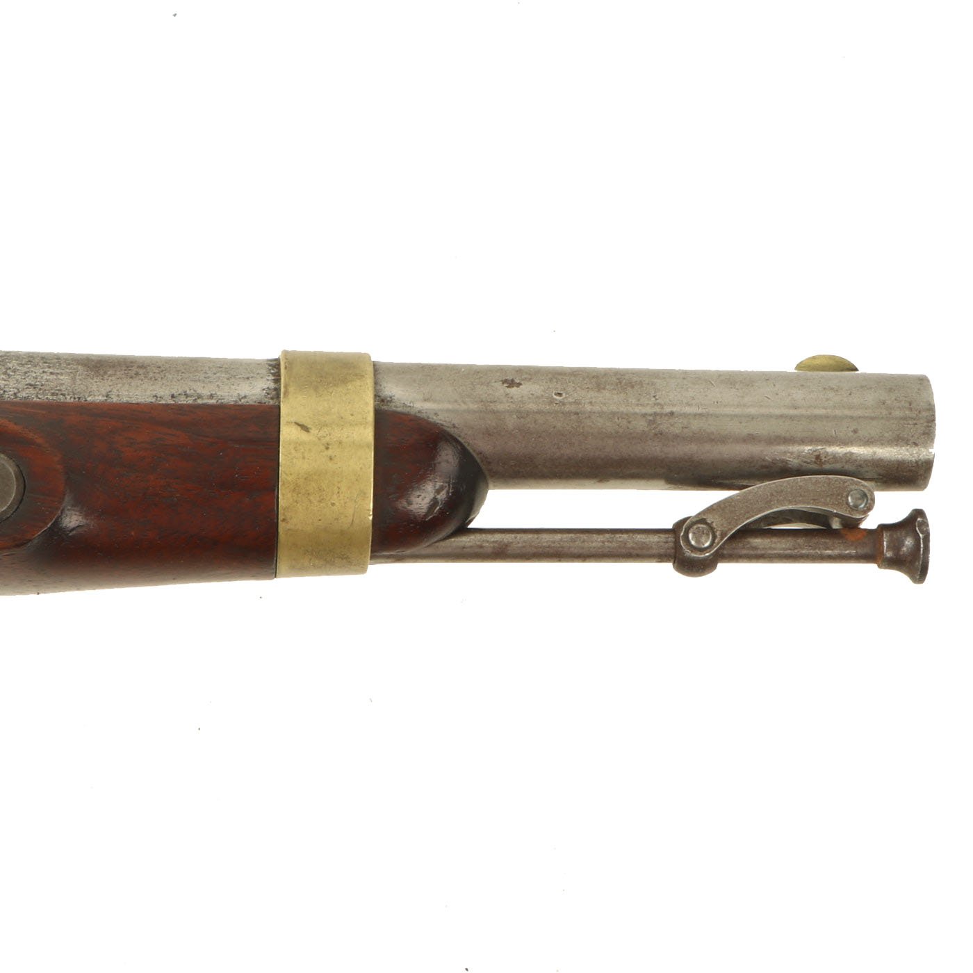 The Model 1842 was intended for use of Cavalry, and has a .54" caliber 8 1/2" barrel, with a with swivel steel "captured" ramrod for easier loading while on horse back. The pistol is 14 inches long in total, and is still well marked, with minimal powder burn. This pistol is in great shape, with lots of markings on the barrel AND stock. The ramrod and swivel link are still present, with the only real issue being that the head of the hammer screw sheared off at some point, easily replaced.