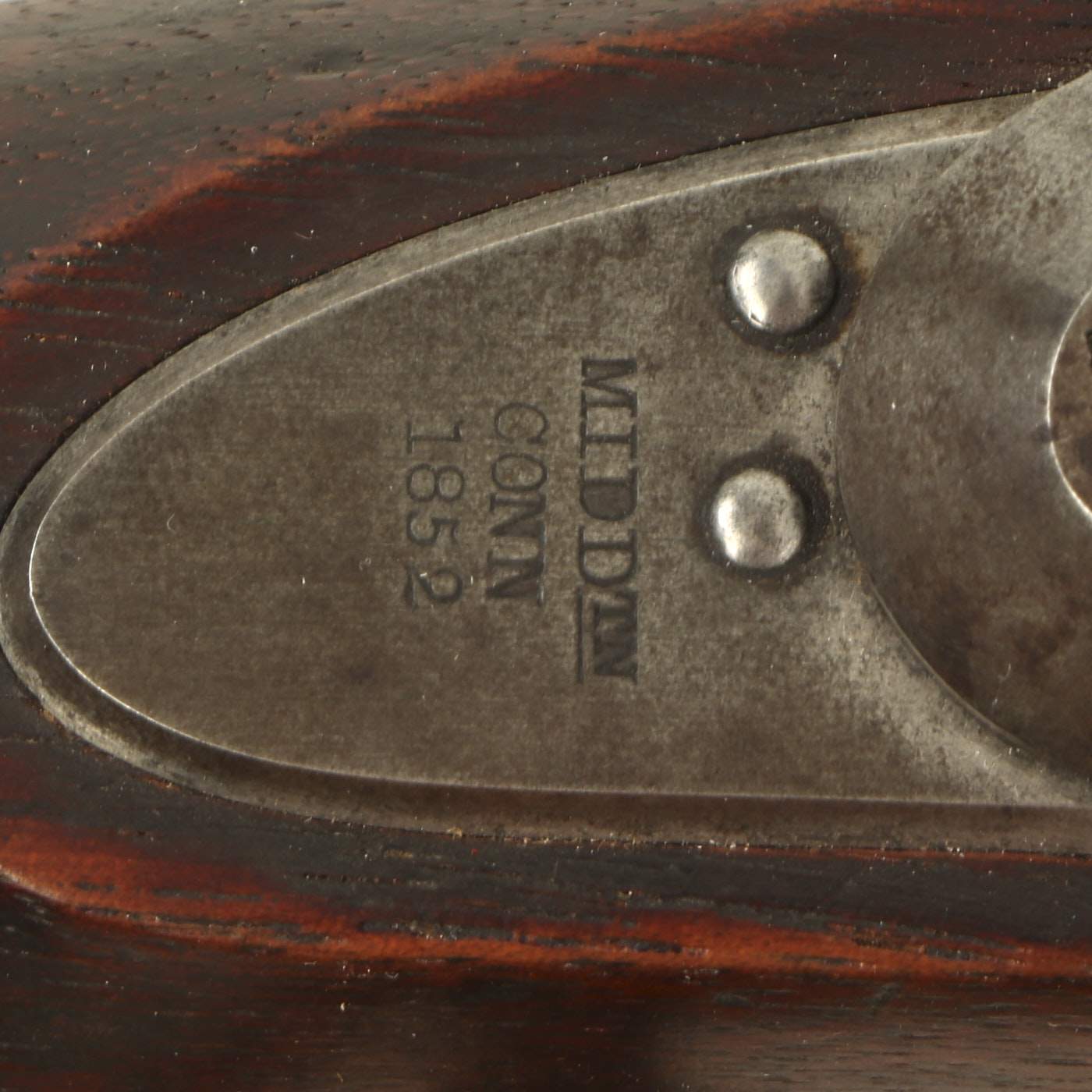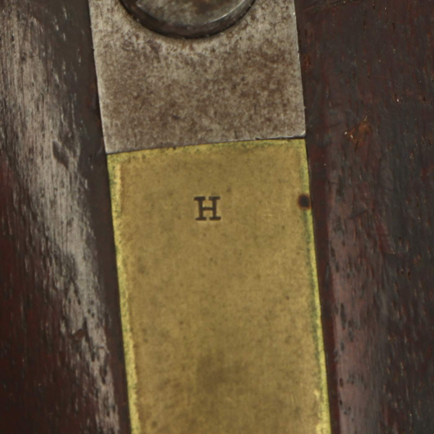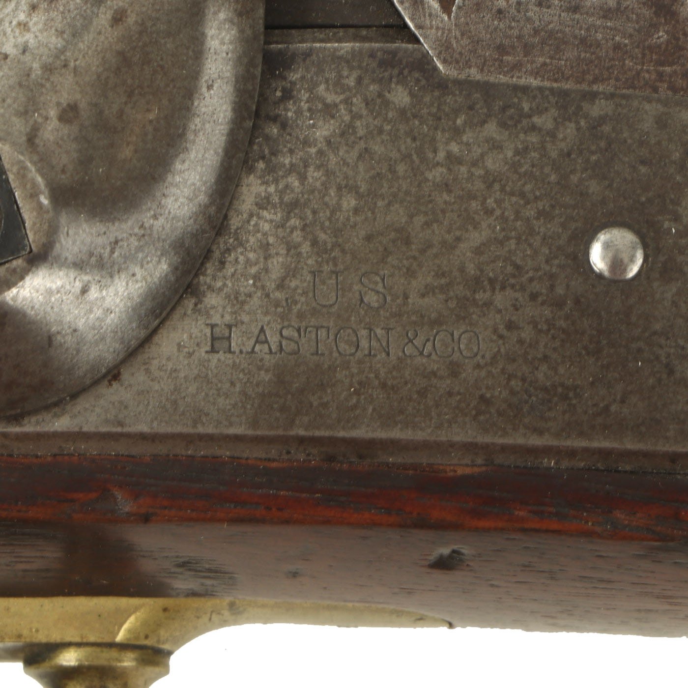 The lock plate on this example is marked U.S. / H. ASTON in front of the hammer, and MIDDTN / CONN / 1852 on the tail of the lock plate. The barrel tang is dated 1851, made in the previous year, and the top of the barrel is proof marked with several inspector's initials: M.S. / U.S. / G W P, with a J H on the side of the barrel. "MS" is unidentified, while "GW" is for George Wright, who specifically inspected Aston Pistols 1850-1852. JH could be one of several different inspectors working at the time.