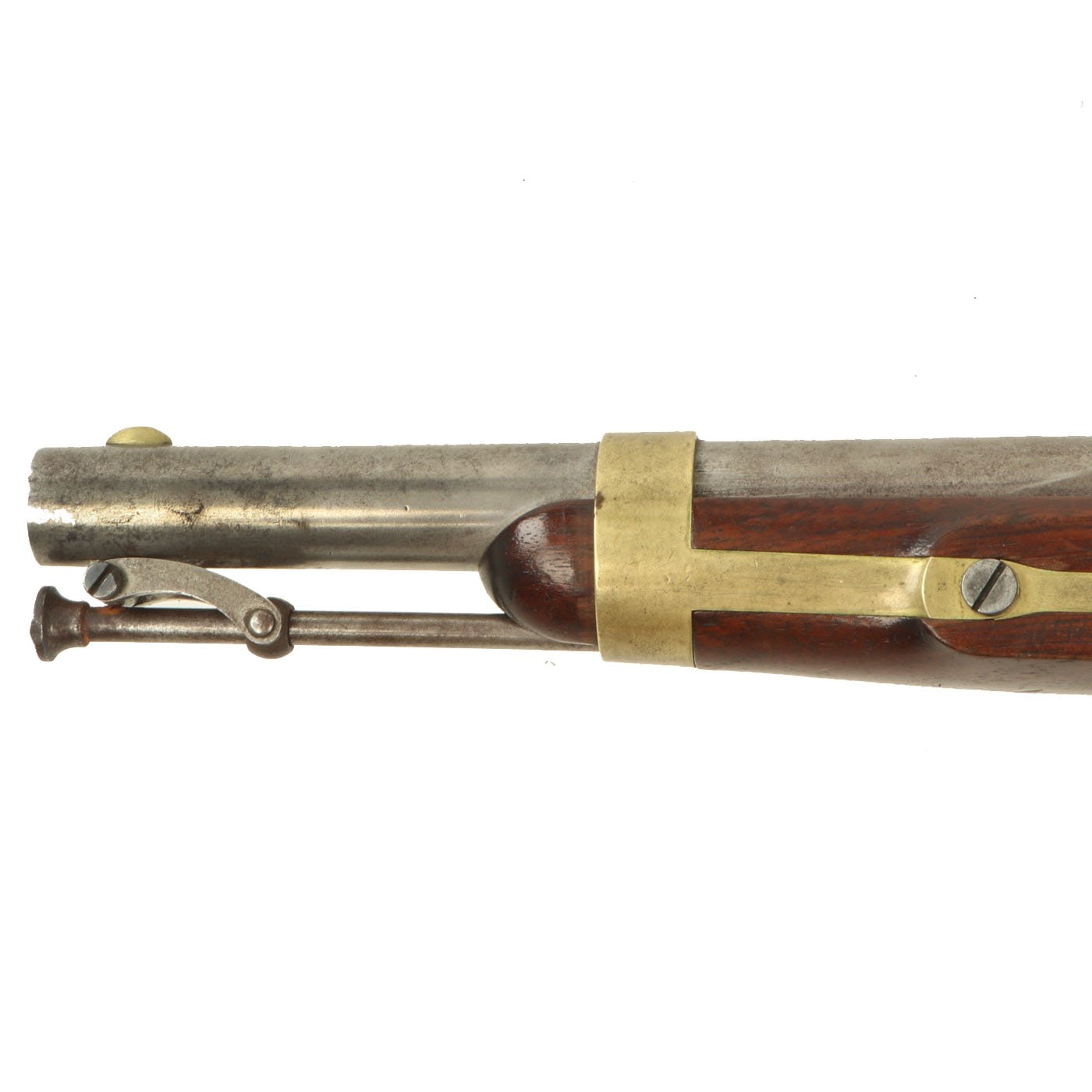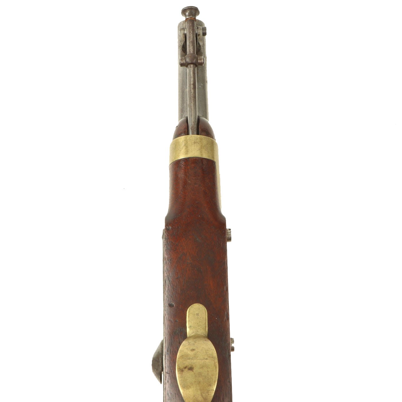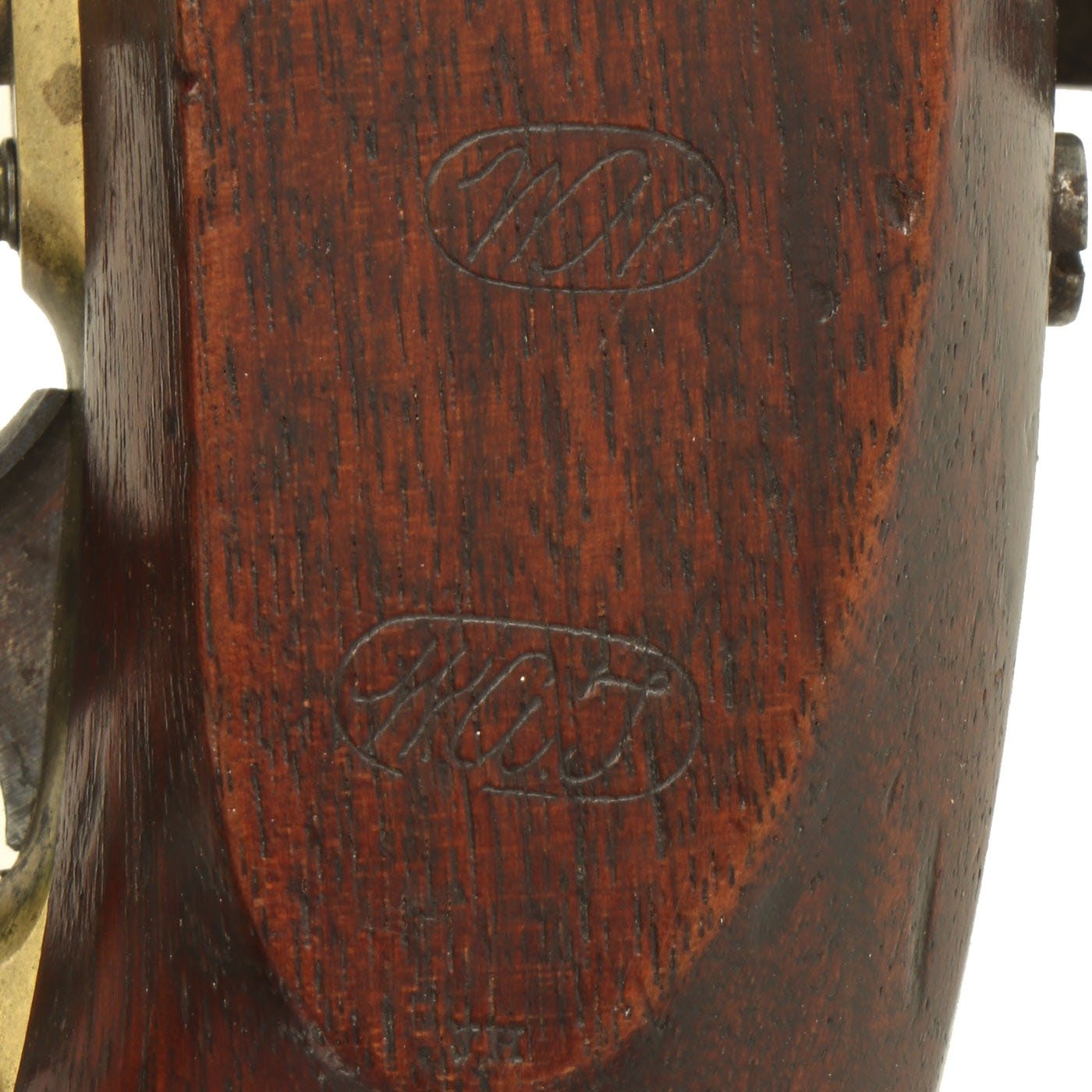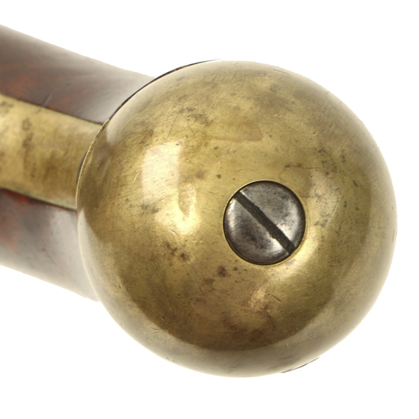 It has an excellent condition wood stock of partly curly Walnut and Brass mounts all in good lightly used condition. The original inspection cartouches on the left side are even still fully visible! It is marked with a stylized WN inside an oval, for Walter North, who specifically inspected Aston Pistols 1831-1852. Below this is another marking, WAT in an oval, indicating inspection by Captain William Anderson Thornton, who worked from 1841 to 1861, inspecting various small arms, specifically including pistols from Aston, Waters, and Johnson.