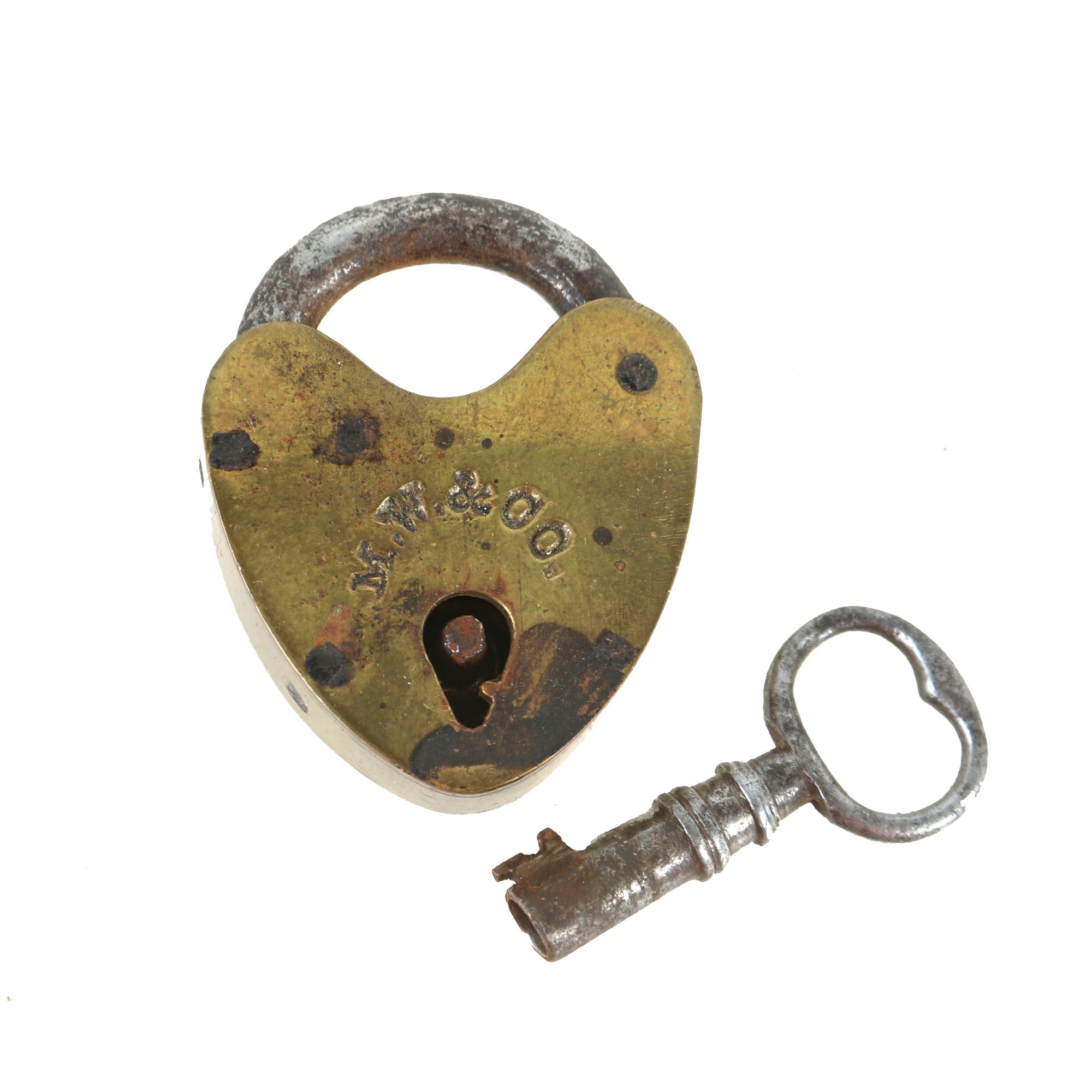 The flask has a boiled leather body and measures 4½ x 3⅜ x 12”. The brass spout has a threaded top which needs to be unscrewed in order to access the powder. The top has a latch which connects to a tab on the throat, with a small heart-shaped lock securing it, marked to the front M.W. & CO. The lock retains its original key, which is really saying something for a 150+ year-old powder flask.