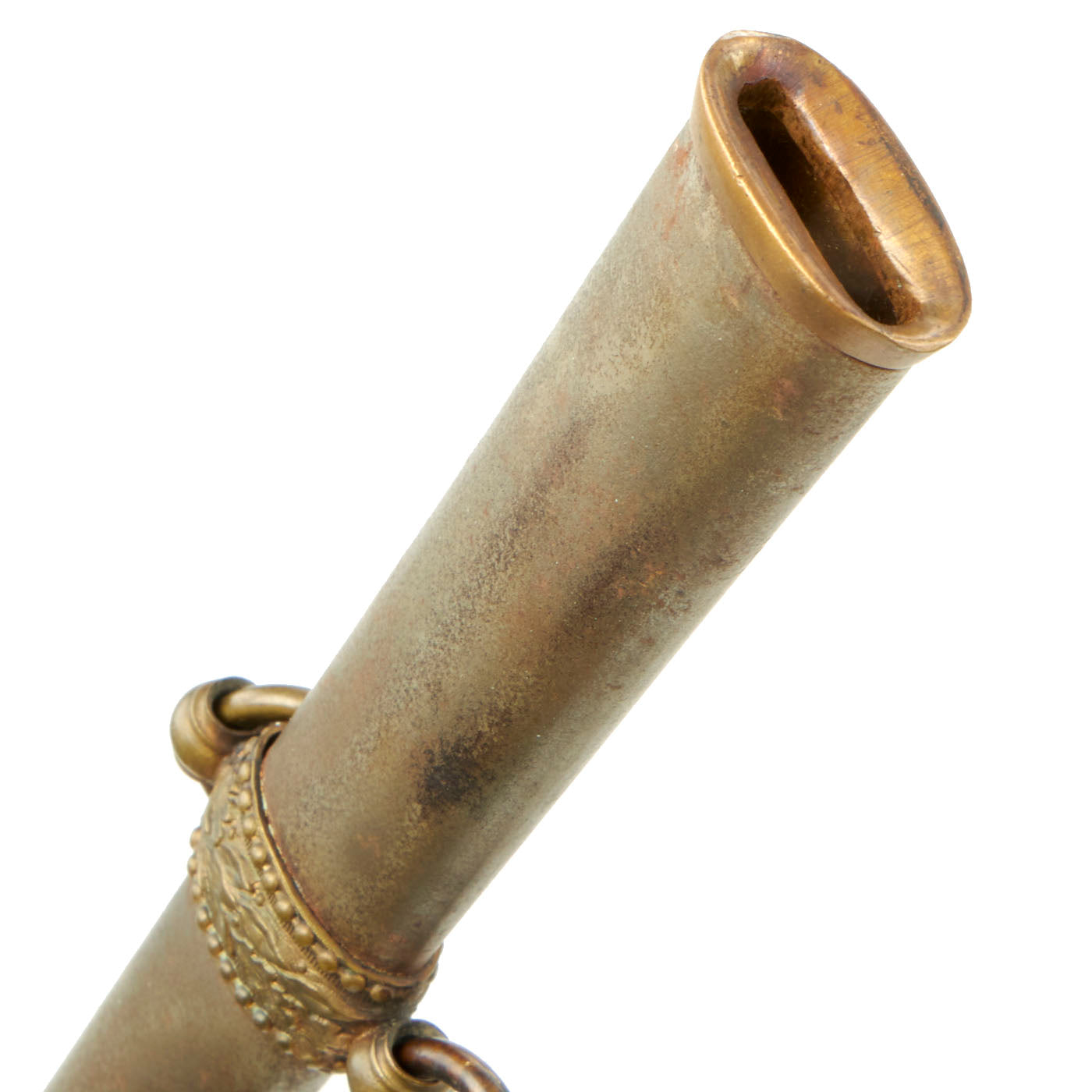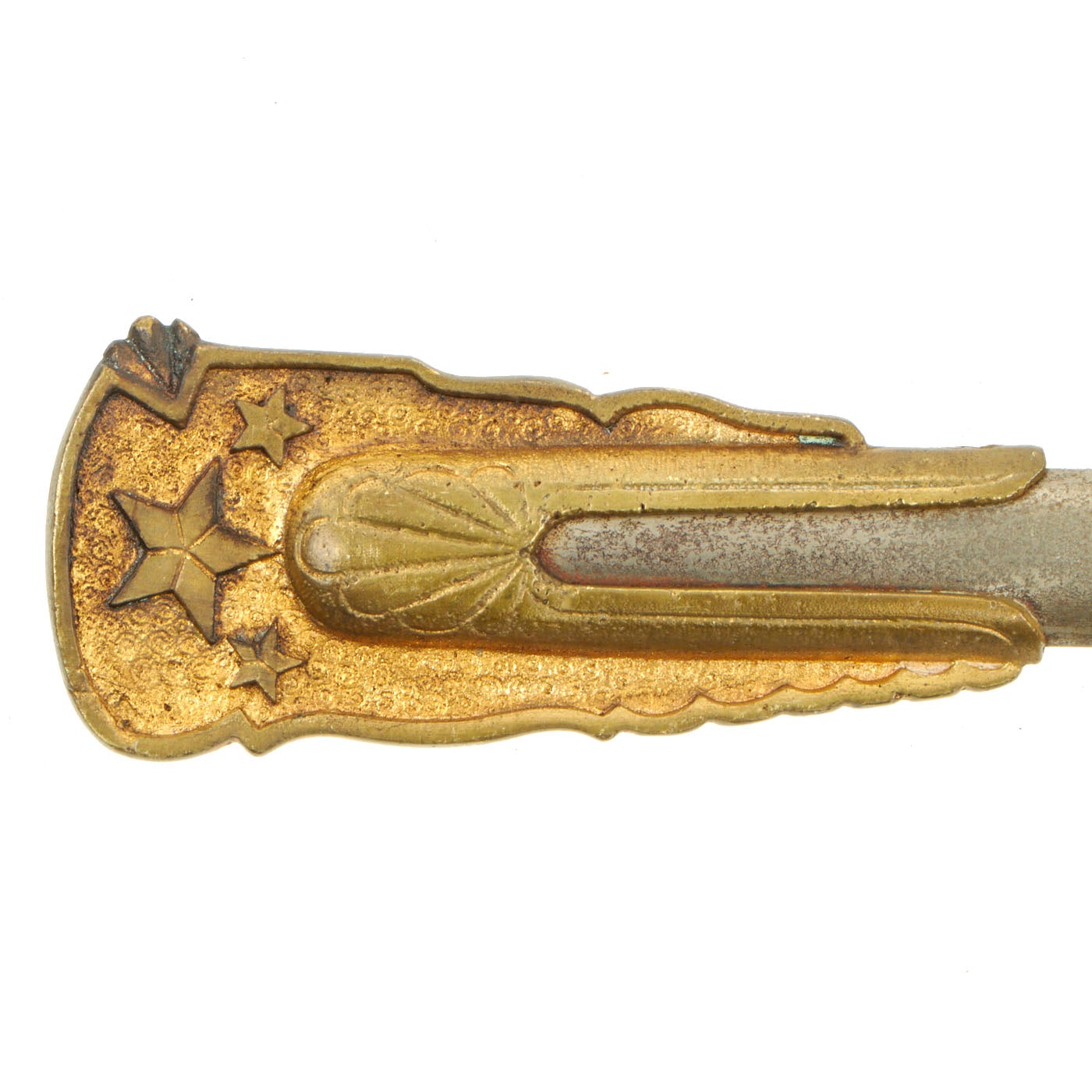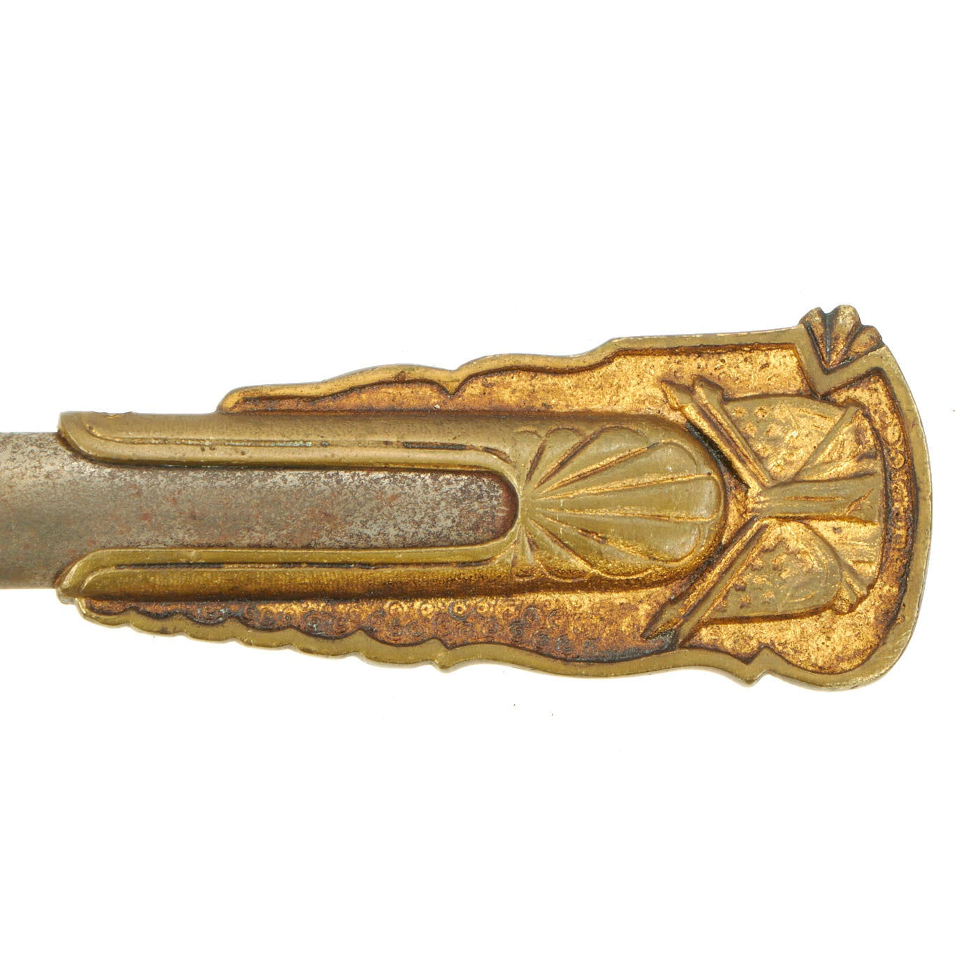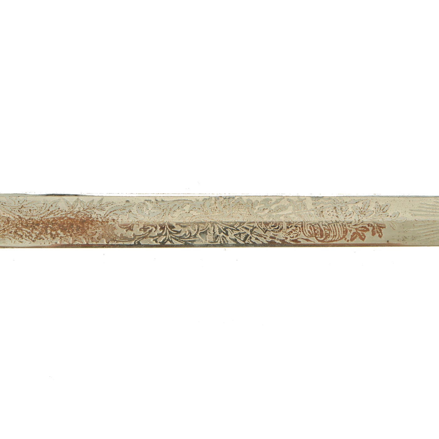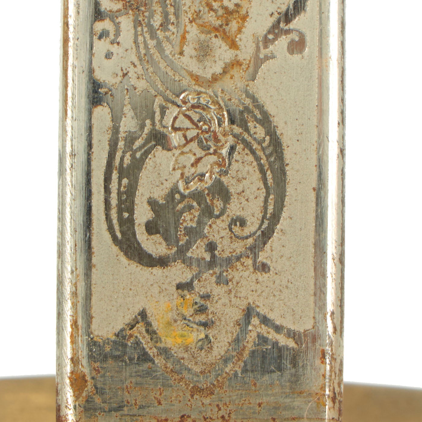 Condition is very good, with a great look and patina. The hilt has a lovely brass patina, and the grip is in very good condition for the age. The blade is relatively worn, and but shows the etching very well, the tip is slightly bent. The scabbard is worn but it has no major damage or dents.