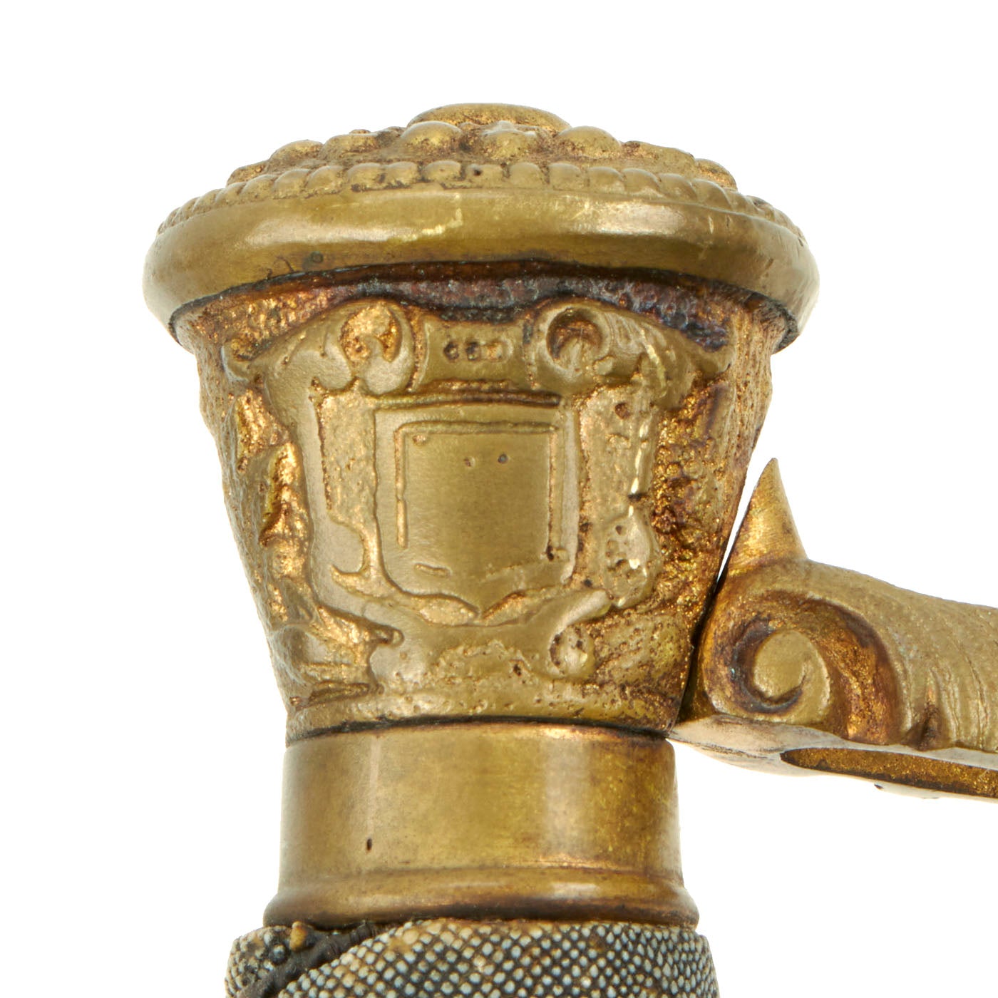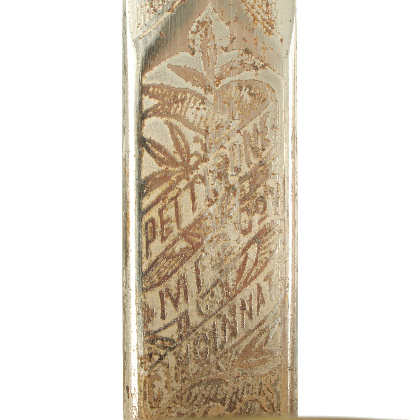 This example bears the manufacturer's logo of a Knight's Helmet (Ritter-helm) on the blade ricasso, the trademark of C.R. Kirschbaum, Metallwarenfabrik (Metal wares factory) of Solingen, Germany. At the time the company was run by Wilhelm Reinhard Kirschbaum of Solingen, a member of the well-known Kirschbaum family. He was the son of Carl Reinhard Kirschbaum, who died suddenly in 1862, and took over the business and the trademarks. In 1870 the company would be reorganized as "W.R. Kirschbaum". Wilhelm himself would then pass away suddenly in 1882, after which the family elected to amalgamate with Gebrüder Weyersberg, whose own family head Hermann died in 1883. This formed the famous firm of Weyersberg, Kirschbaum & Co. As part of this agreement the sales and trading portion of Weyersberg continued under numerous brand names. For more information please see J. Anthony Carter’s work GERMAN KNIFE AND SWORD MAKERS.