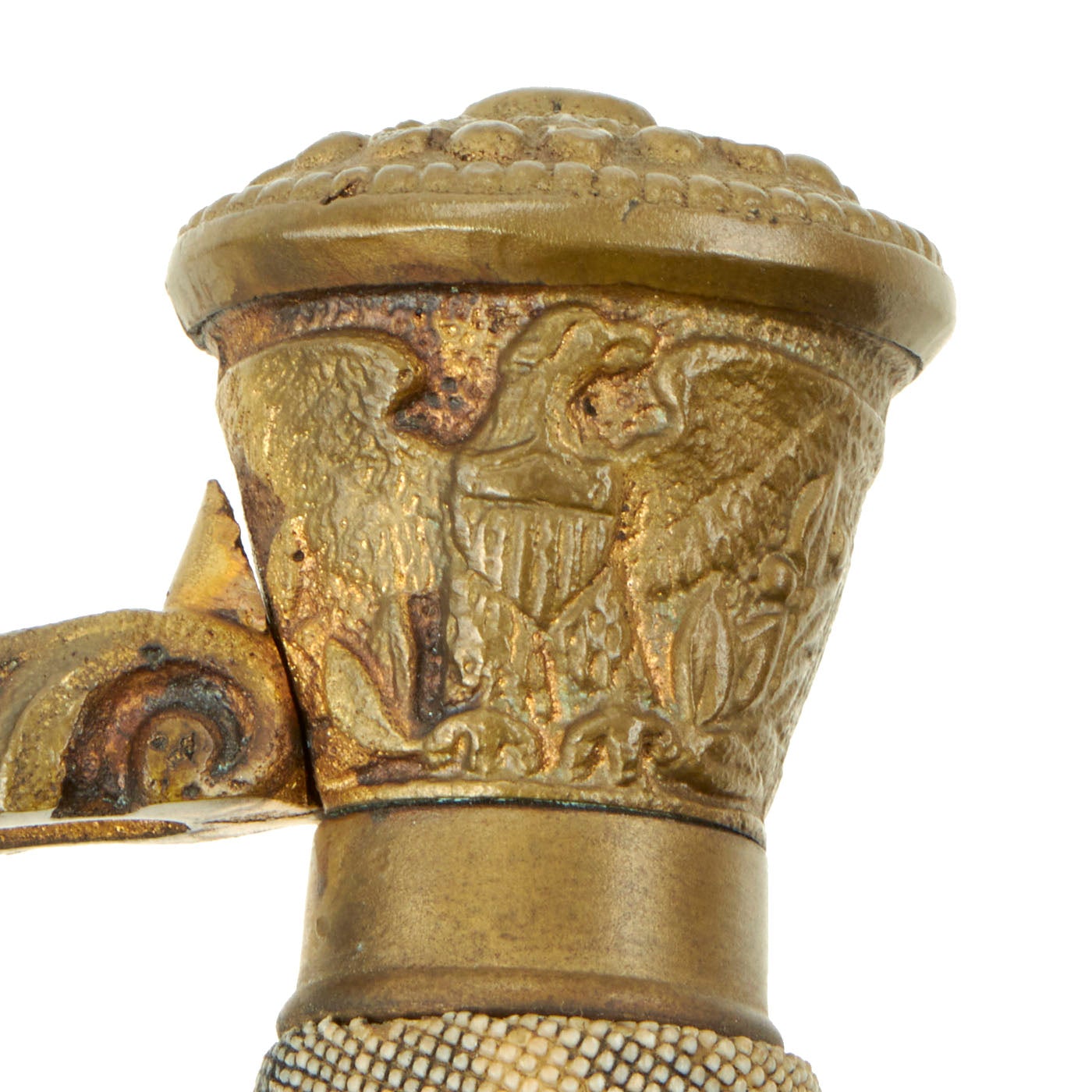 The sword measures 38" overall, and the hilt and "shell" Guard are of bronze/brass alloy and the grip is wire bound ray skin. Overall the guard is loose on the tang, though the grip is not. The guard has a lovely federal eagle design, typical of this pattern. It has a minimized guard on the inner side, to avoid irritation. It comes in its original brass mounted steel scabbard.