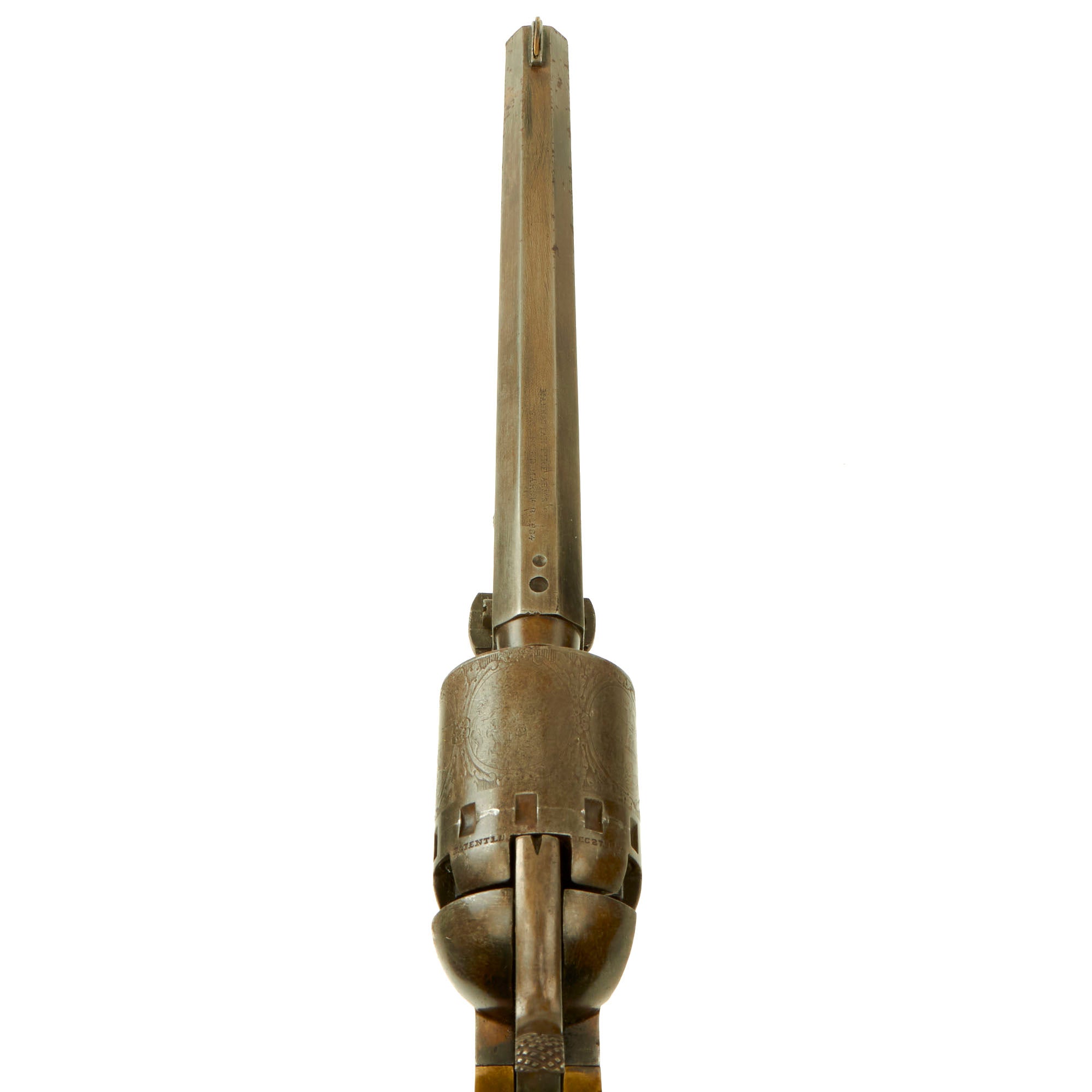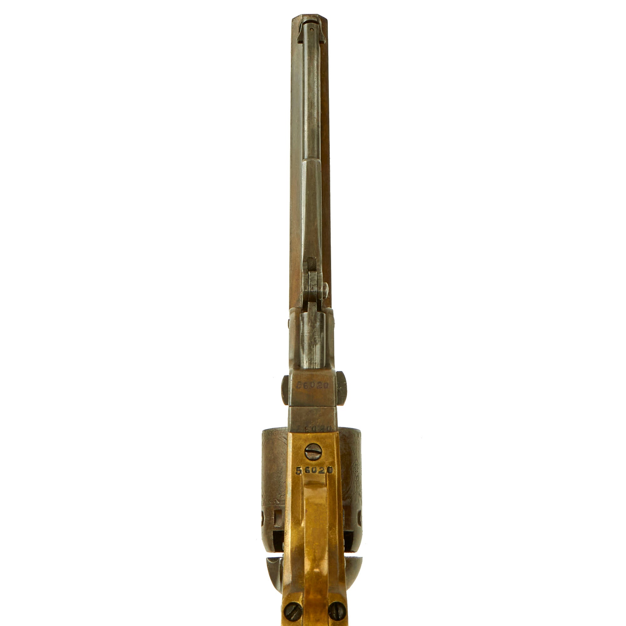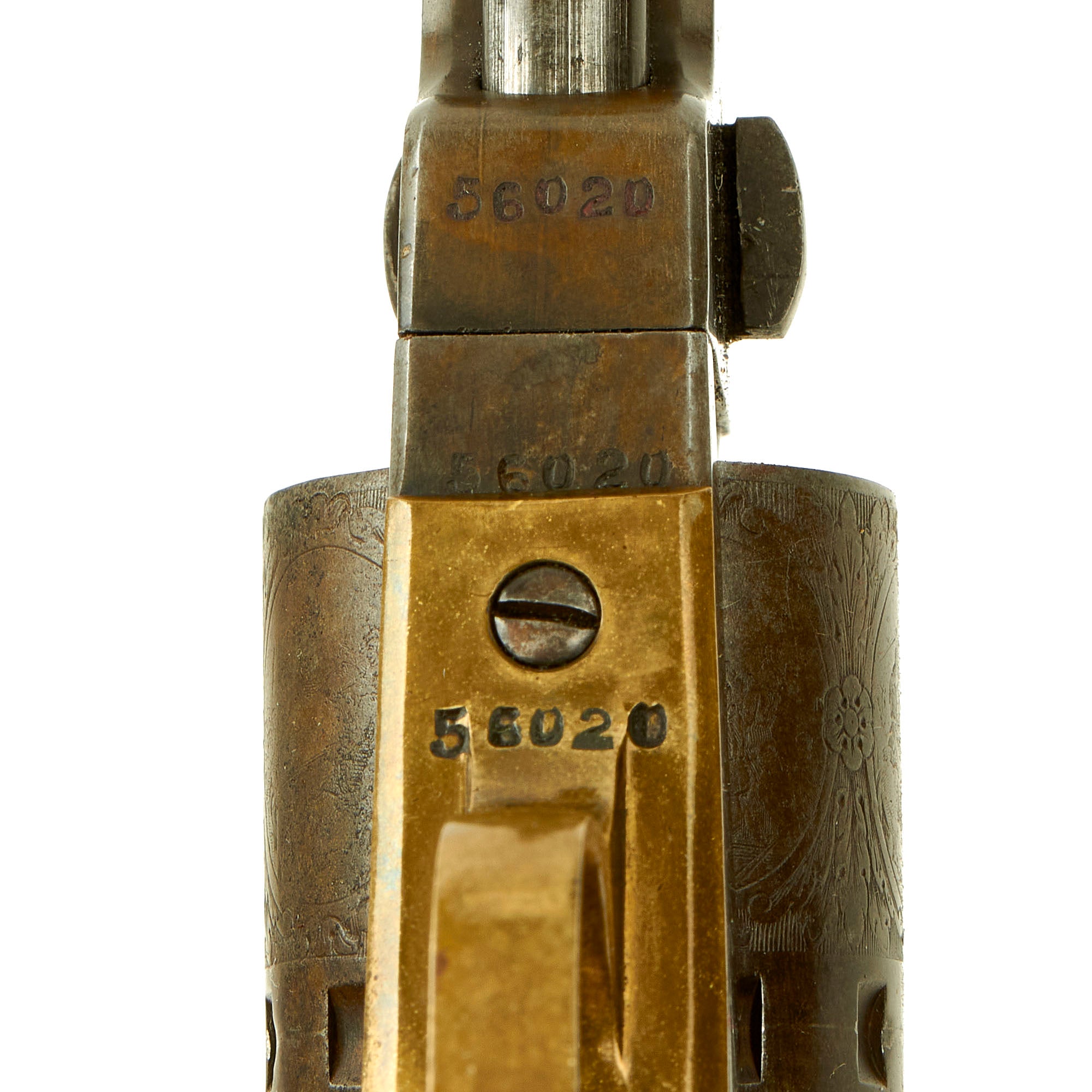 This example features the standard 6 1/2" barrel, and serial number 56020, which is found on the barrel, barrel wedge, frame, trigger guard, and the bottom of the grip. The serial markings on the cylinder arbor pin and the rear of the cylinder are unfortunately worn away. However, the revolver still has over 80% of the original cylinder engraving present! It consists of five different scenes, one for each chamber, which are all still mostly present. The cap nipples are all clear, and the PATENTED DEC. 27. 1859 marking is still crisp, something we rarely see!