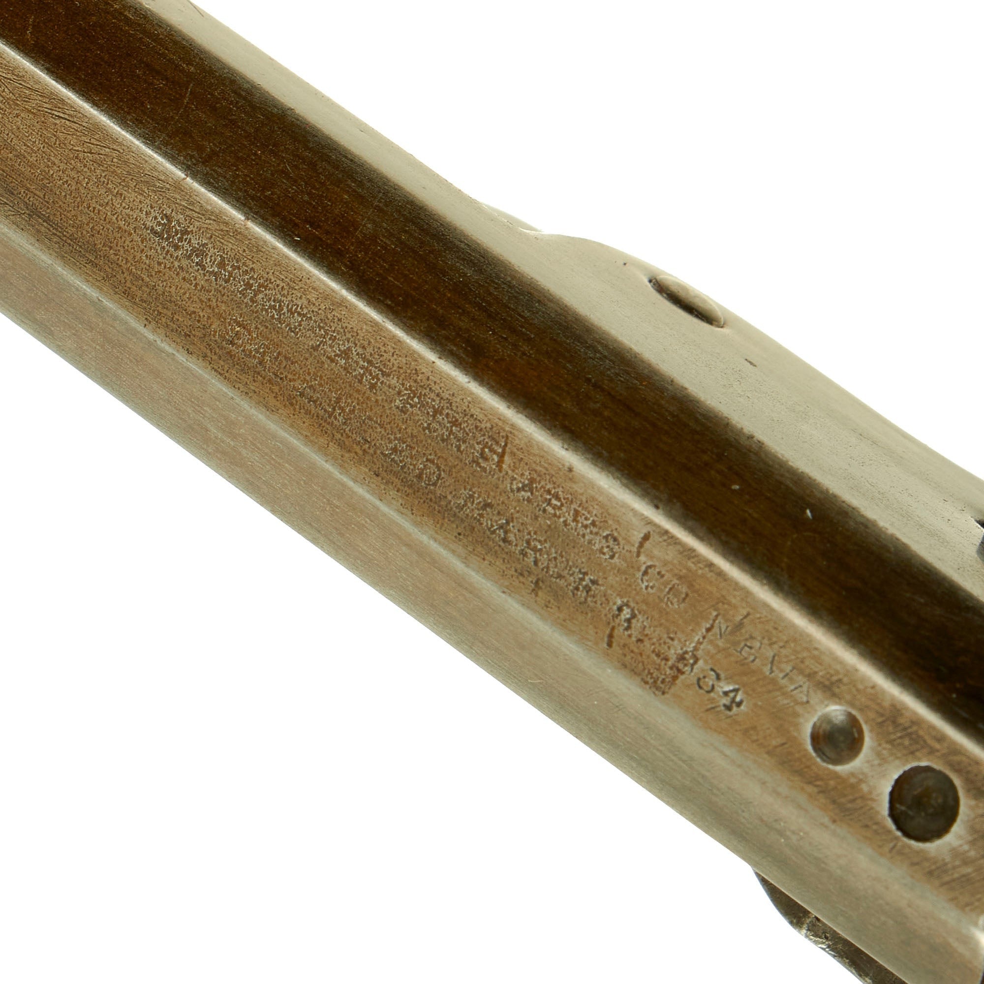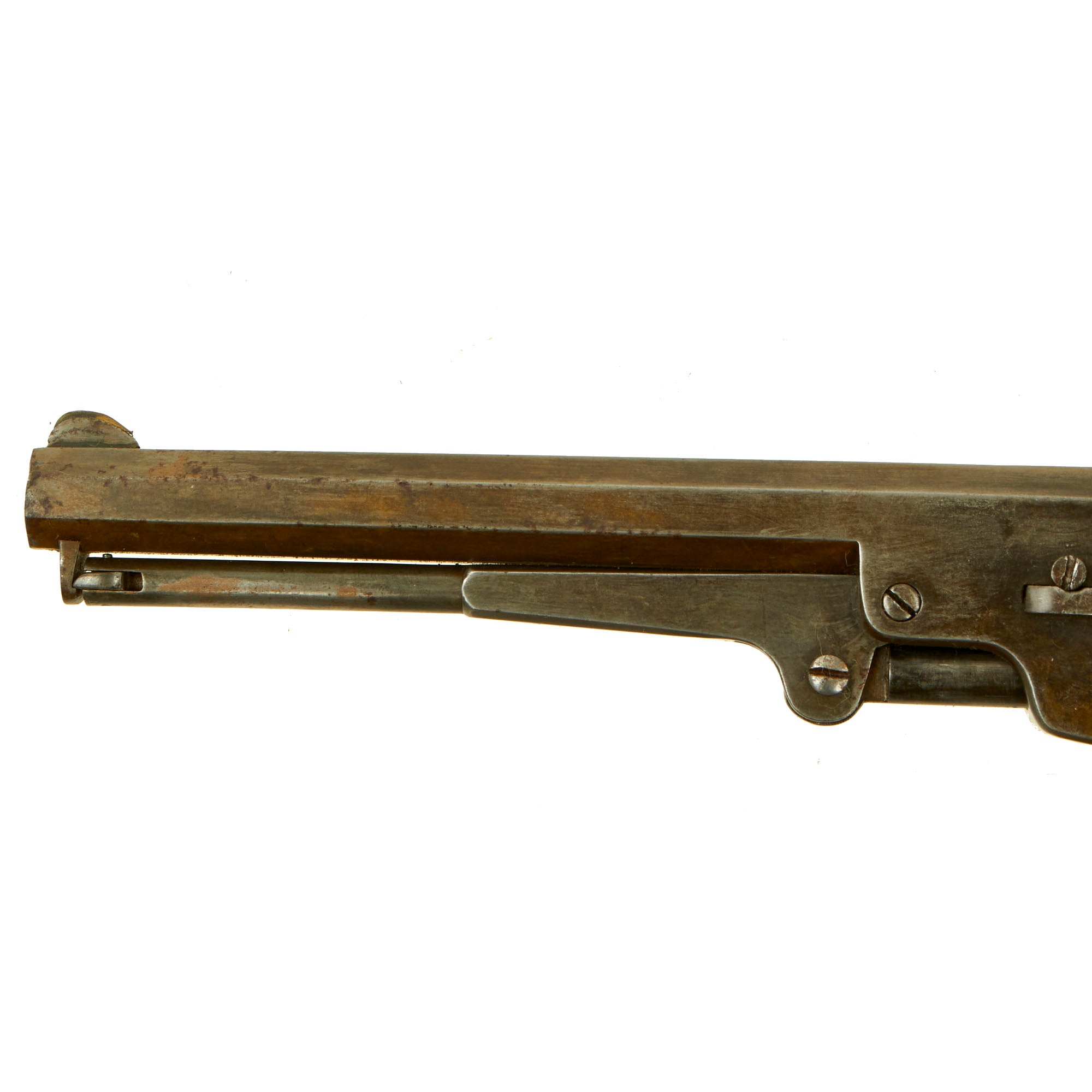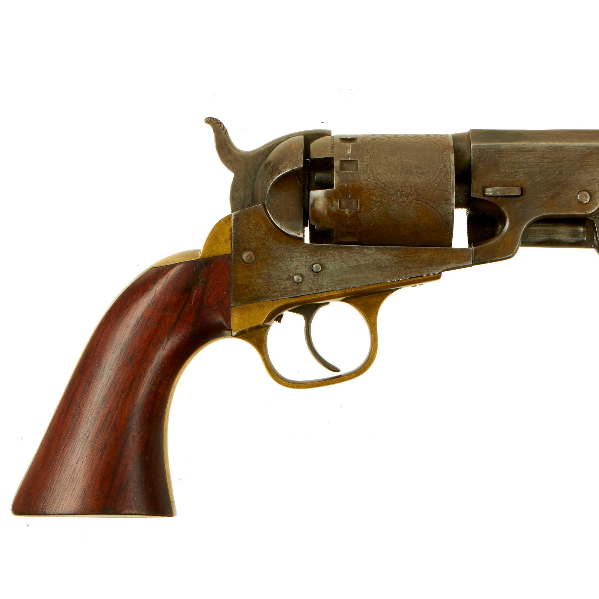 This example features the standard 6 1/2" barrel, and serial number 56020, which is found on the barrel, barrel wedge, frame, trigger guard, and the bottom of the grip. The serial markings on the cylinder arbor pin and the rear of the cylinder are unfortunately worn away. However, the revolver still has over 80% of the original cylinder engraving present! It consists of five different scenes, one for each chamber, which are all still mostly present. The cap nipples are all clear, and the PATENTED DEC. 27. 1859 marking is still crisp, something we rarely see!