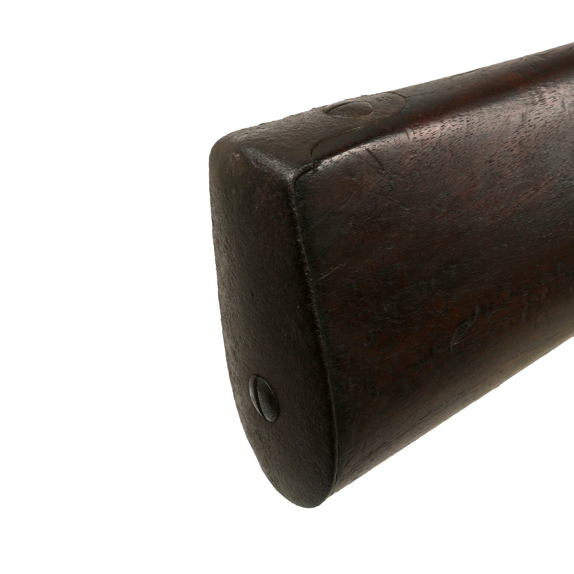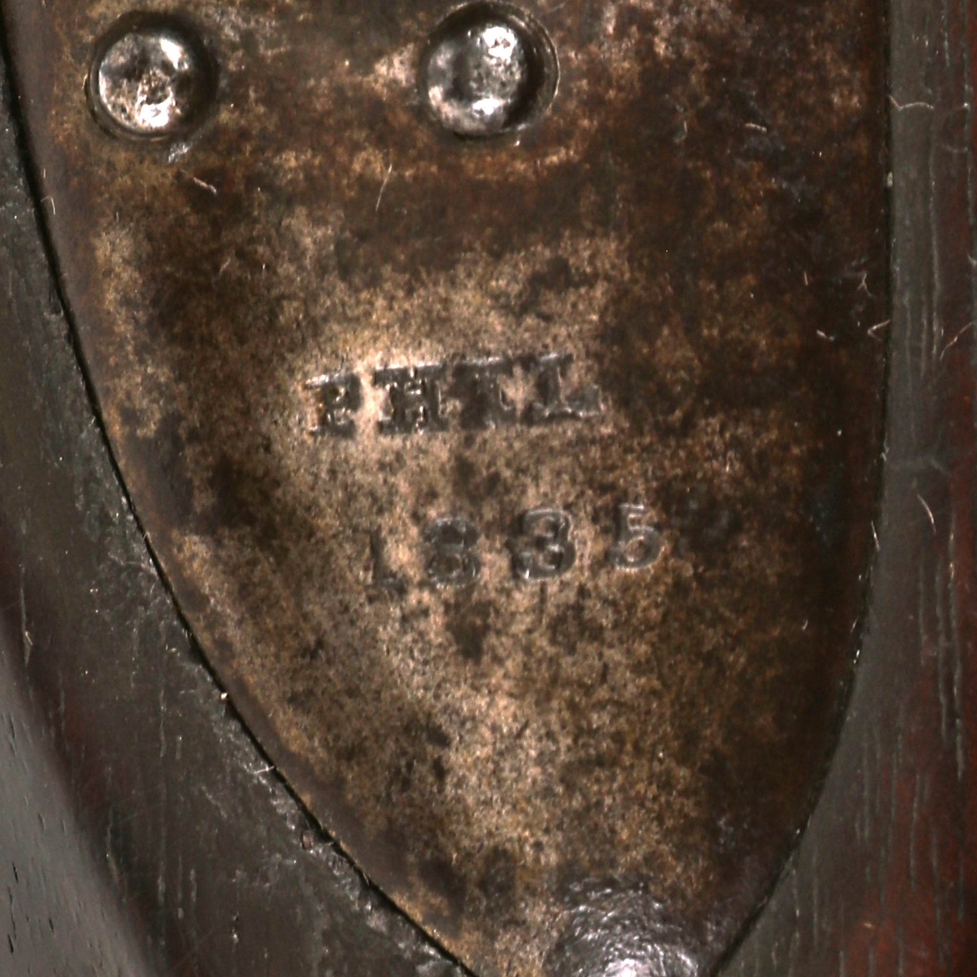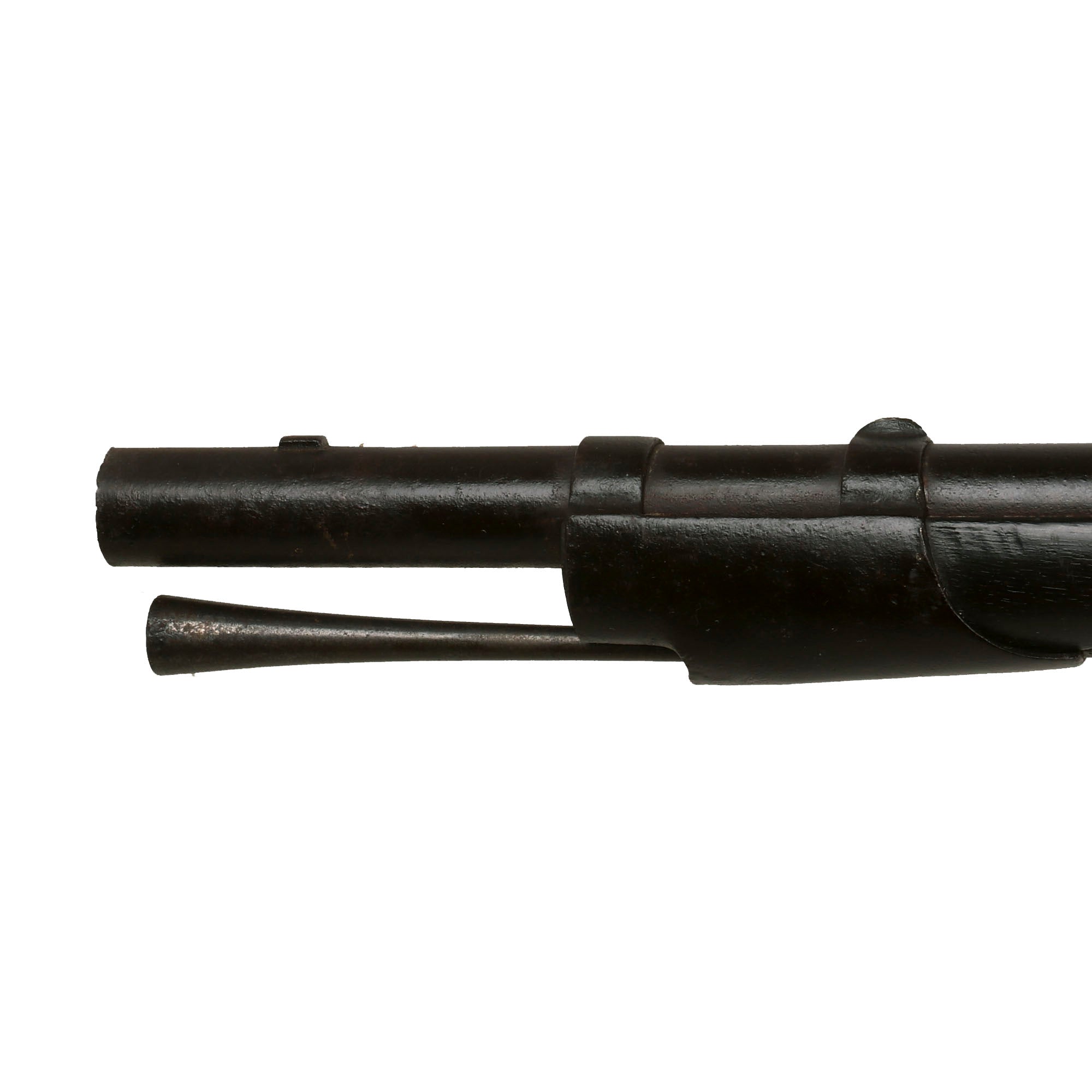 The left side of the wood stock shows a faded inspector's cartouche that looks to read TW and the entire weapon is in very good matured condition. There are some small dents and chips in the stock, but overall it presents very nicely, with a lovely dark red brown color. There is very little chipping or cracking, just a small crack running from the rear lock screw to the breech area, a very common occurrence.