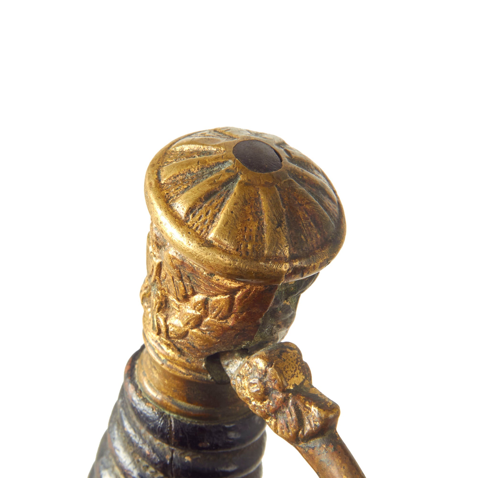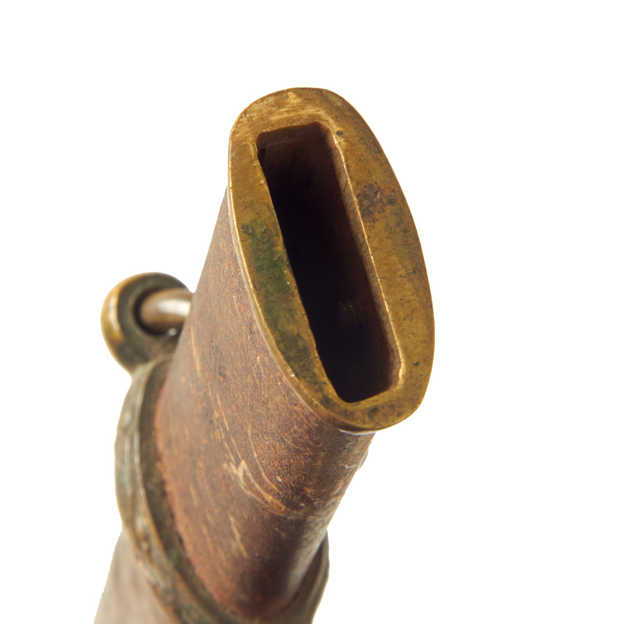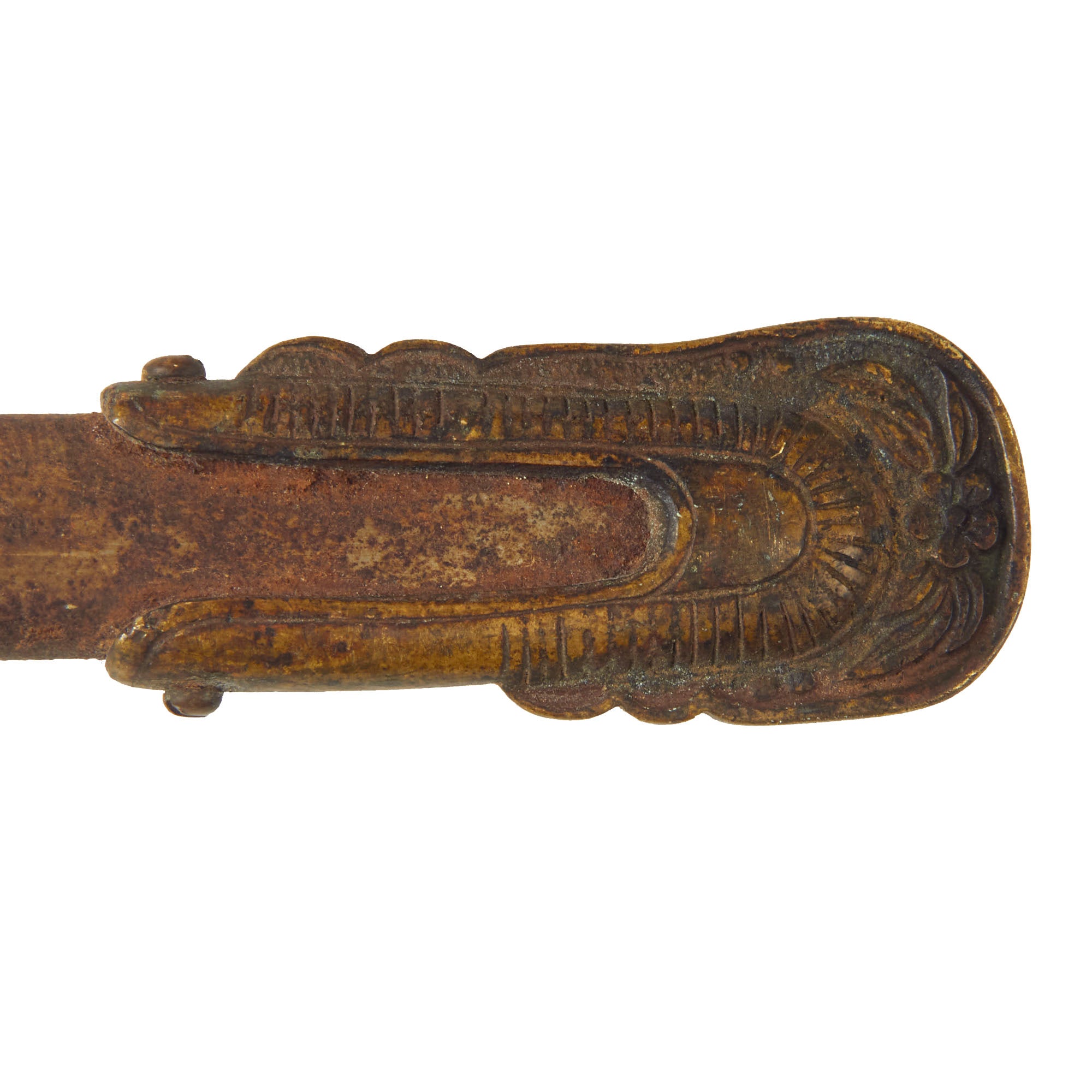 The Sword hilt is brass, with the handle having a leather wrapped wood handle with only indentations of the wire wrap still present. Unfortunately the knuckle guard is bent and warped. Steel scabbard has a pleasing, dark gray/brown patina and is adorned with two brass mounts and a brass drag; the brass throat is still present. Both mounts exhibit a floral display. The top mount sports two rings while the lower mount has only one. The brass drag features a bold star on one side and a set of draped flags on the other. Both sword mounts and the drag are tight. Some of the plating is still present on the scabbard and there are no dents or damage present that we can see other than heavy surface rust.
