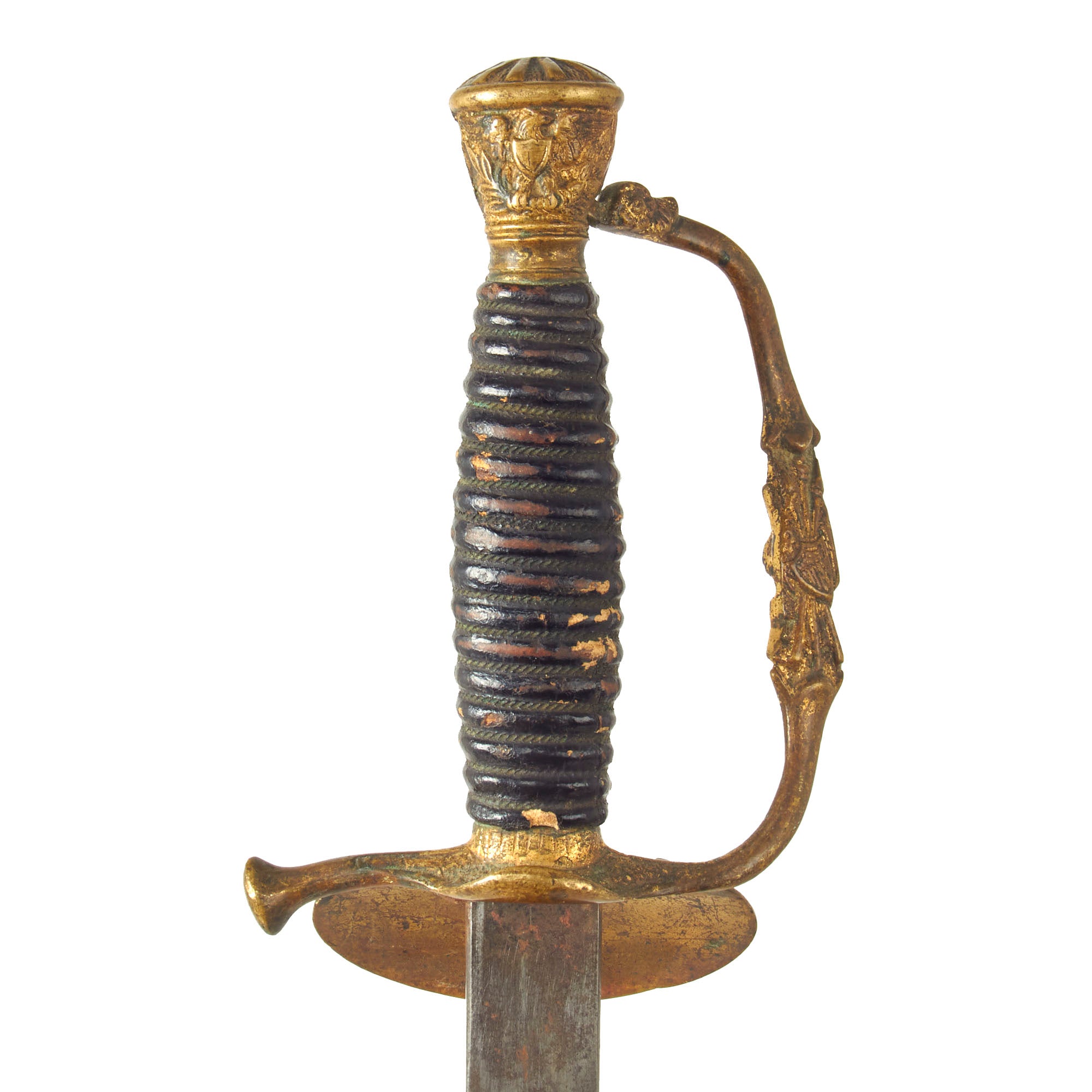 This post-war M1860 sword specimen is an edged weapon that was designed mostly for ceremonial use. The straight, double-edged steel blade measures 31” long and features a diamond-shaped cross section. Blade is embellished on both sides with extremely faint etched foliate and a military panoply of arms. Blade is semi-bright with scattered age discoloration spots and oxidation.