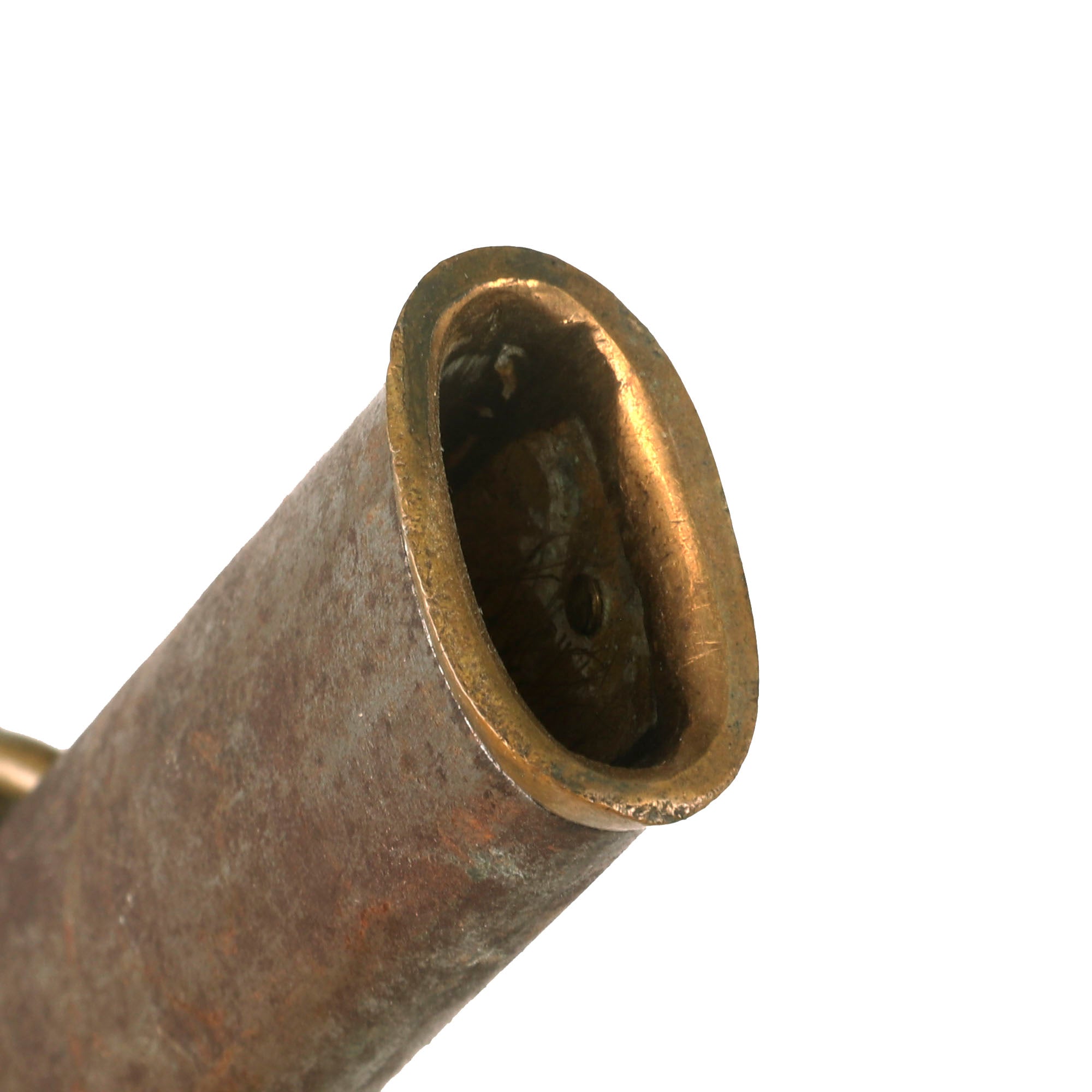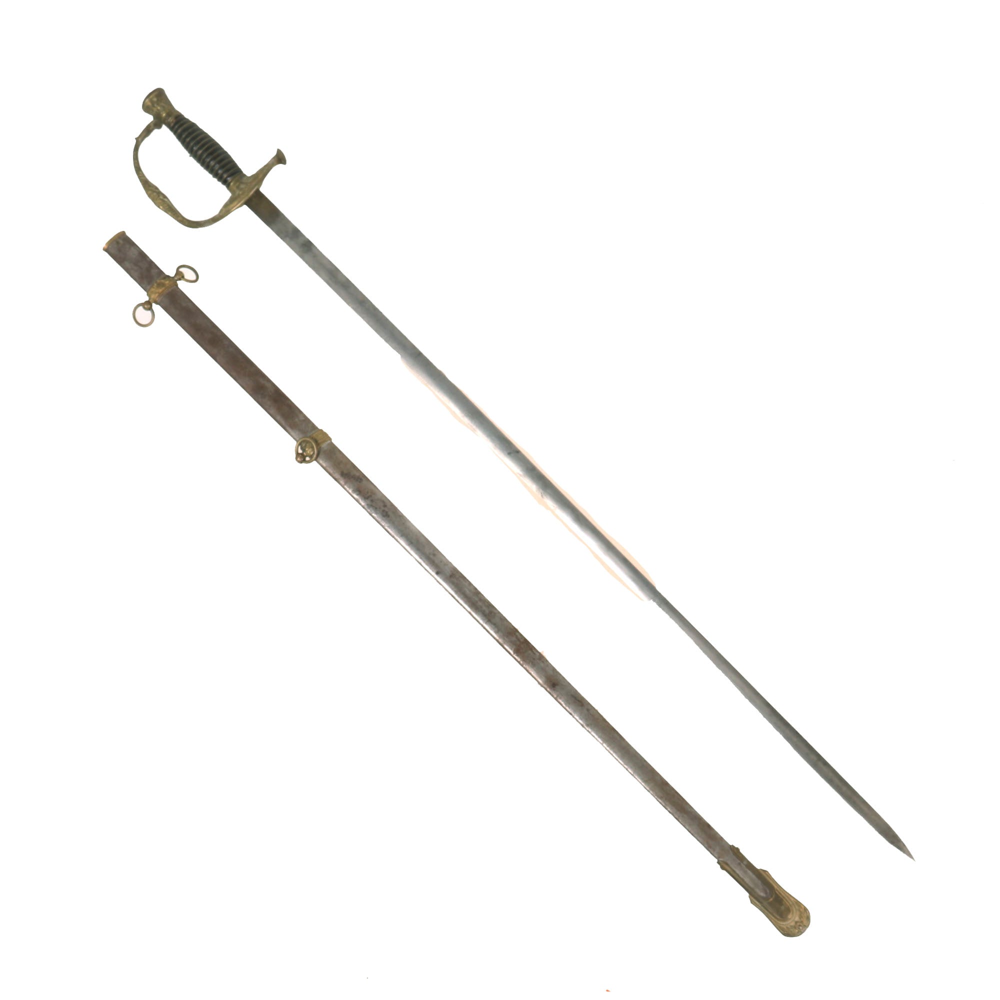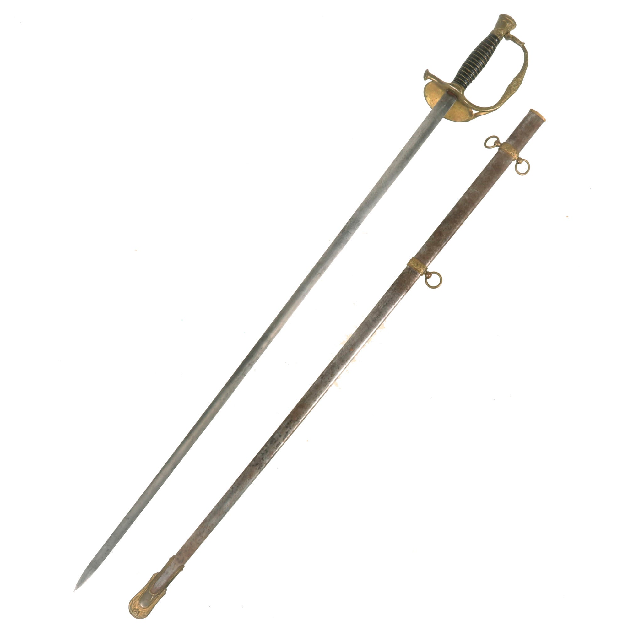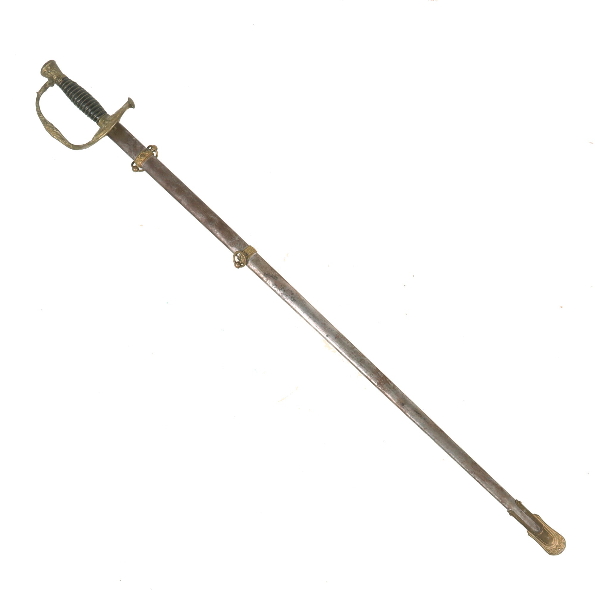 The Sword hilt is brass, with the handle having a leather wrapped wood handle with the wire wrap still present. Steel scabbard has a pleasing, dark gray/brown patina and is adorned with two brass mounts and a brass drag; the brass throat is still present. Both mounts exhibit a floral display. The top mount sports two rings while the lower mount has only one. The brass drag features a bold star on one side and a set of draped flags on the other. Both sword mounts and the drag are tight. Some of the plating is still present on the scabbard and there are no dents or damage present that we can see other than heavy surface rust.