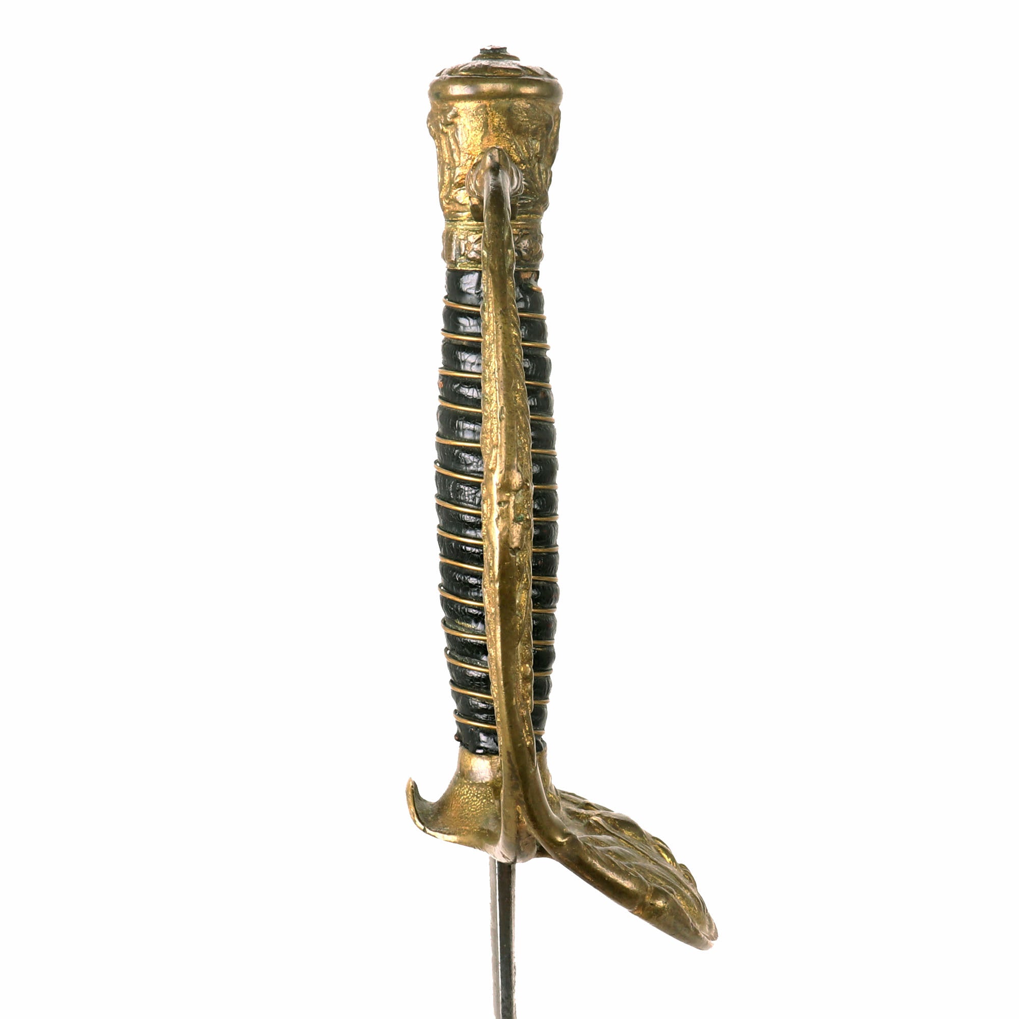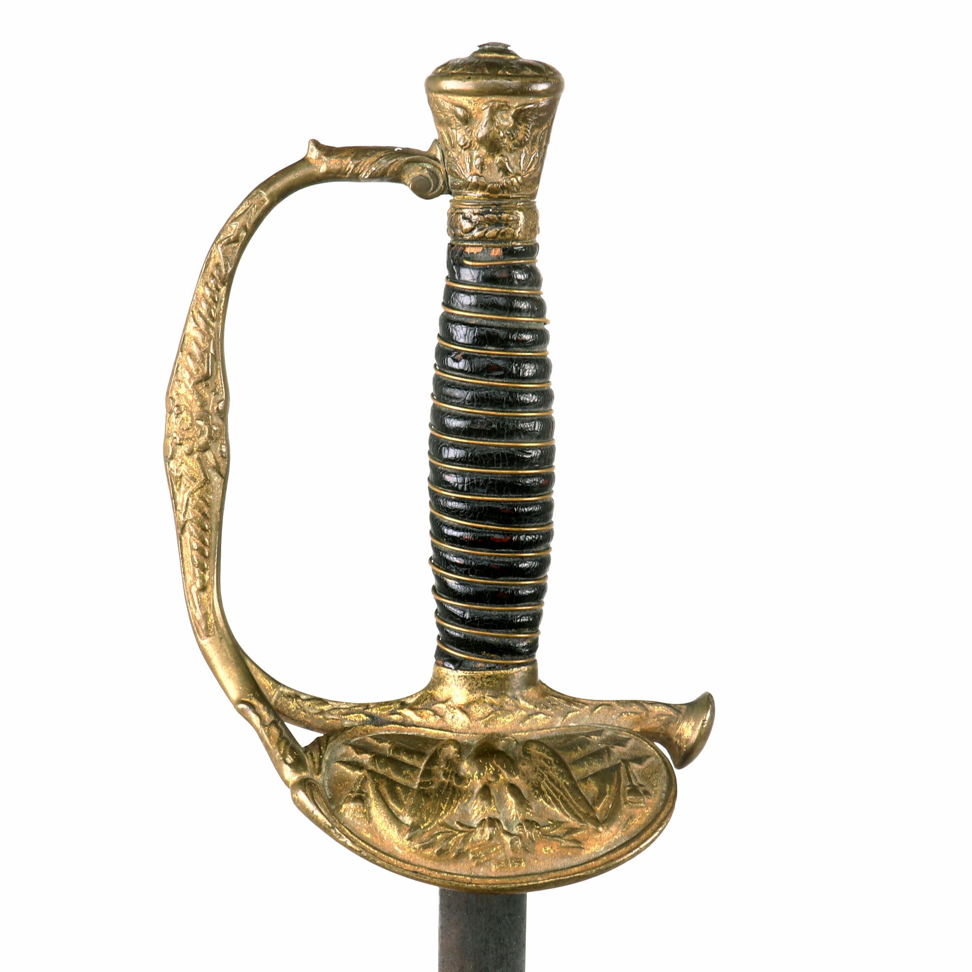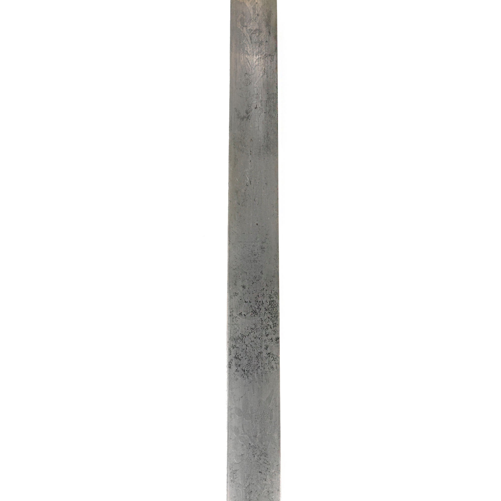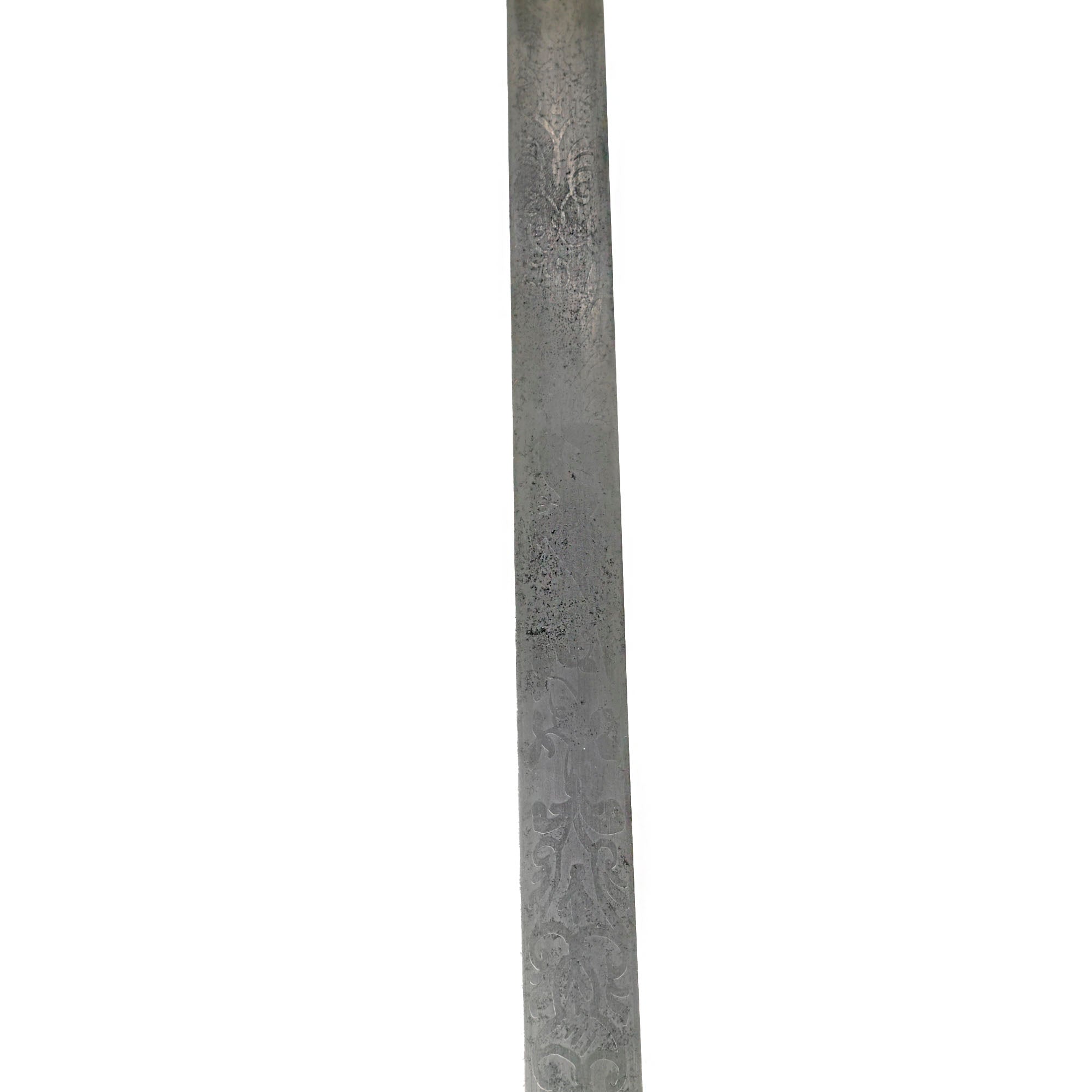 This officer's sword was adopted on August 28, 1860 acting upon the officer who would rarely if ever be called upon to wield a sword in battle. It was not mandatory until after the close of the Civil War, however in 1872, this sword became mandatory for all officers except medical staff, paymasters, mounted officers of infantry, cavalry & light artillery. Blade is embellished on both sides with an extremely faint etched foliate and an American Eagle. Blade is semi-bright with scattered age discoloration spots.