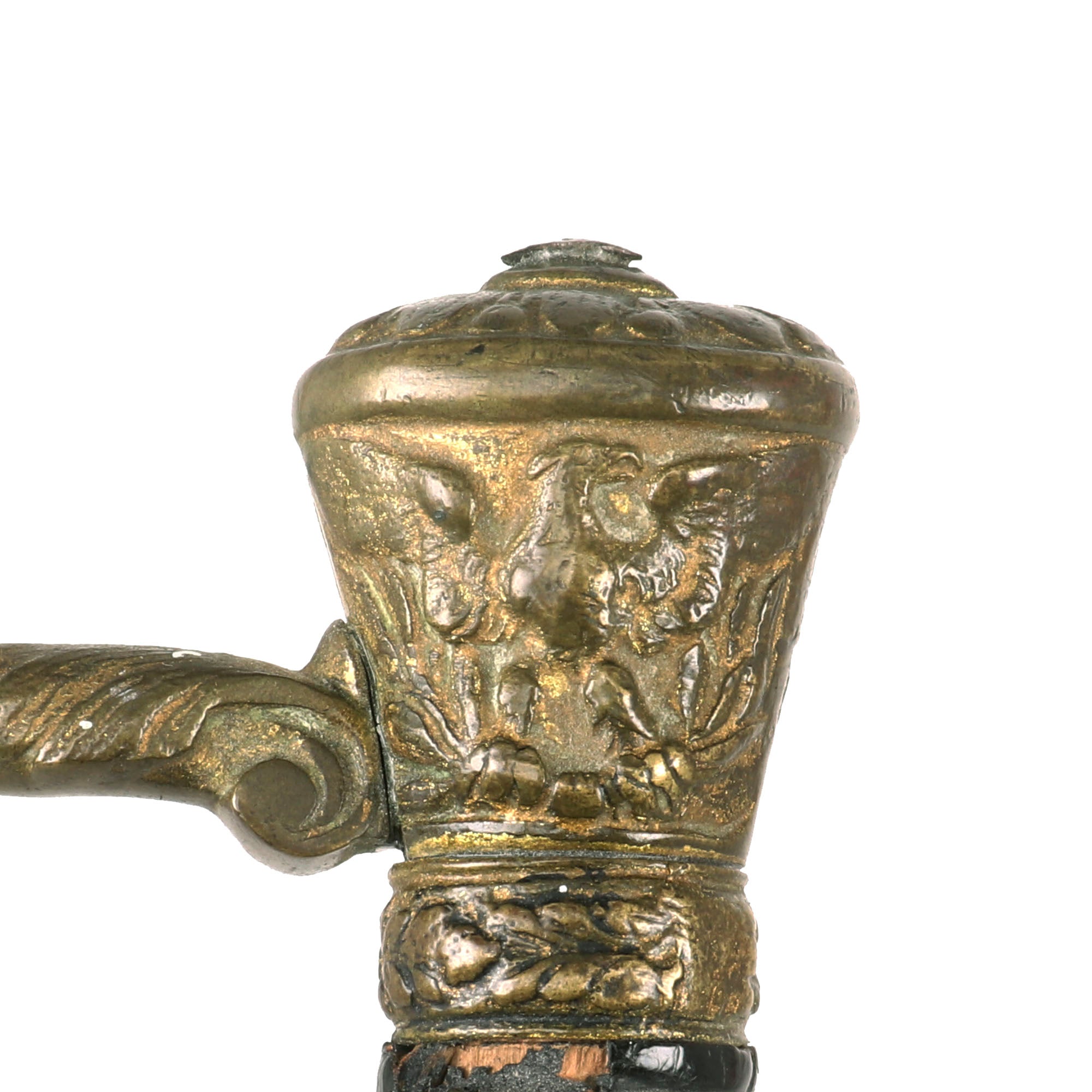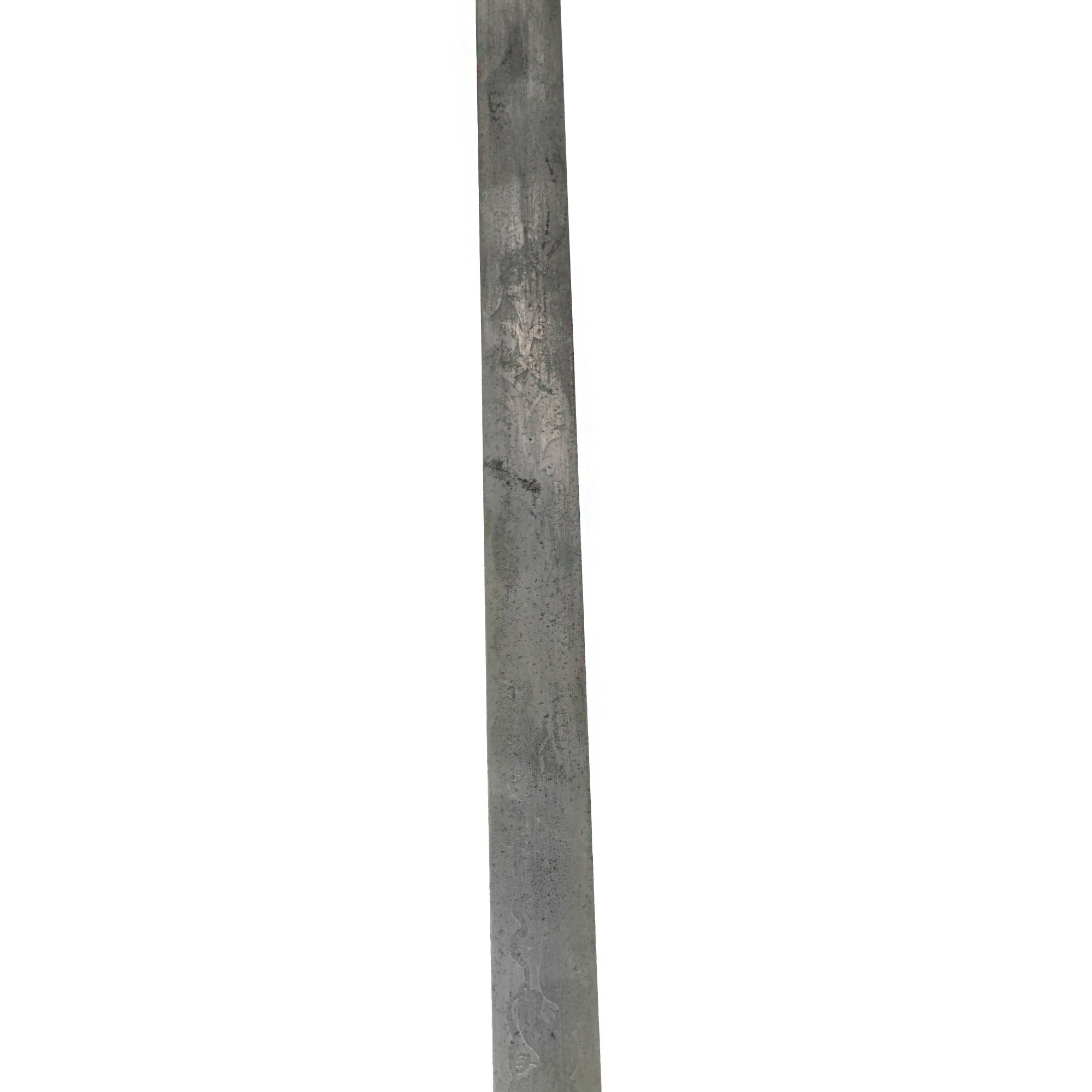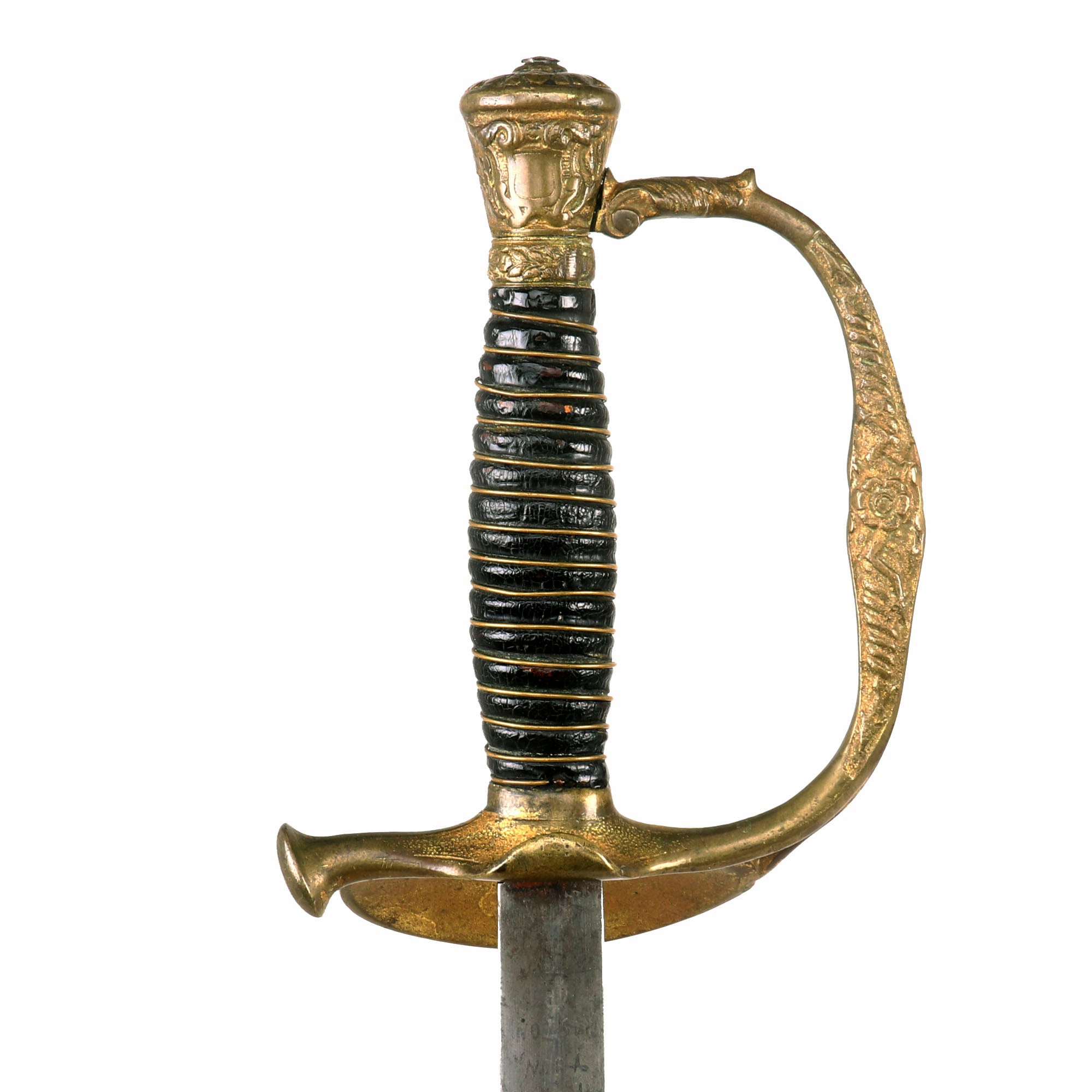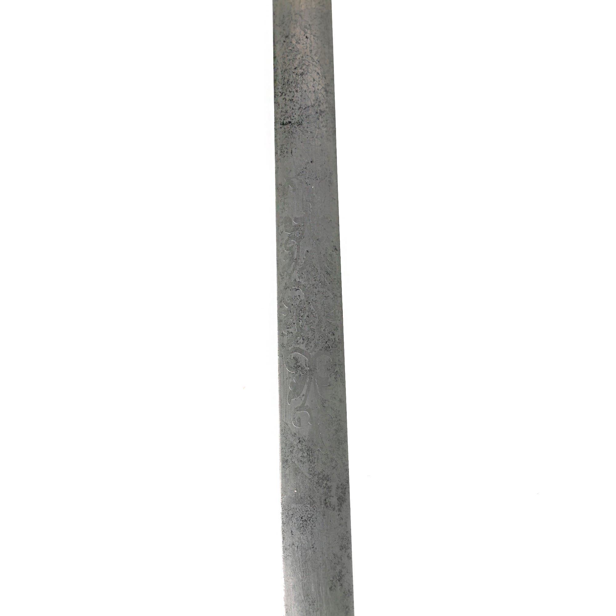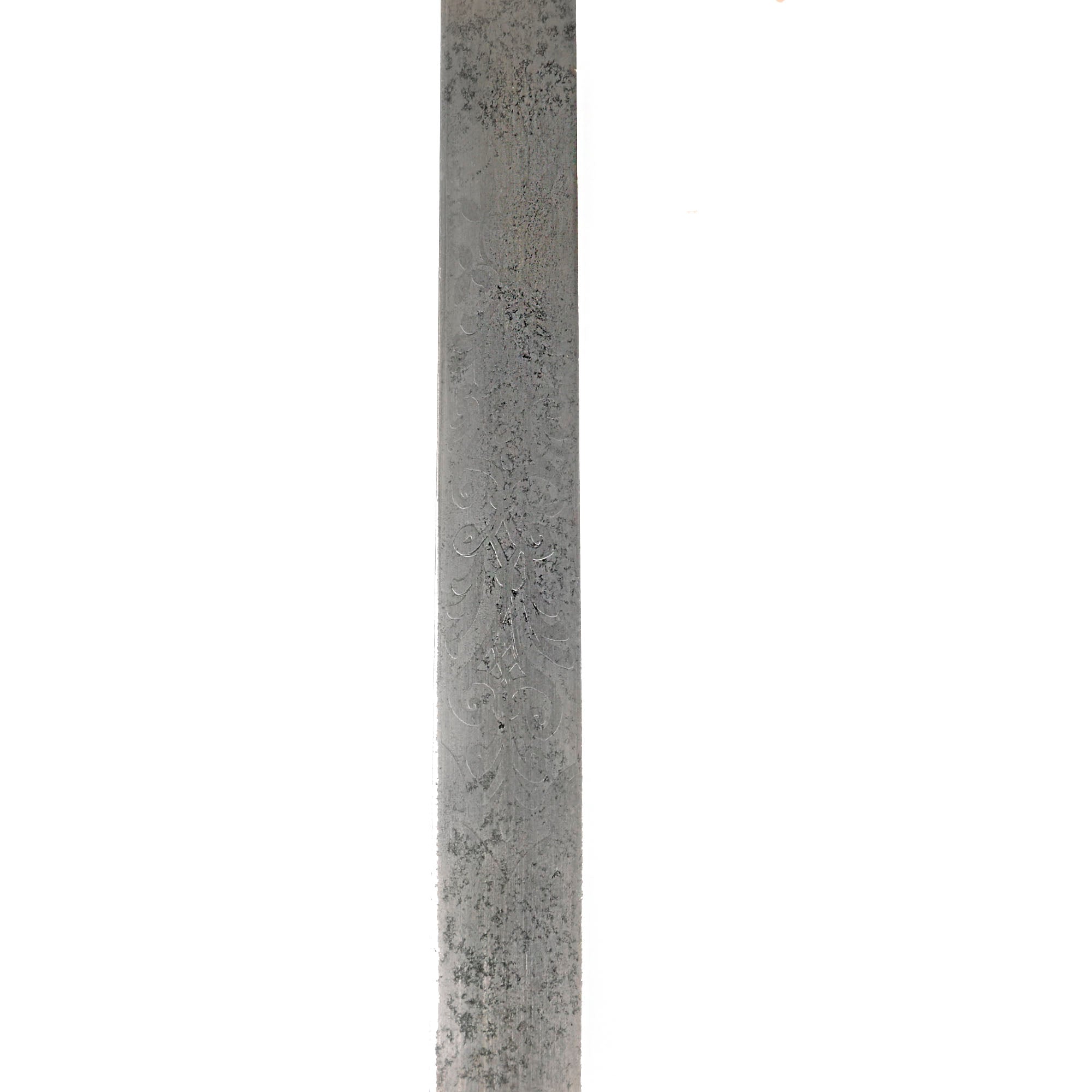 This officer's sword was adopted on August 28, 1860 acting upon the officer who would rarely if ever be called upon to wield a sword in battle. It was not mandatory until after the close of the Civil War, however in 1872, this sword became mandatory for all officers except medical staff, paymasters, mounted officers of infantry, cavalry & light artillery. Blade is embellished on both sides with an extremely faint etched foliate and an American Eagle. Blade is semi-bright with scattered age discoloration spots.