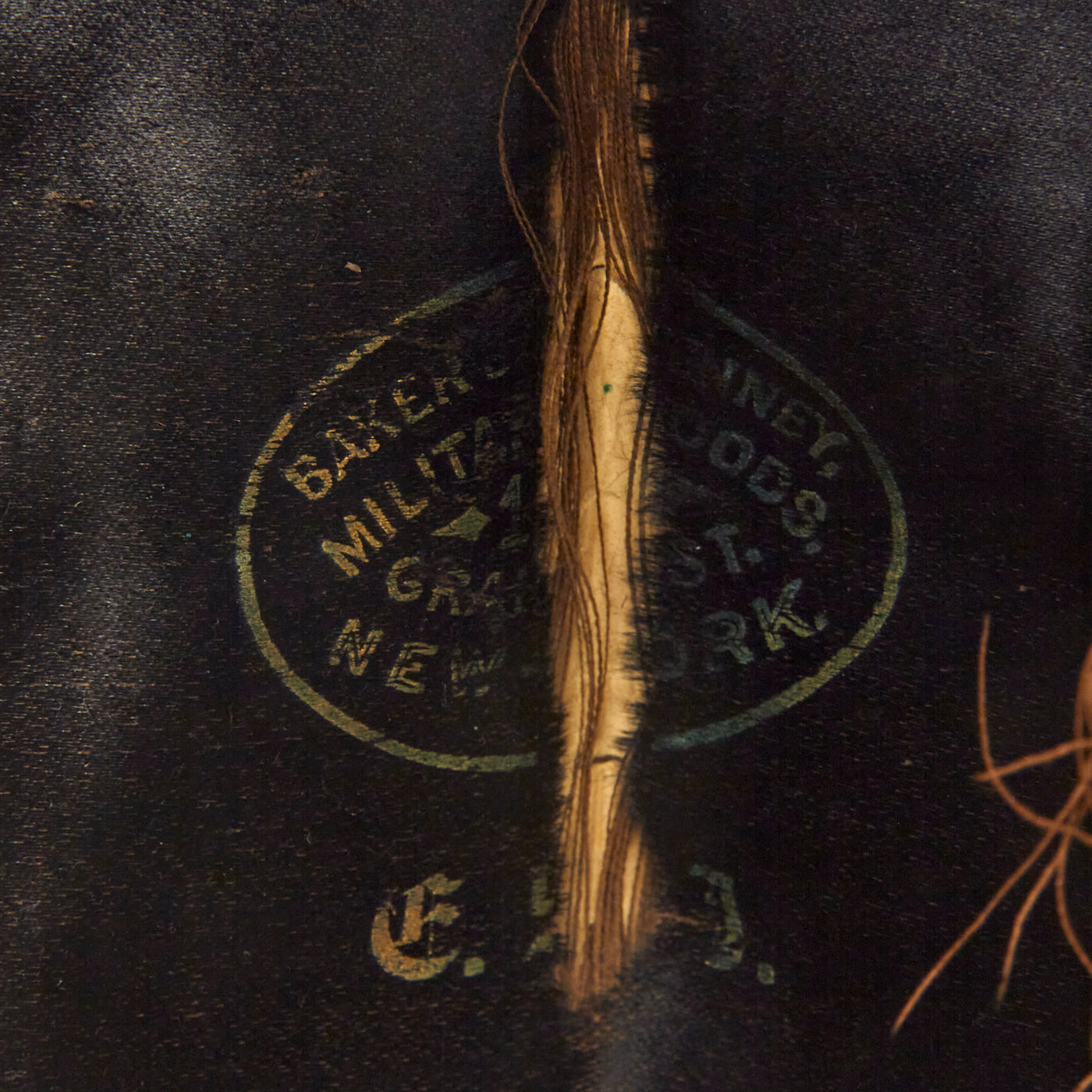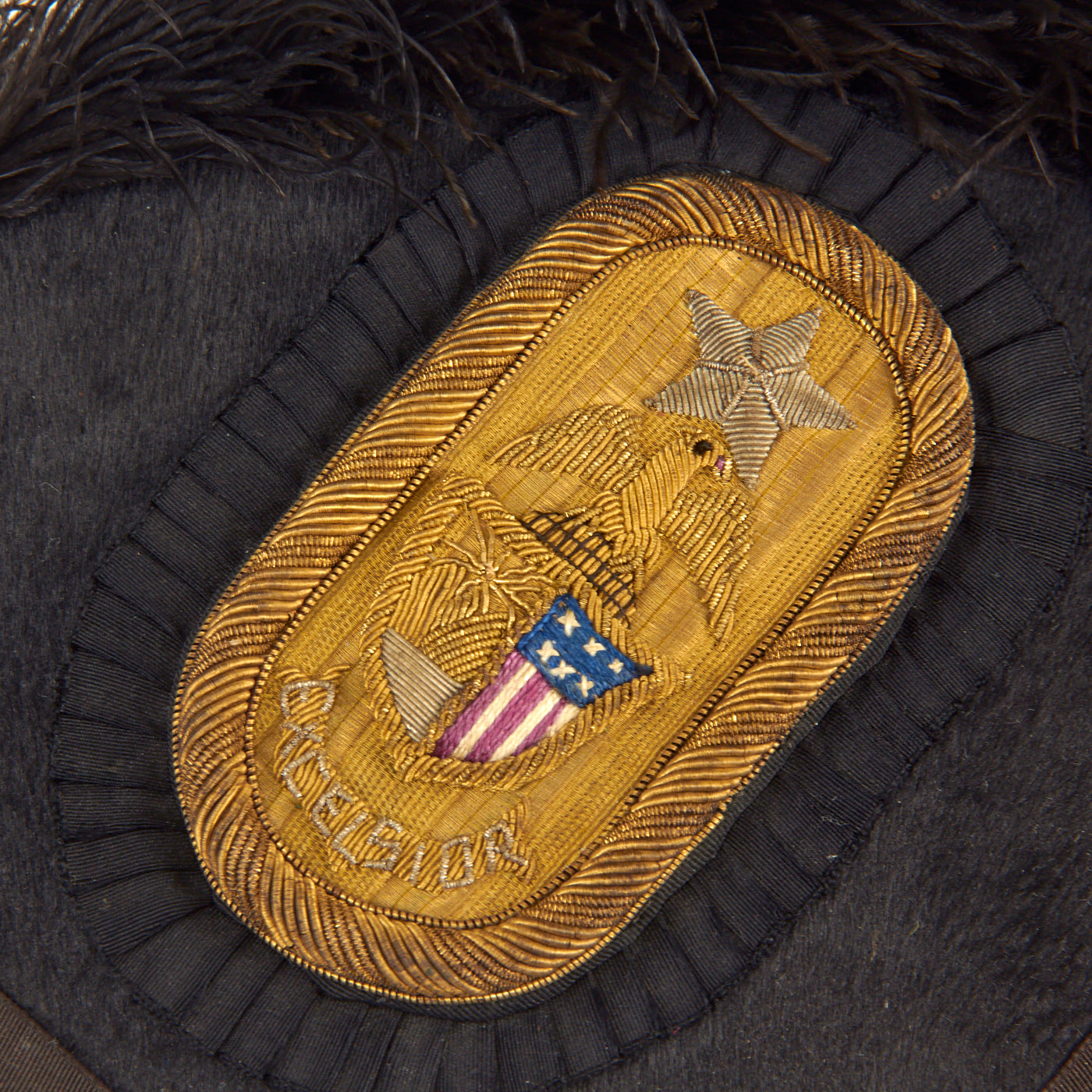 The hat features a gilt cockade with gilt wire bullion embroidered spread wing federal eagle. Of note is that the Federal Shield on the body of the bullion eagle is hand embroidered in full color (normally the shield is solid gold bullion). These Caps were universal, with the only distinction being the branch of service button affixed to the cockade on the right side of the cap or the insignia much like this one, which is the standard New York “Excelsior” crest.