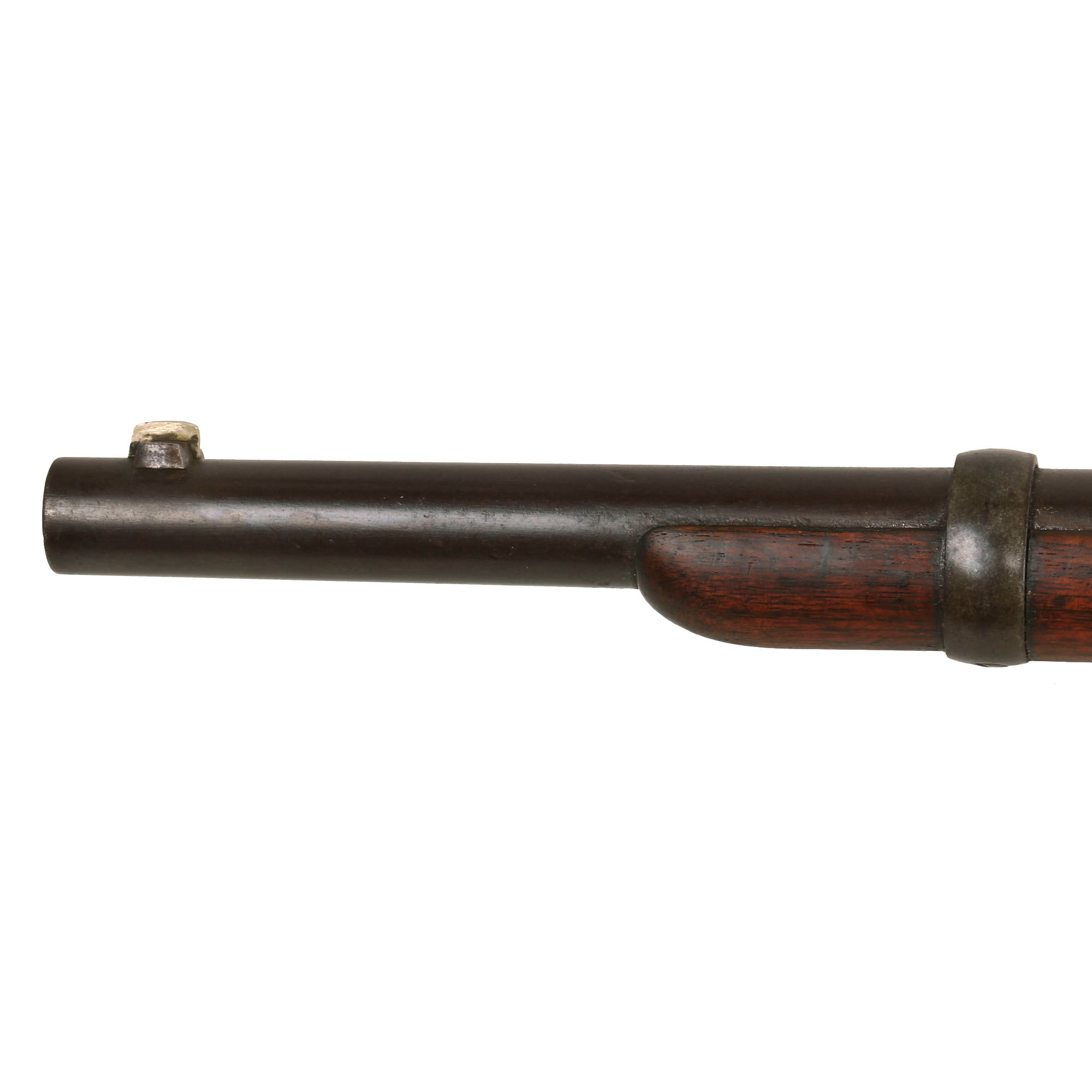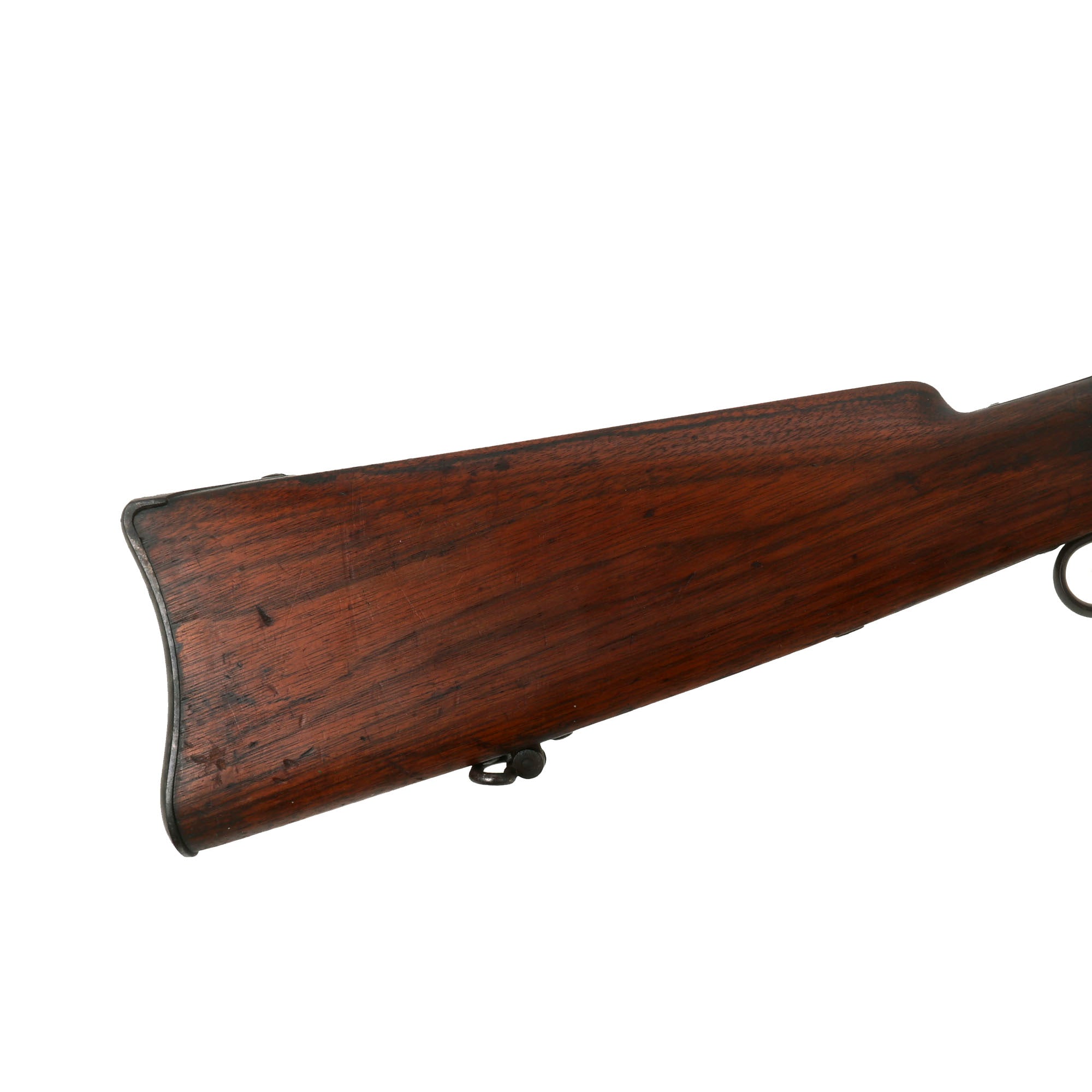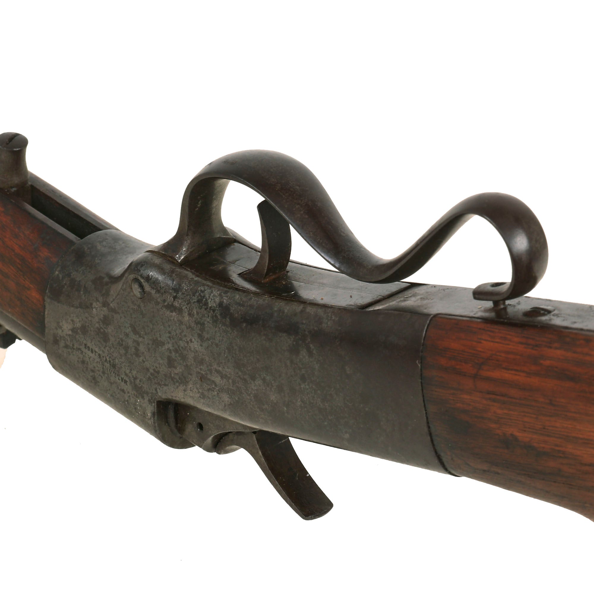 Original Item: One Only. The Ballard is a single-shot, breech loading firearm used late during the Civil War. The .44 caliber, percussion rifle was invented and patented by Charles H. Ballard of Worcester, Mass in November 1861. These were made by 5 different contractors, however there is not one marked on this example. It also is in a long rifle configuration, which we have not had before. It measures 45 1/4 inches long overall, with a 30 inch round barrel and full length military style stock. This features three barrel bands securing the stock to the barrel, and front and rear sling swivels.