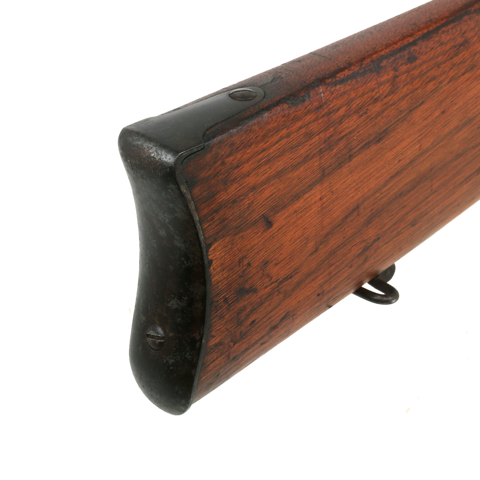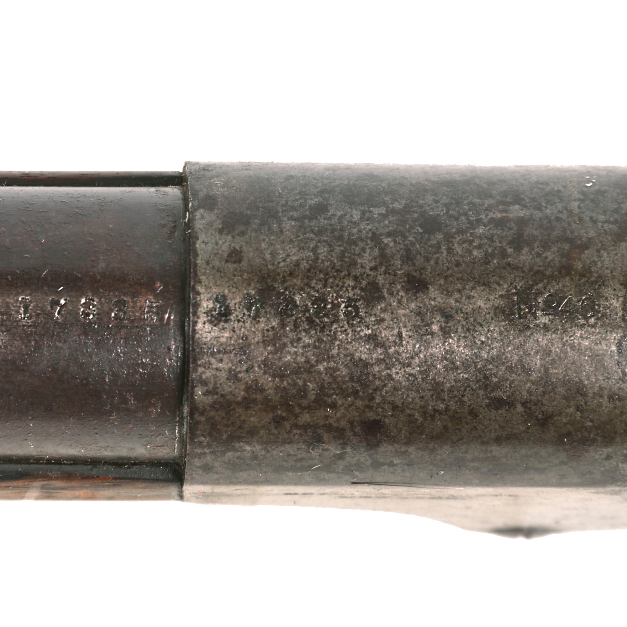 The metal surfaces are in good condition, though the finish is worn, with light peppering over most of the barrel, and a mottled patina on the receiver. The receiver markings are mostly legible, so this example does not appear to have been refinished. The walnut stocks are in very good condition, showing wear from use and age, but no cracks or other damage that we can see. The bore is in very good condition, with clear lands and grooves and a partly bright finish. The lands are shiny, but the grooves are dark with fouling and oxidation, and there is definitely some wear from use. The falling block action cycles correctly, with the manual ejector still fully functional.