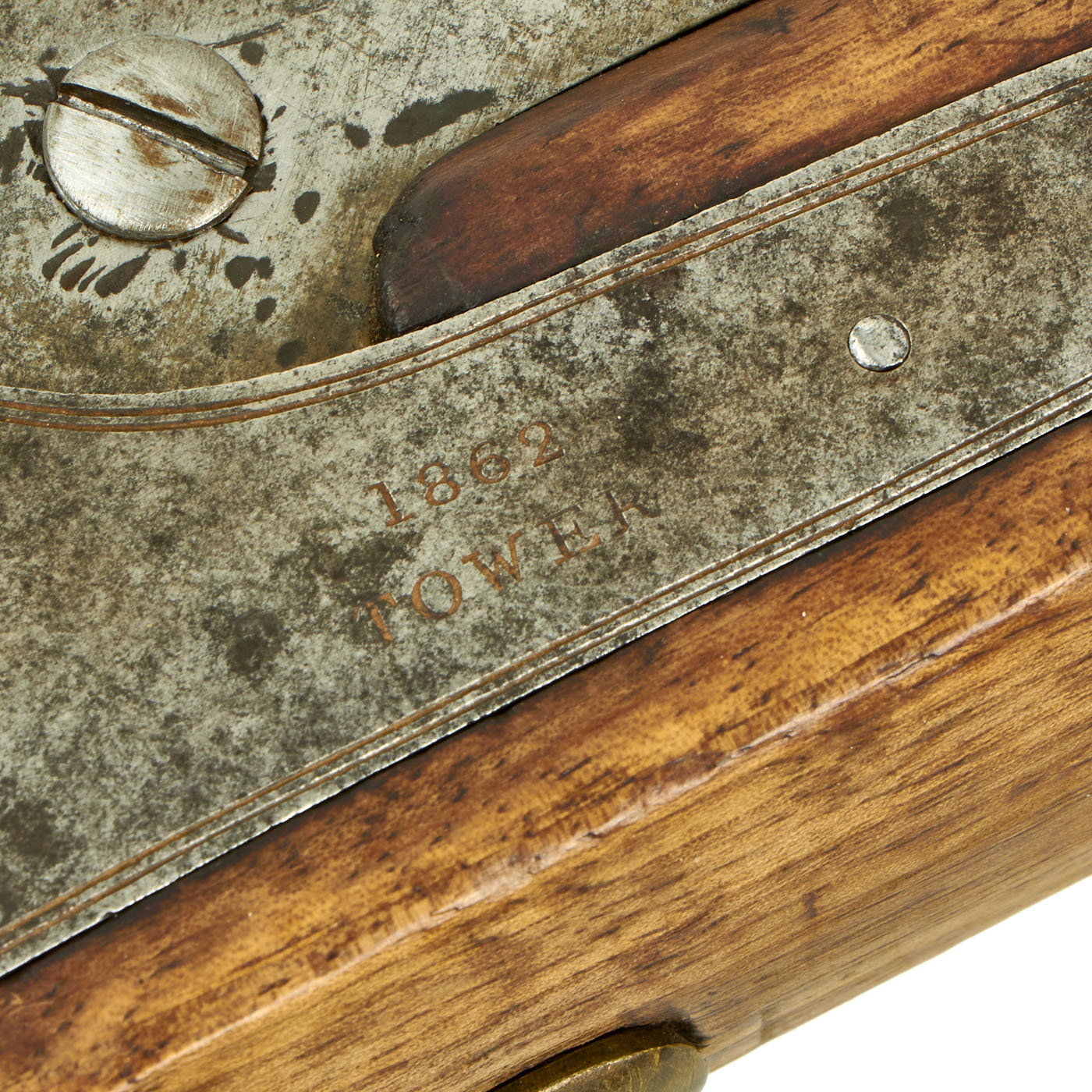 The lock is marked 1862 / TOWER below the cap bolster, and it is marked with a QUEEN'S CROWN to the rear of the hammer. However, there is no "V.R." under the crown. This indicates that this weapon was not intended for a British Military contract but was aimed at the Overseas market, most specifically the United States, who were embroiled in its most terrible Civil War. As an Export Market destined weapon it should have the right hand side of the butt stamped with a roundel stating "BIRMINGHAM SMALL ARMS TRADE", however this and other markings are now GONE due to wear.
