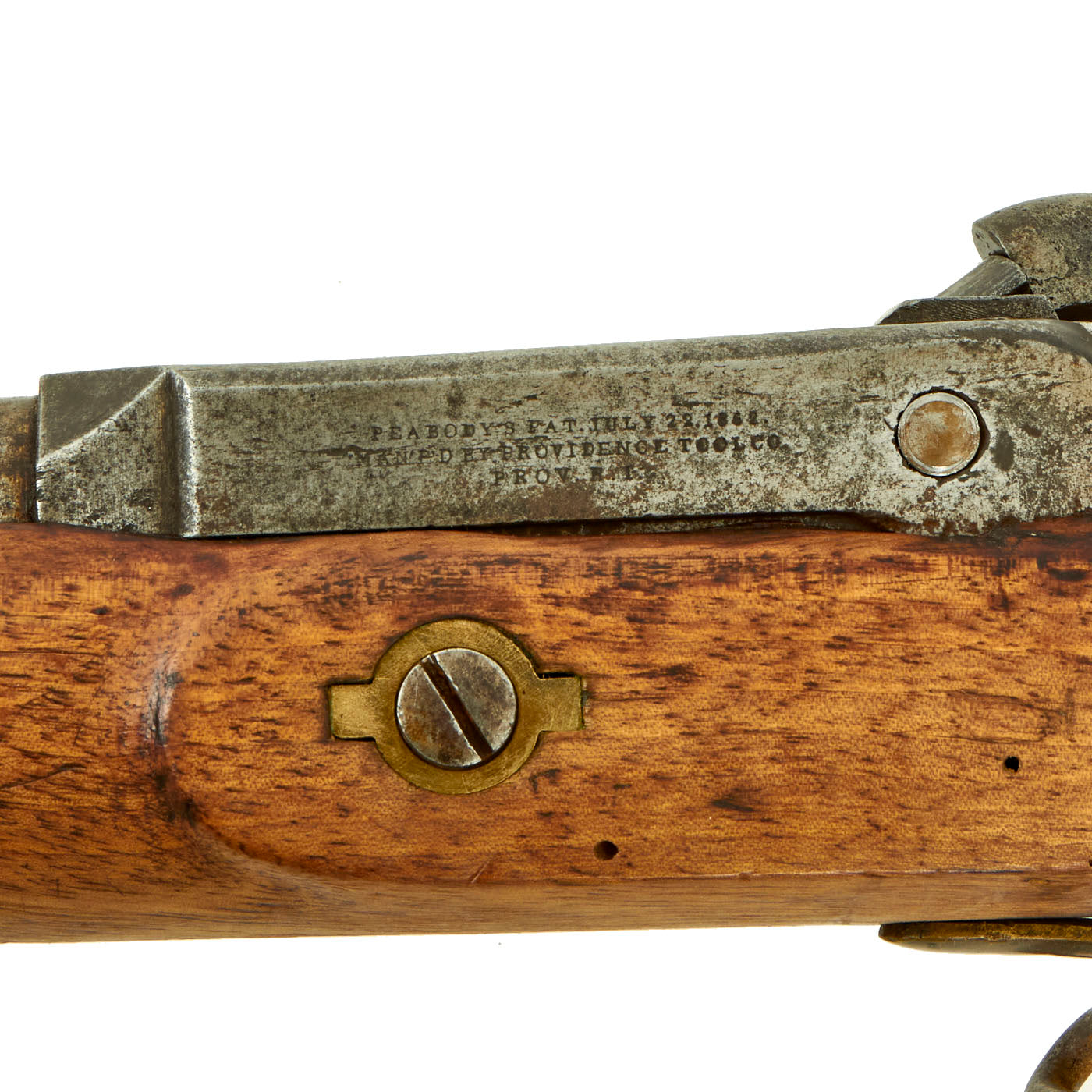 It was converted using a Peabody Patent breech system manufactured by Providence Tool Co. It is not clear whether they performed the conversion, or whether it was done using parts they supplied. The left side of the receiver still bears the original markings: