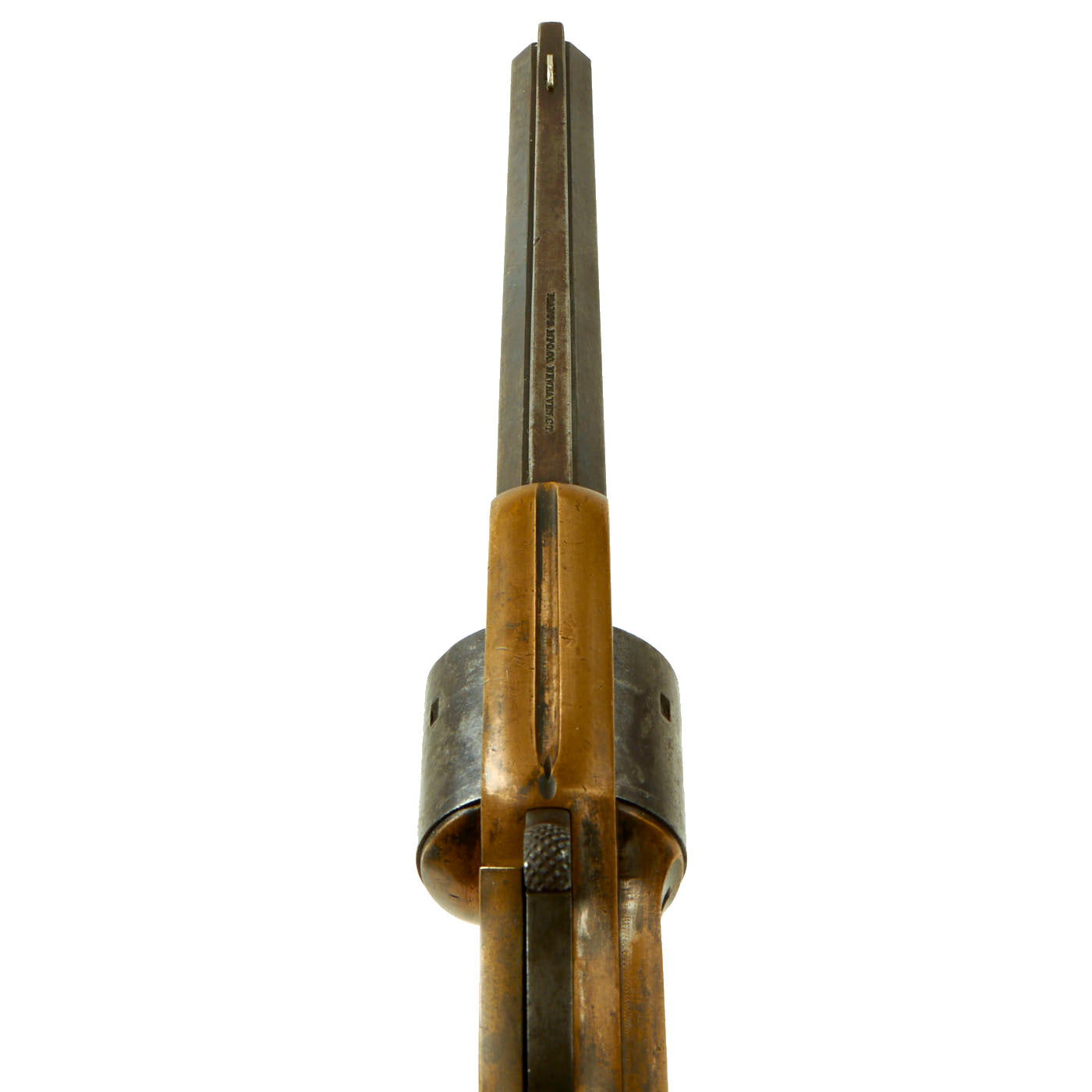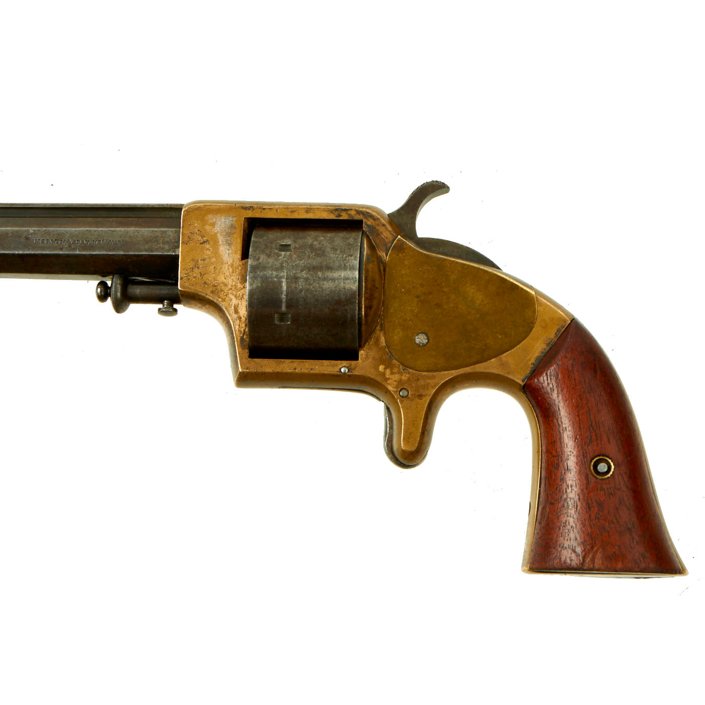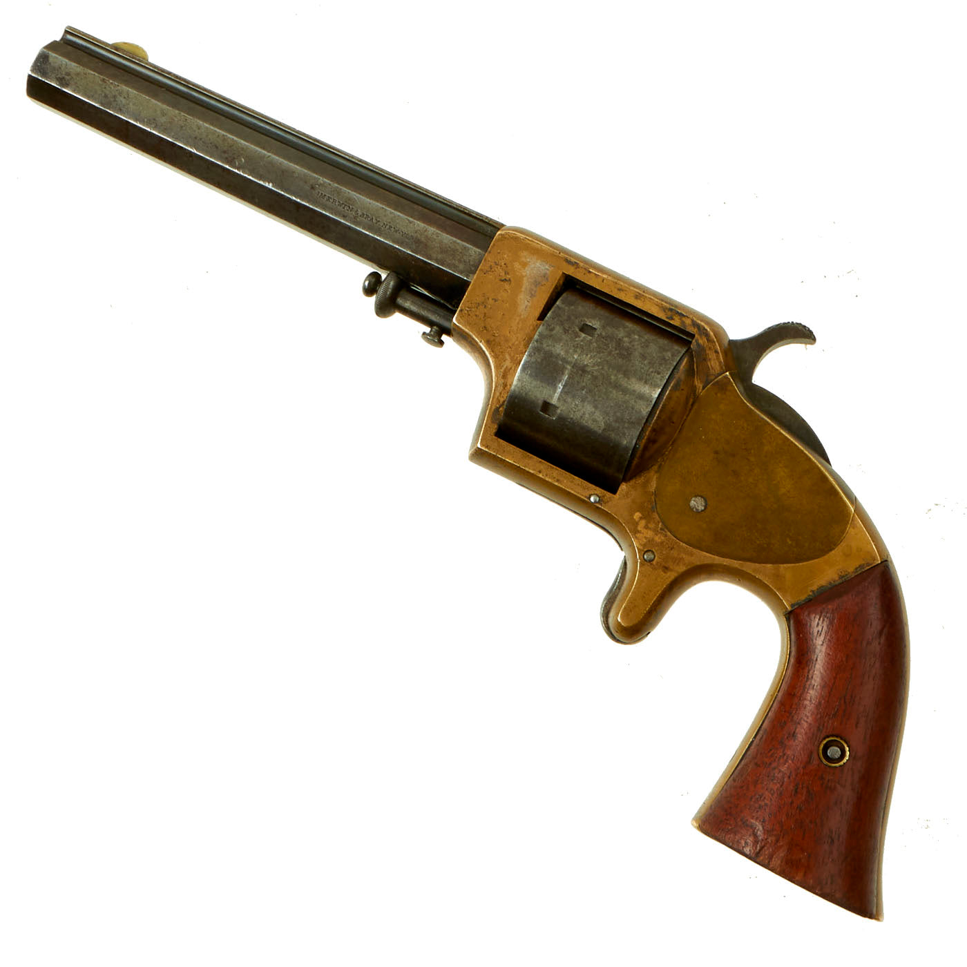 Original Item: Only One Available. Starting life between 1863 and 1873 this is a very rare unconverted Plant's Manufacturing Company CUP-FIRE brass frame revolver. Similar to the "Teat-Fire" design, it was one of several ways developed to produce a brass cartridge revolver that would not infringe on the Patents of Rollin White. Licensed and vigorously protected by SMITH & WESSON, this patent covered the use of a bored through revolver cylinder loaded through the rear with a cartridge. Even though these had already been in use in Europe, there was no U.S. Patent, which White exploited with his patent, which also utilized a box magazine to load the cylinder, and was in reality a totally unworkable design.