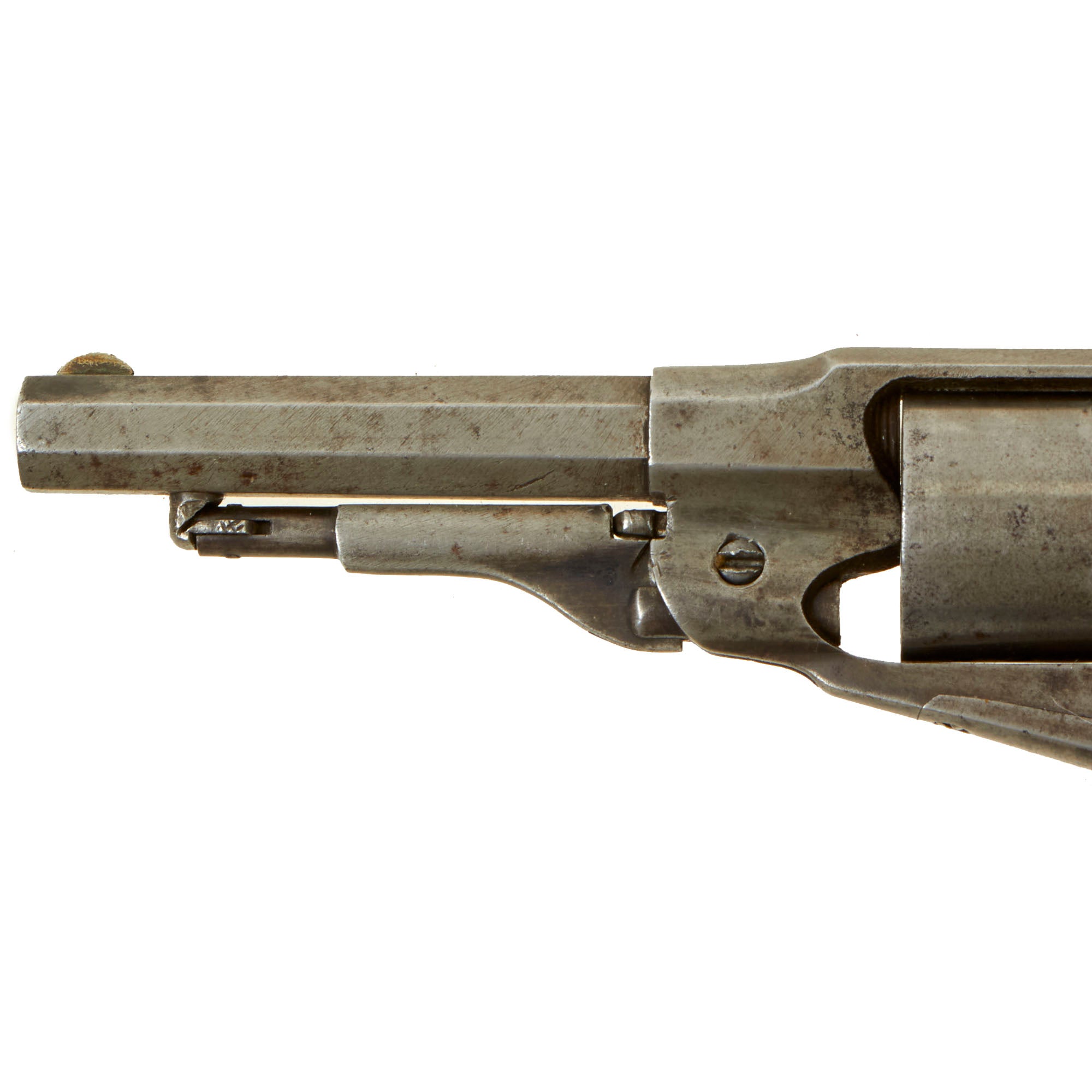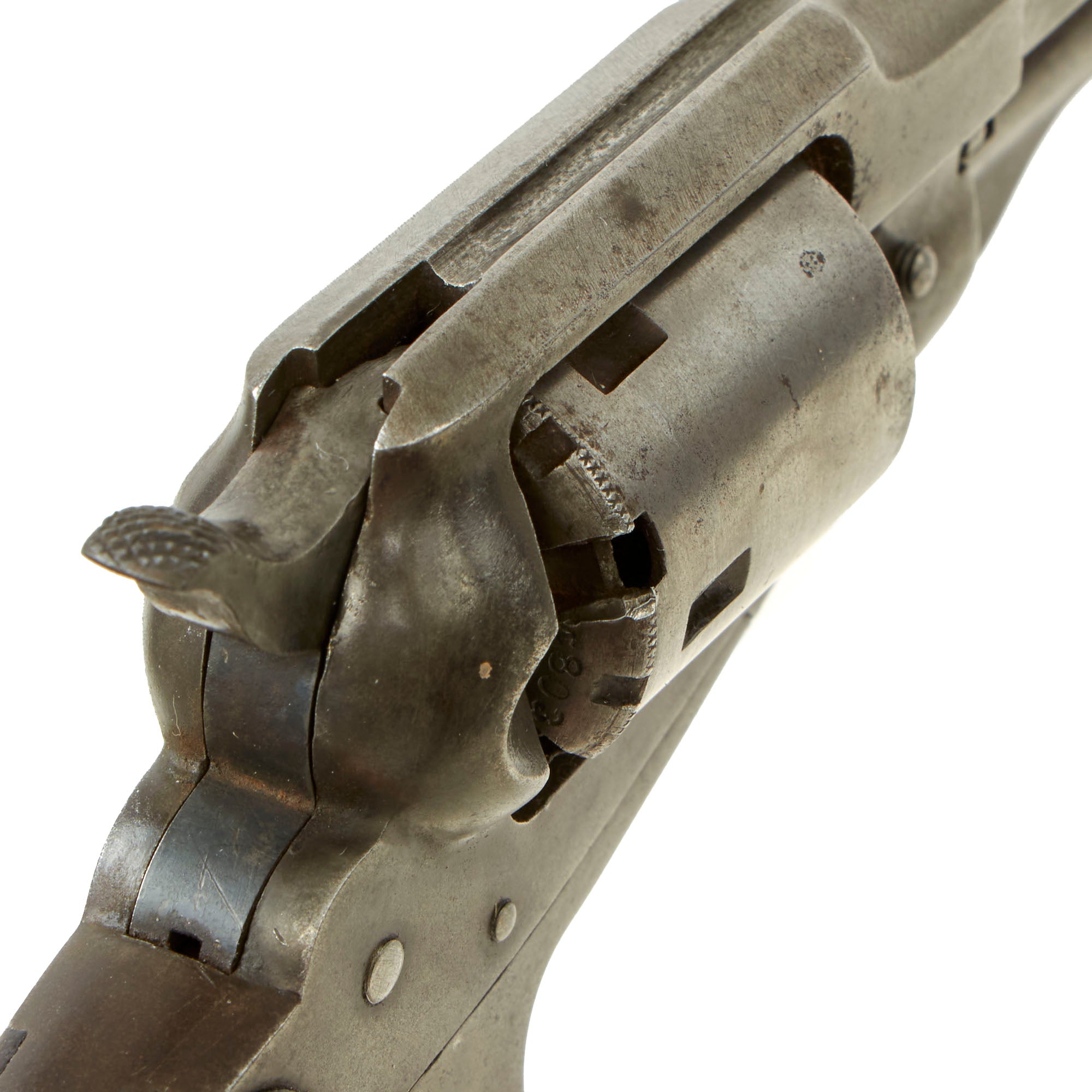 The revolver functions well, with good indexing and a strong dry fire, however the cylinder lockup does show a lot of play. While the cylinder cannot be rotated to another chamber, it can be moved enough to cause misalignment of the chamber and the forcing cone. The bore is in very good condition, showing a mostly bright finish with strong lands and grooves. There is some oxidation in areas, but for a revolver from the black powder era, this is definitely a great bore.