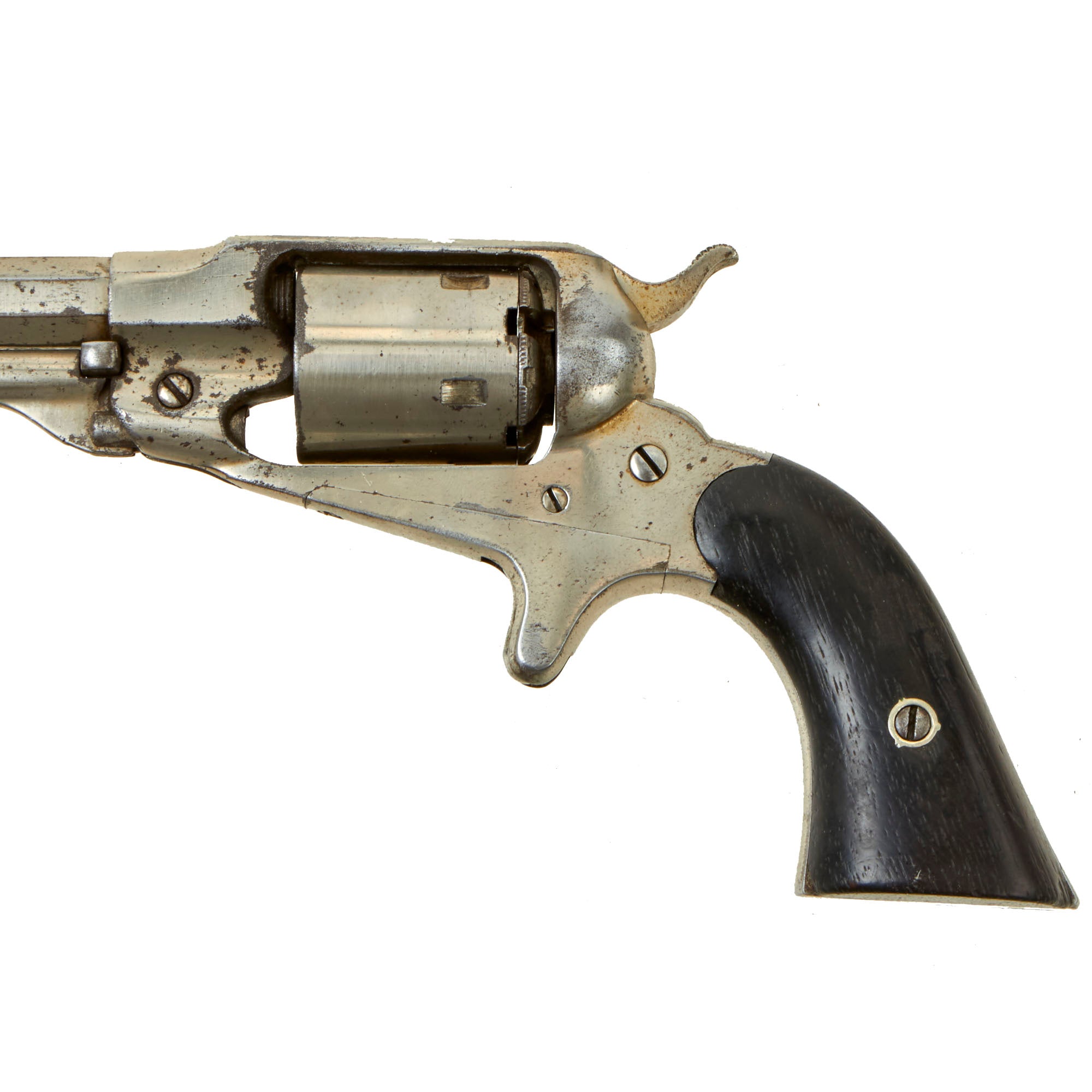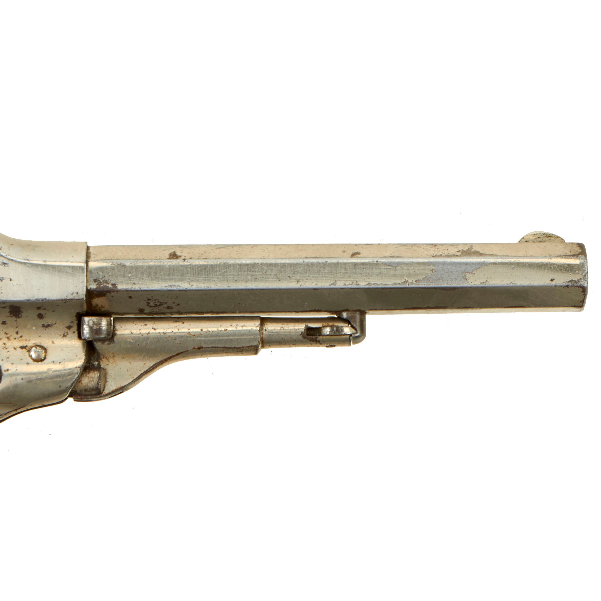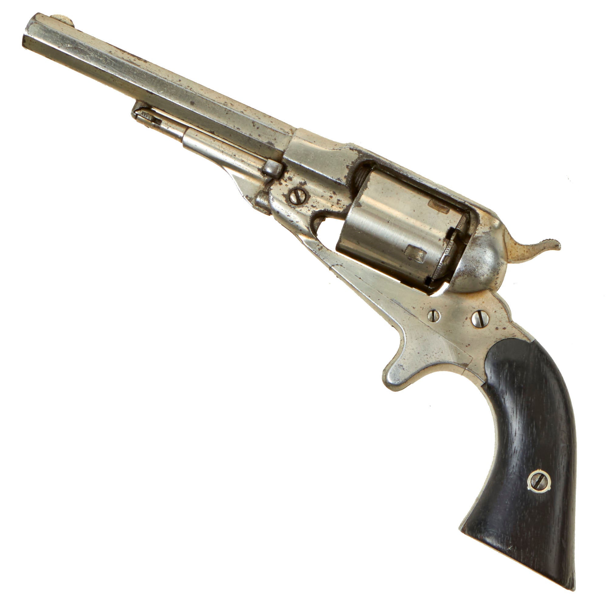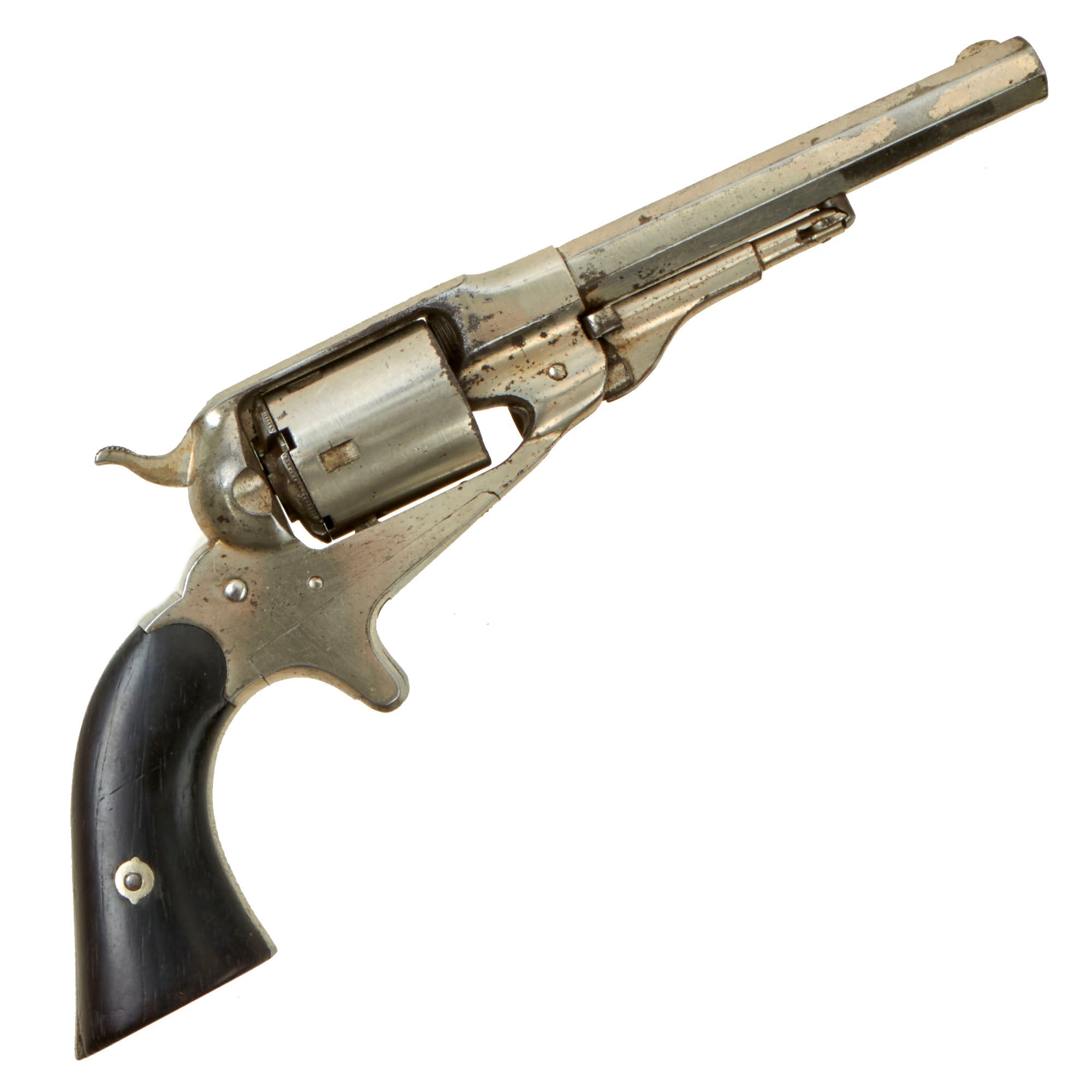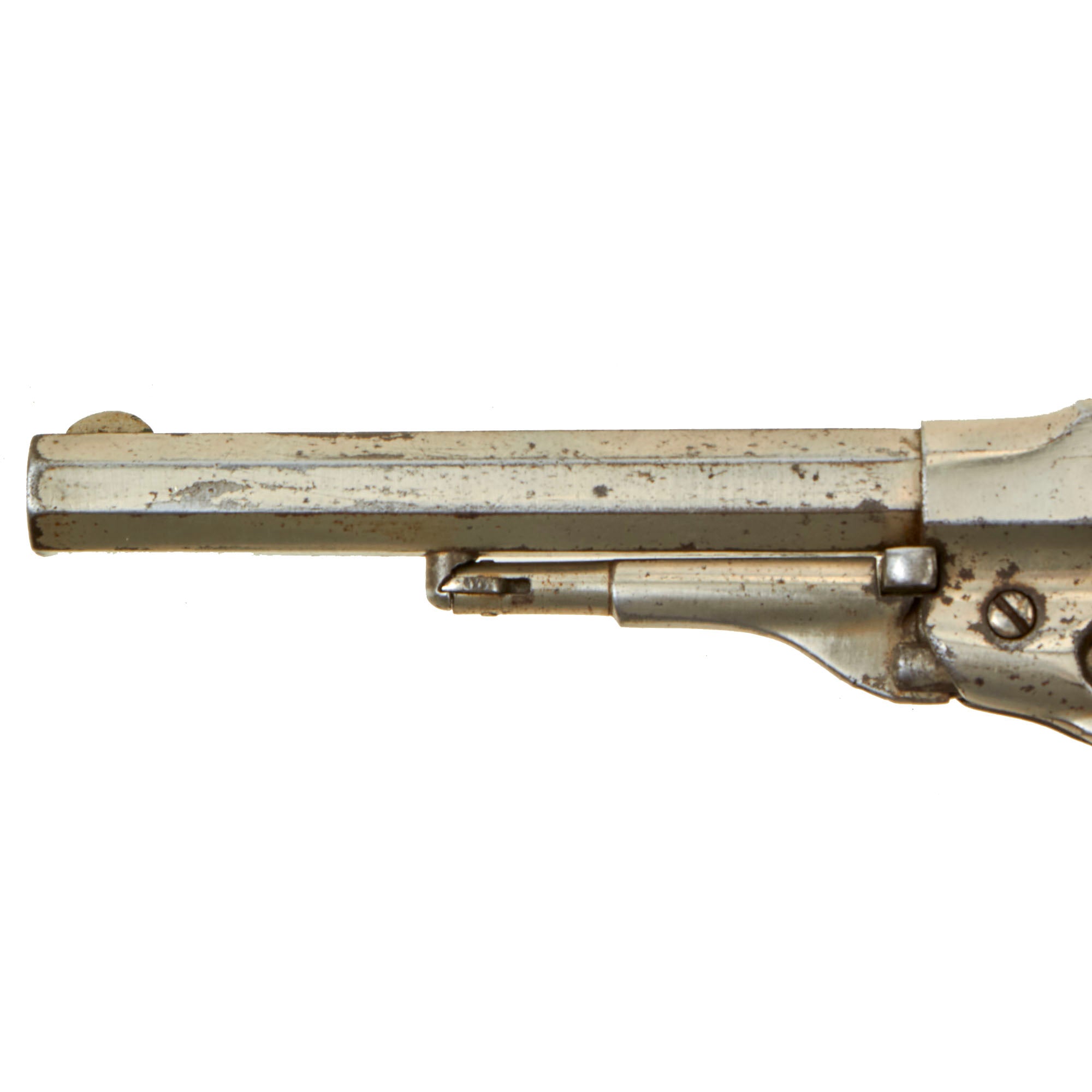 This is a very nice example of a Remington New Model Pocket Revolver, most likely made after the U.S. Civil War, which was later factory converted to take .32 rimfire. This model was introduced by Remington in 1863 to take advantage of the lucrative "pocket revolver" market. Many Union officers liked to keep smaller caliber pocket revolvers as backup for when their larger revolvers ran dry. The model was quite successful, with the Ilion factory producing 25,000 revolvers between 1863 and 1873.
