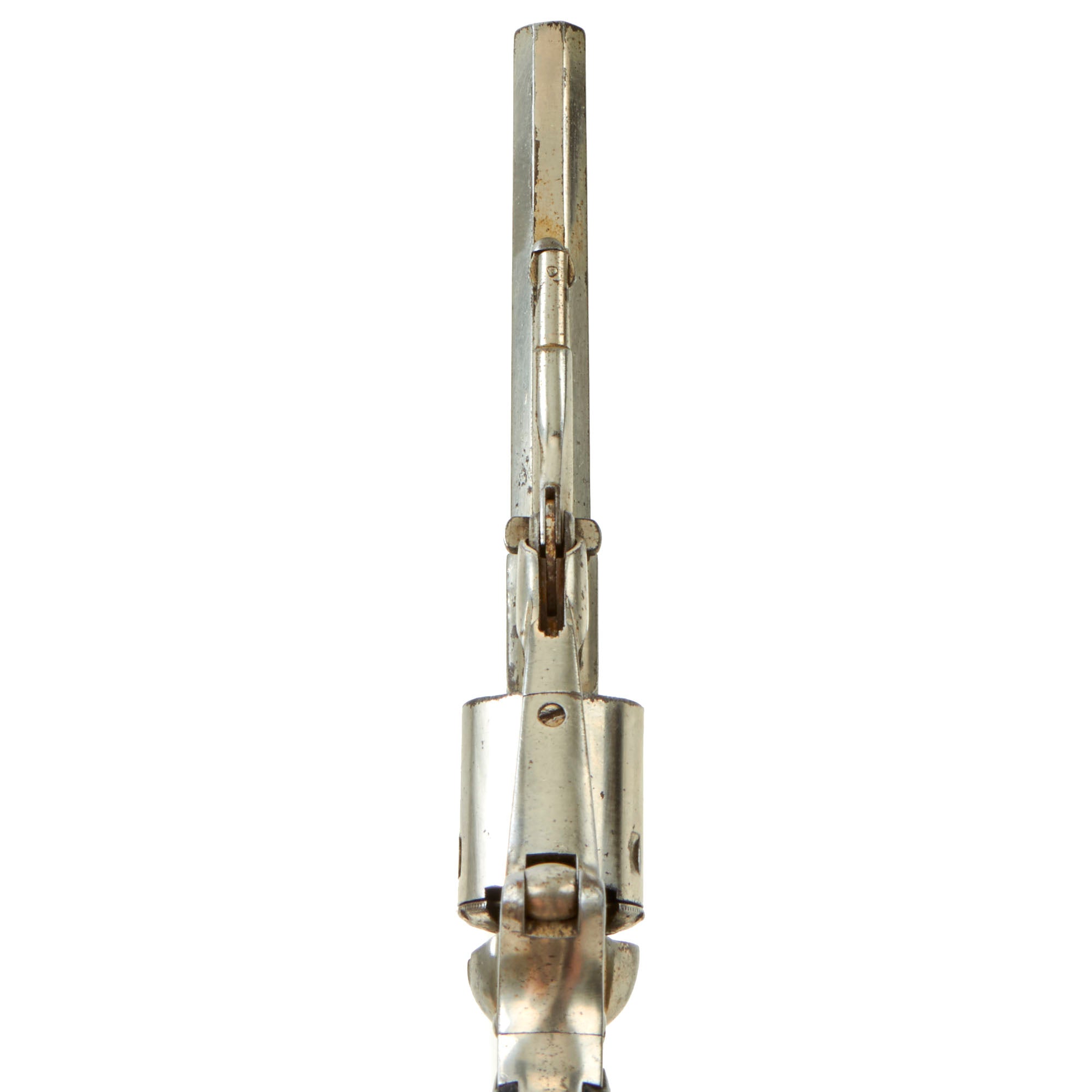 Overall condition is very good, with the nickel-plated finish still very well retained in most areas. There definitely are areas of missing plating near the cylinder, especially at the front, and also on the edges of the barrel facets. There are some areas of light rust specking, but overall this has the look of a well cared for revolver. It has a very nice set of wooden grips, which show light wear from service. They have lost much of the original "piano varnish" finish, and are quite dark, so they could be made from ebony, not walnut.
