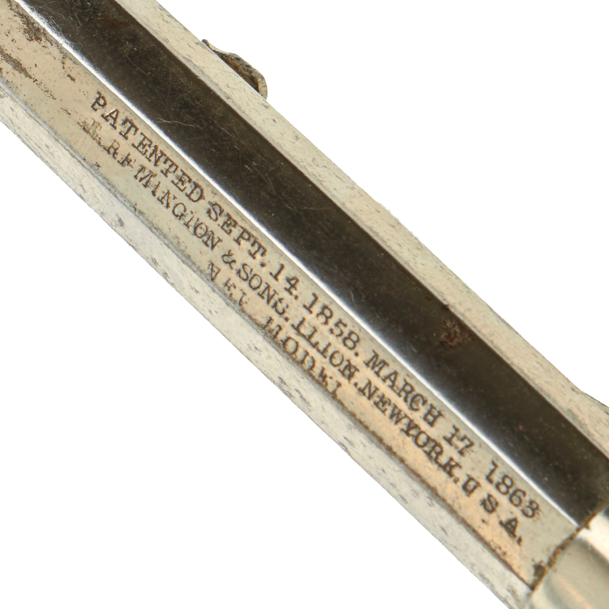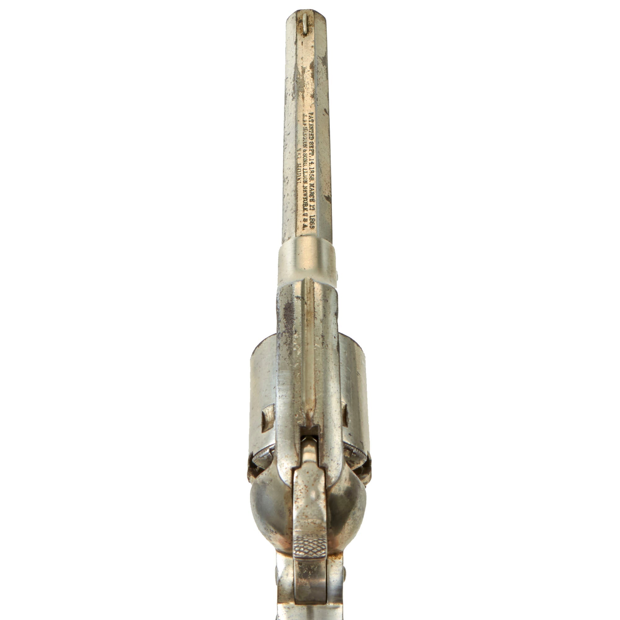 The design is typical compared to other makers, 5 shot single action with a 4 1/2 inch octagonal barrel. It has "spur trigger", and a cylinder arbor pin that pulls forward, allowing the cylinder to be removed easily, which aided in early cartridge conversions. This example is now nickel plated, however we do not know if this is the original finish, or whether it was refinished at the factory. This revolver has matching serial number 25765 appearing on the underside of the barrel and on the frame under the grip. The top of the octagonal barrel still shows the original markings clearly: