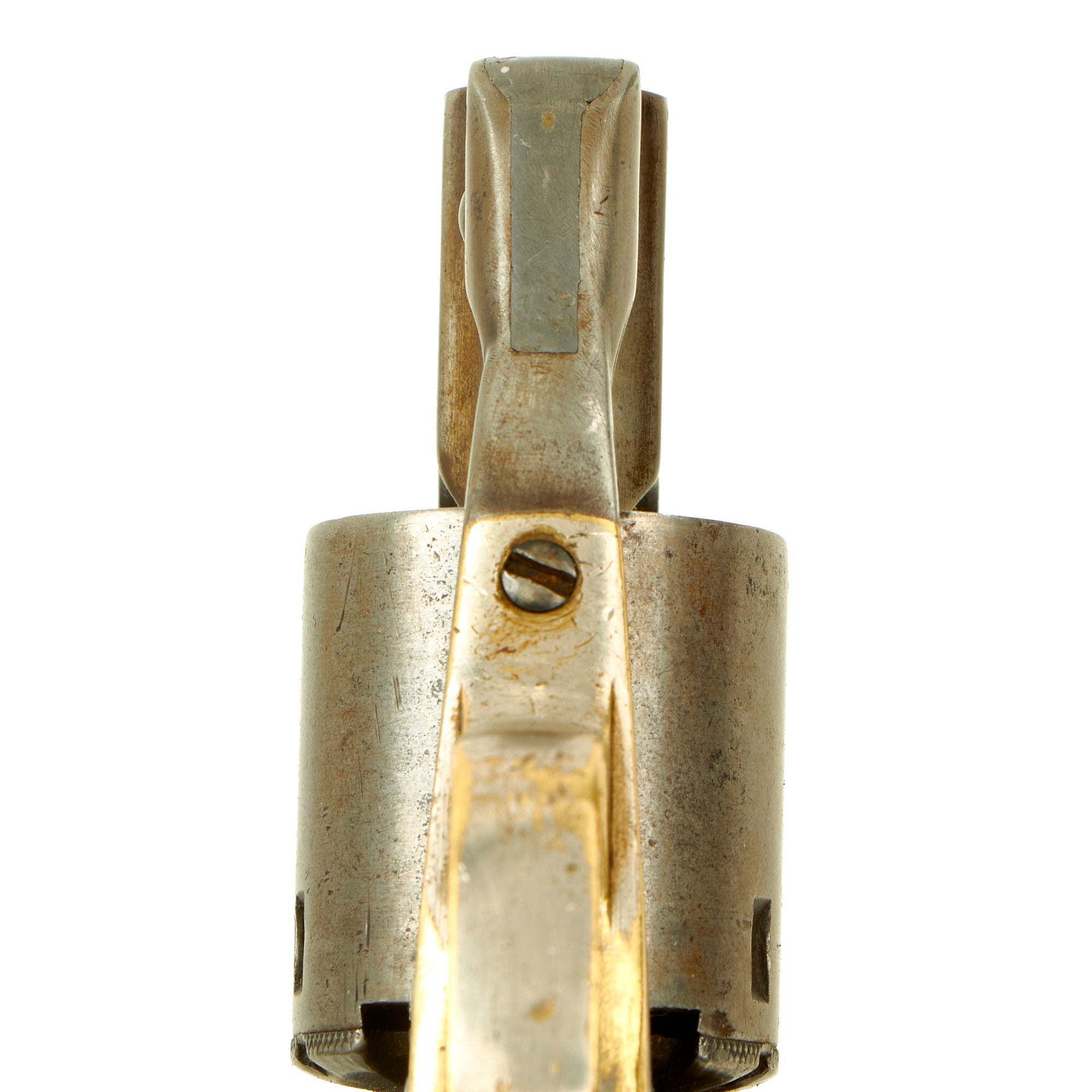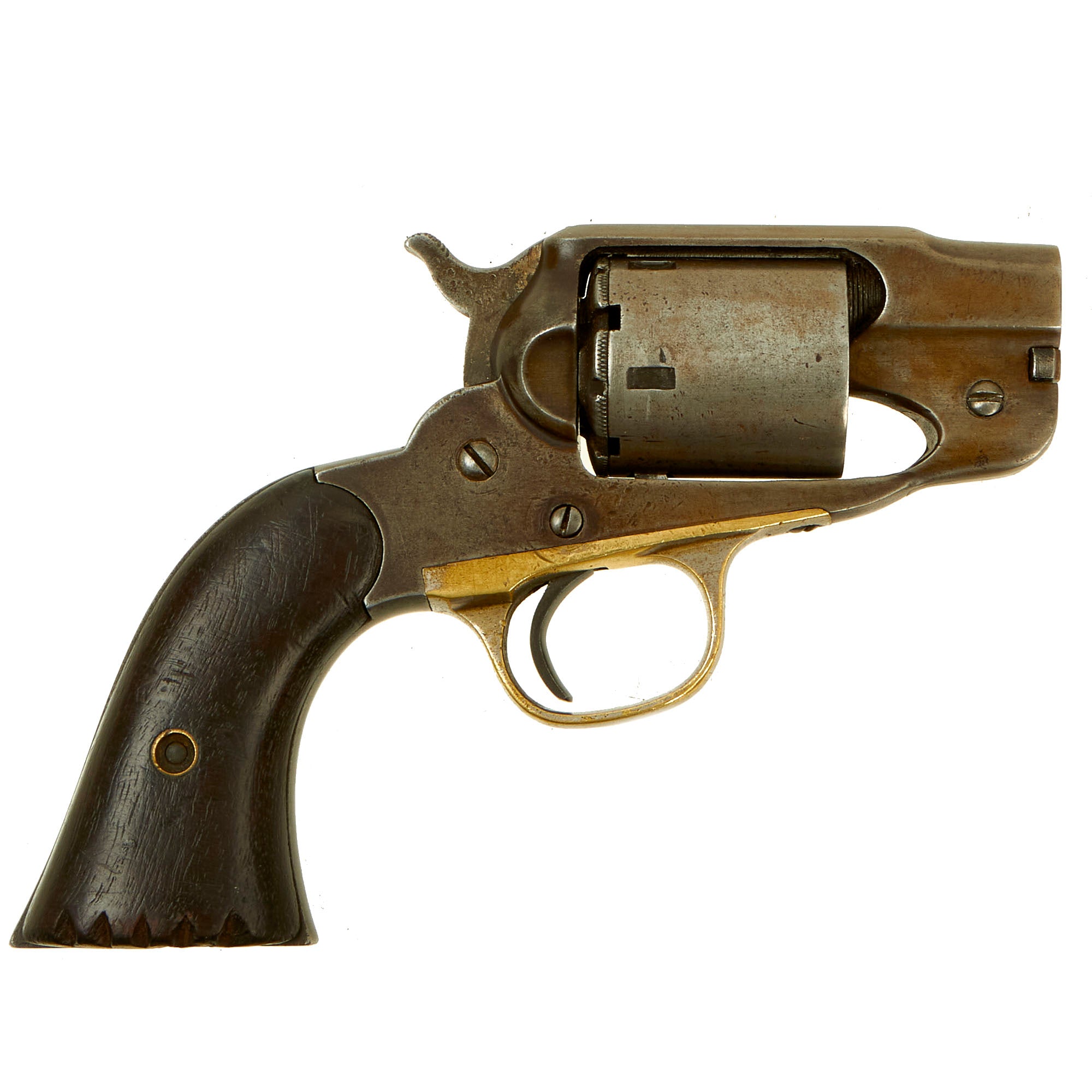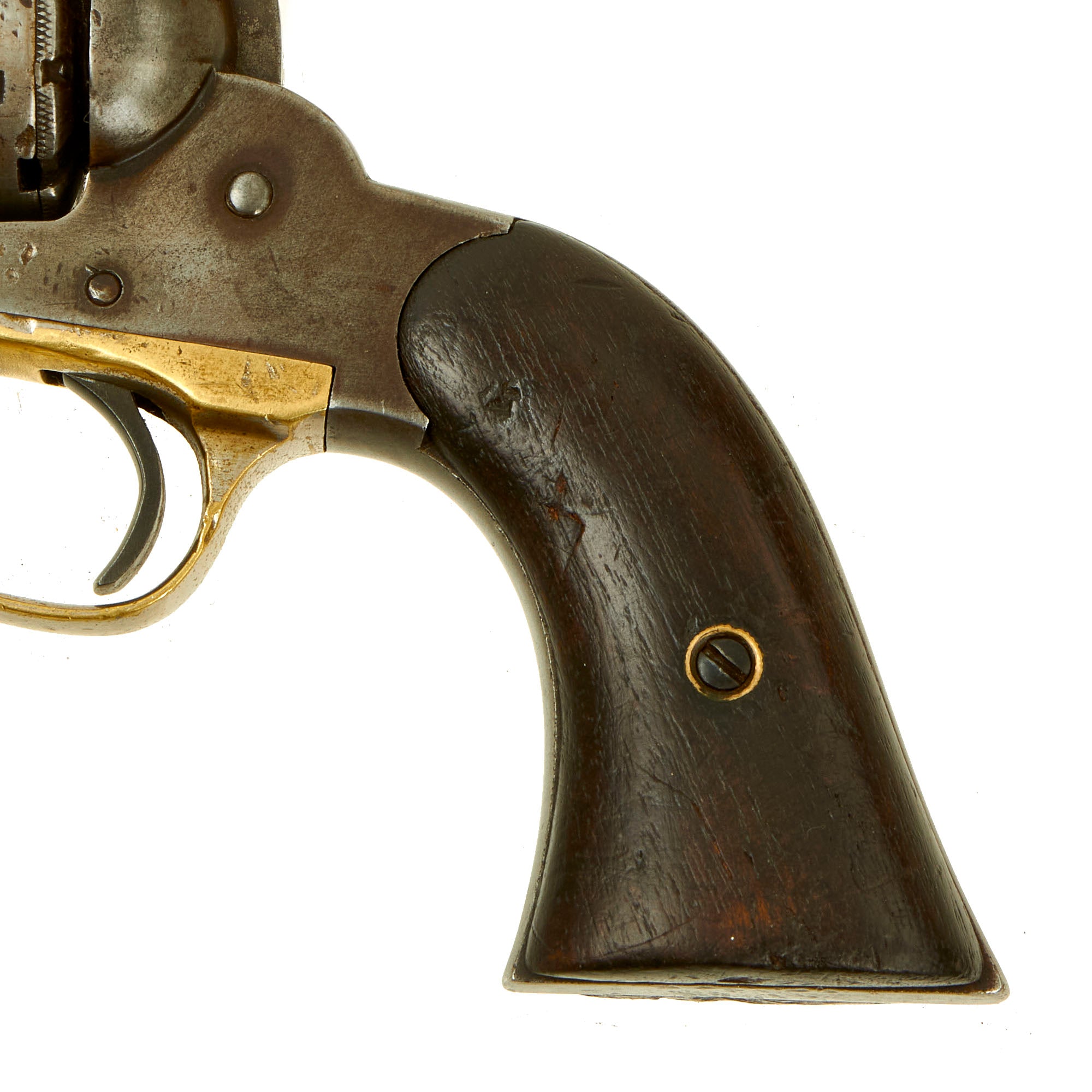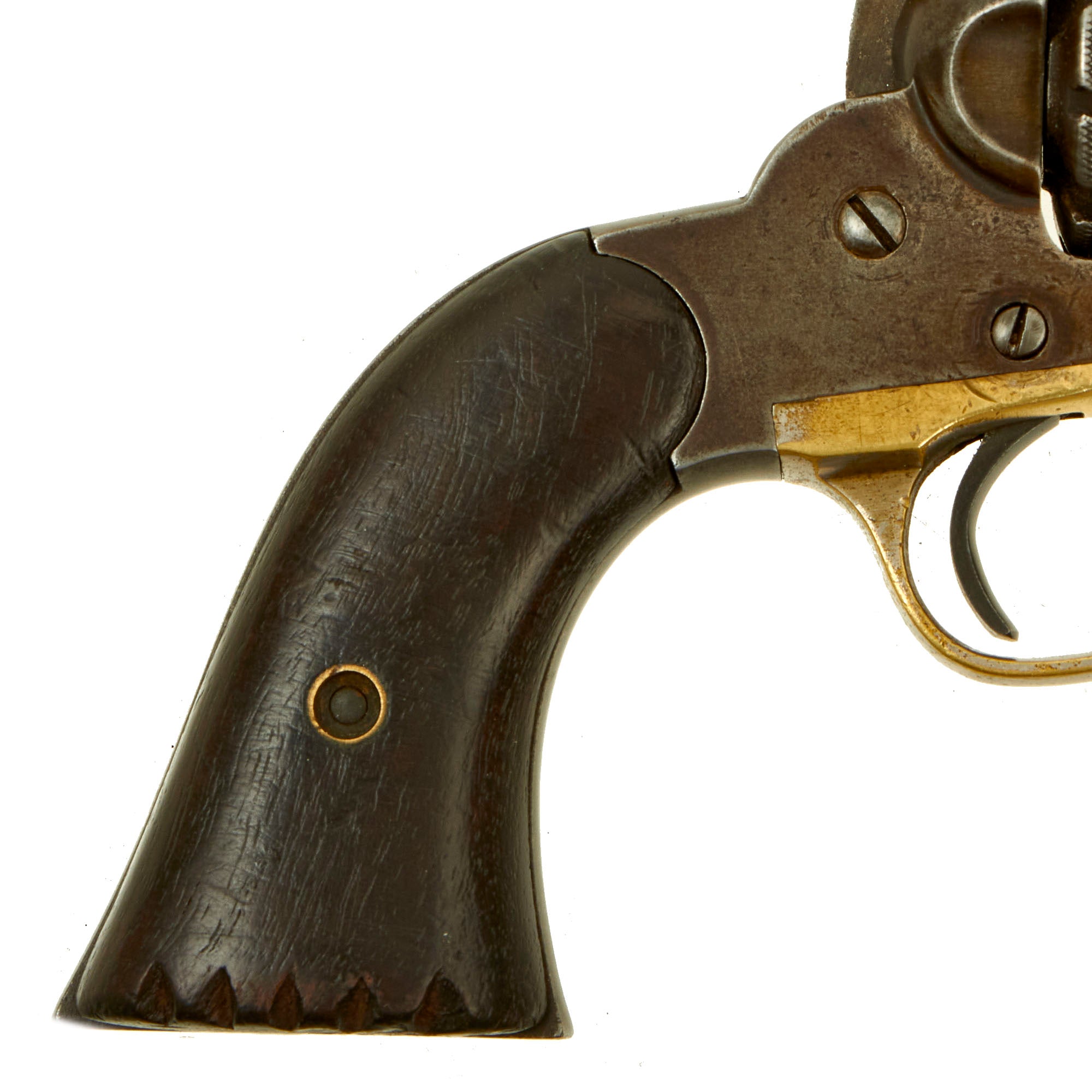 Overall condition is very good, with the metalwork worn to a lovely dull gray patina overall on the steel. The brass trigger guard is in very good condition, and even still has a good amount of the original nickel plating. The walnut grips show long service, and are now stained dark, with the expected wear from age and use. The bottom of the right grip scale has five notches carved into it.