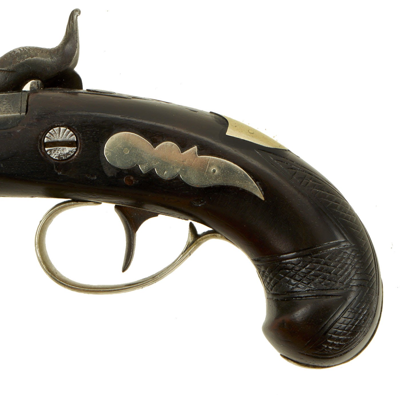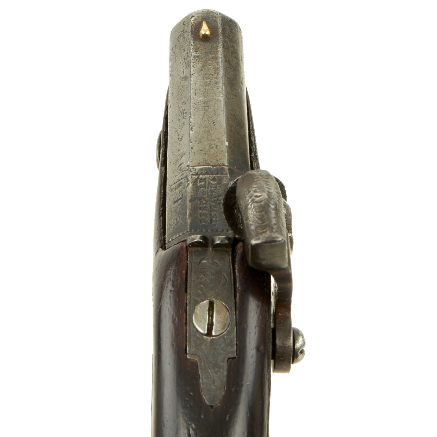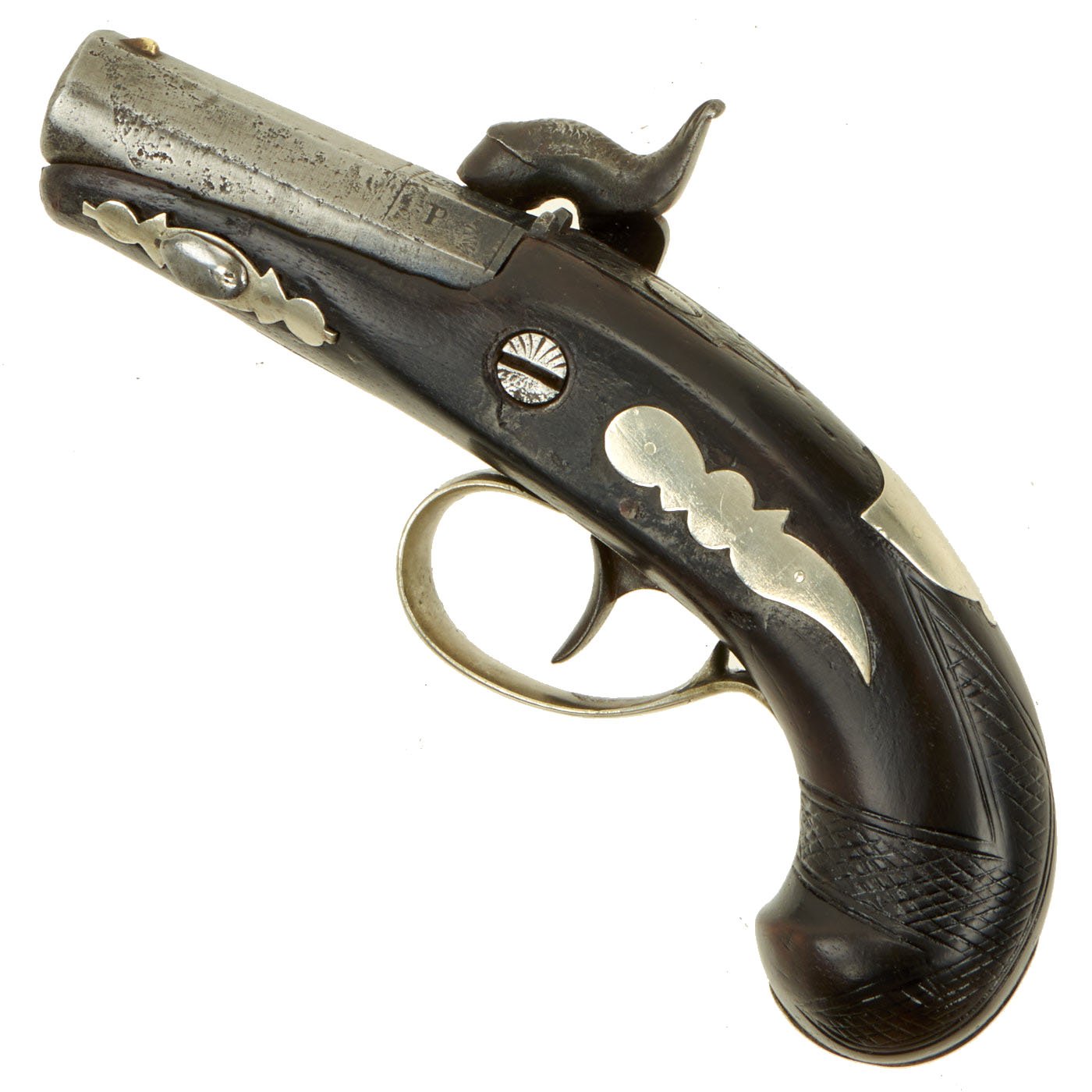 Our example is of the smallest model Deringers made, known as the Baby model, measuring only 5 1/2" in overall length with a 2" rifled .39" bore barrel. These were the ideal assassin's pistol of the Civil War era. The pistol is full silver mounted and has NO provision for a ram rod. Both the lock plate and the cap bolster are marked