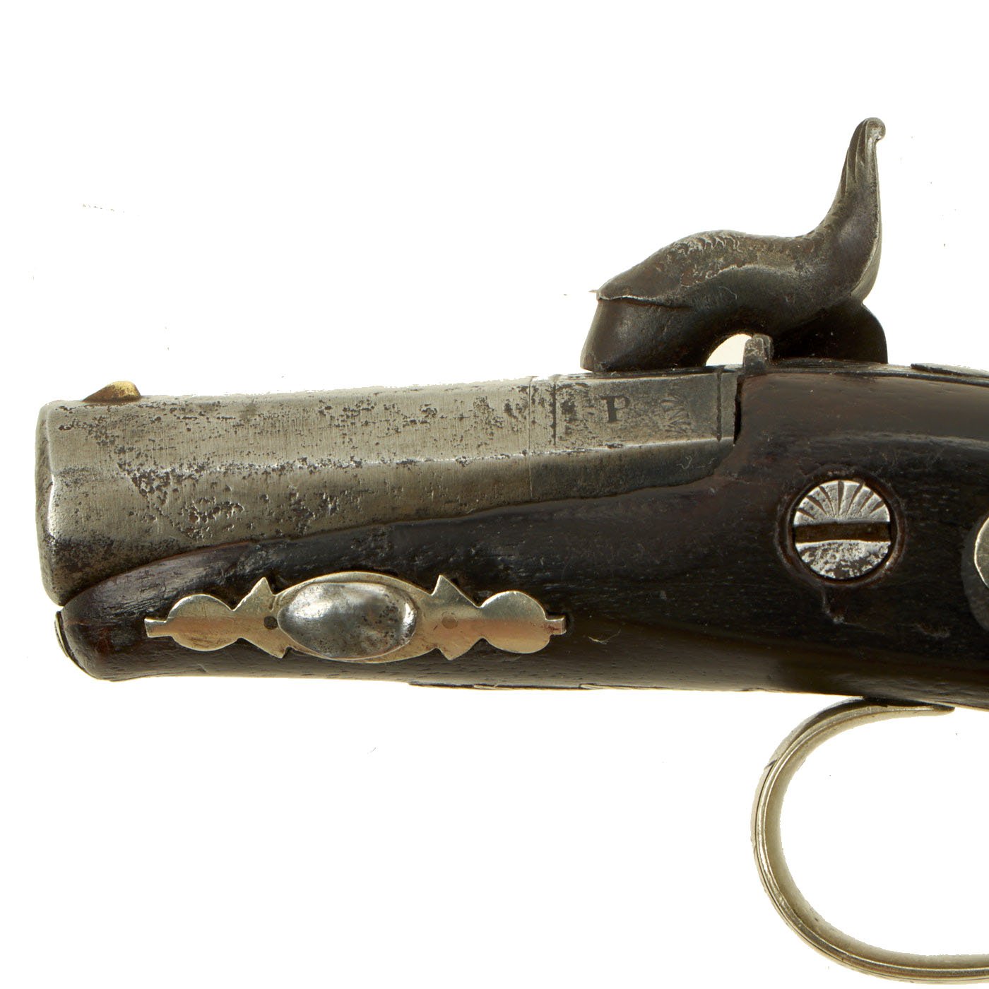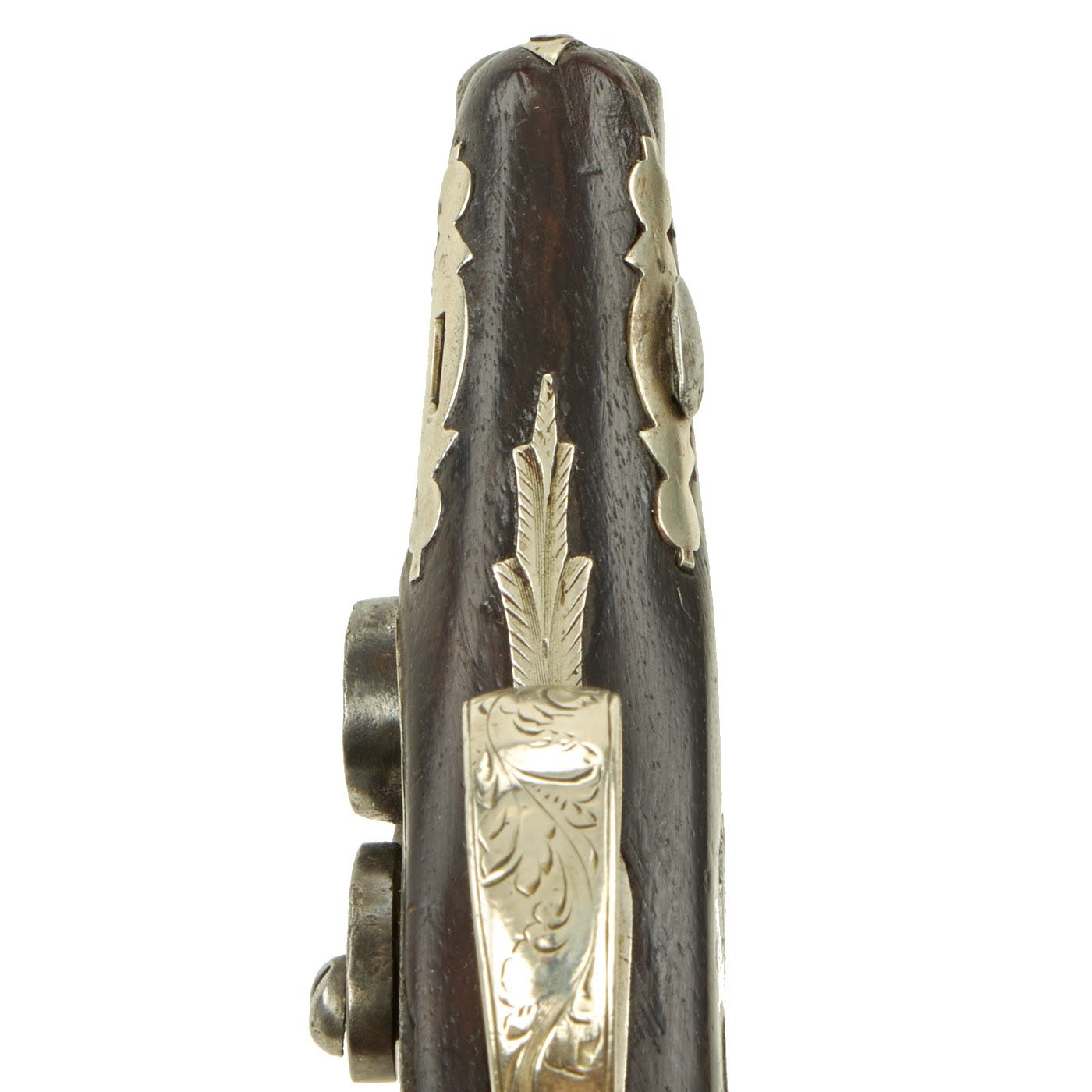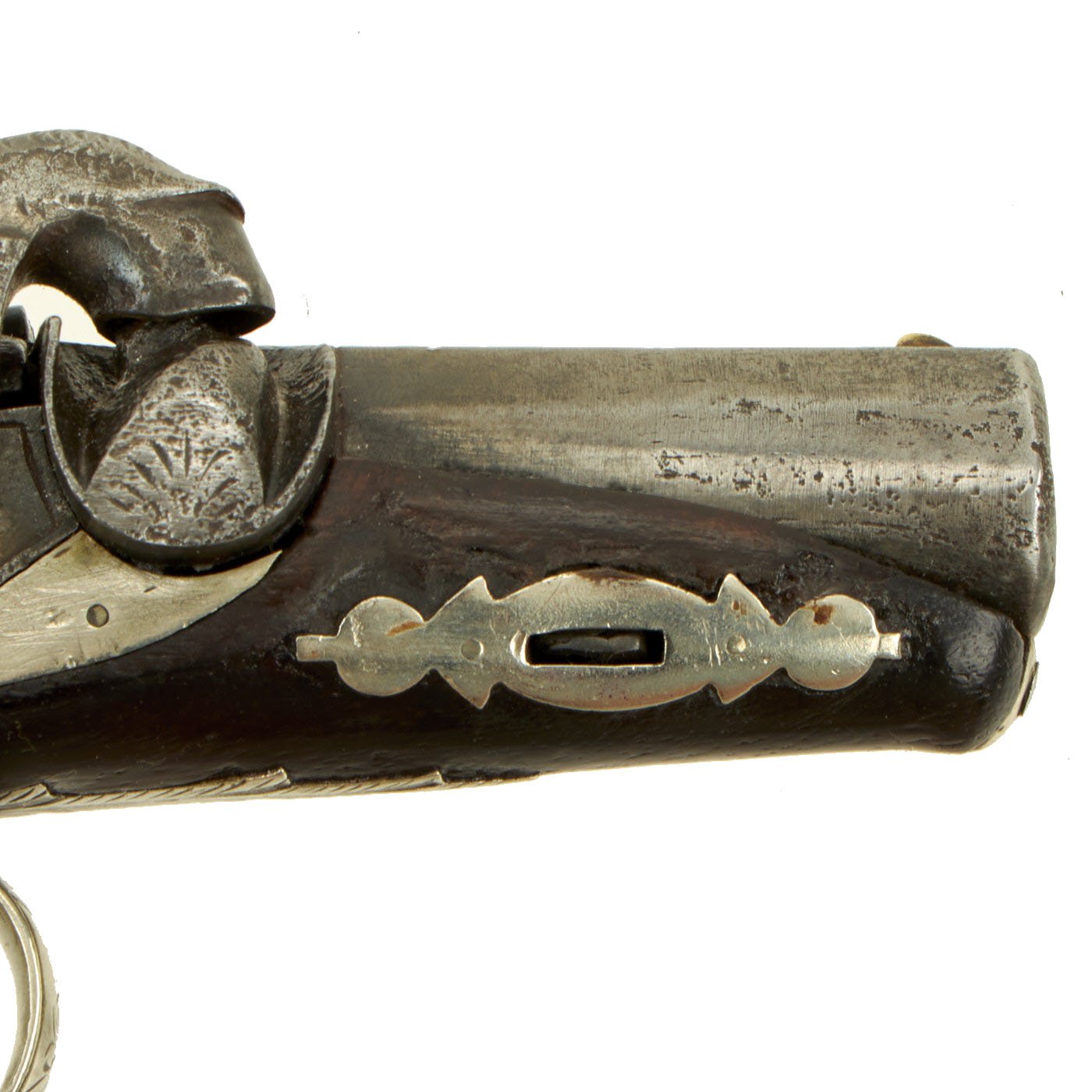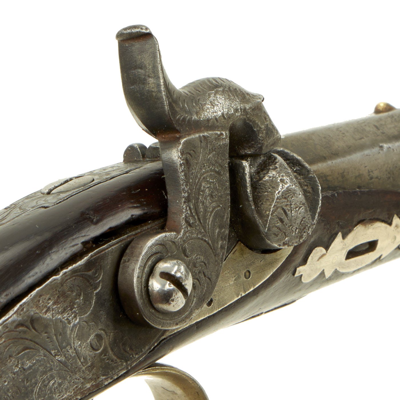 Our example is of the smallest model Deringers made, known as the Baby model, measuring only 5 1/2" in overall length with a 2" rifled .39" bore barrel. These were the ideal assassin's pistol of the Civil War era. The pistol is full silver mounted and has NO provision for a ram rod. Both the lock plate and the cap bolster are marked