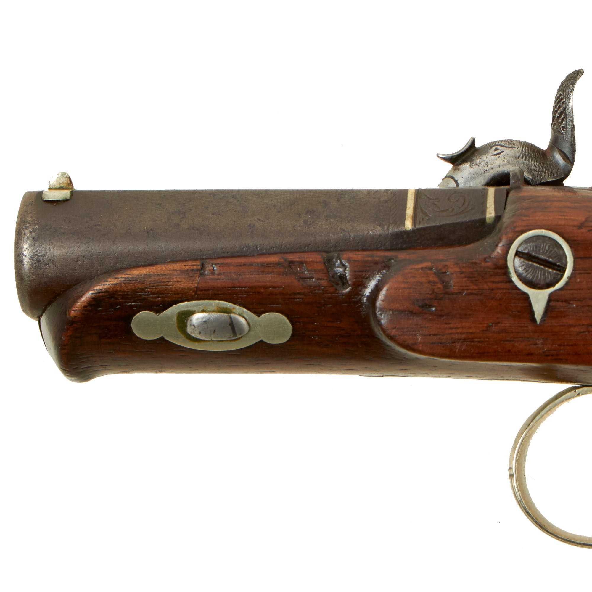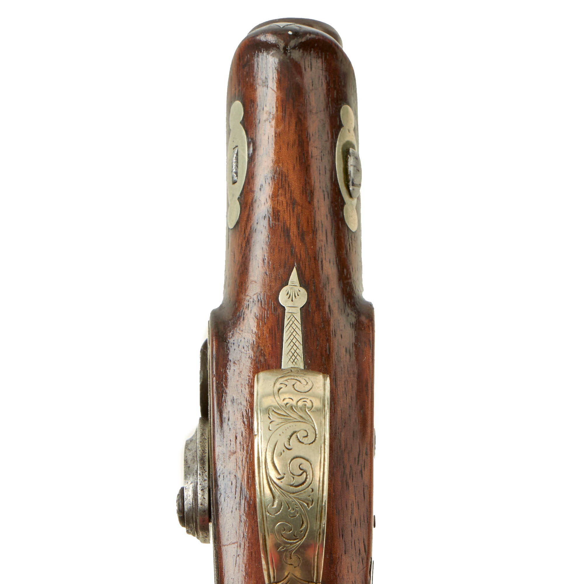 This pistol is fully silver or nickel silver mounted and has no provision for a ramrod, as there is not really room on these small pistols. The trigger guard is nicely engraved, as is the lock plate and the percussion hammer. The barrel tang and cap bolster also have nice engraving, the bolster is also silver banded, and even the left side lock screw is decorated. There are also silver inlays below the cap bolster, on the left side of the stock, a shield-shaped escutcheon on the back of the grip, and a minimal silver butt cap. It has a lovely walnut stock with a great finish and checkered grip, which shows some wear from use, and has probably been refinished at some point. The lock is functional, however it does not hold at half cock.