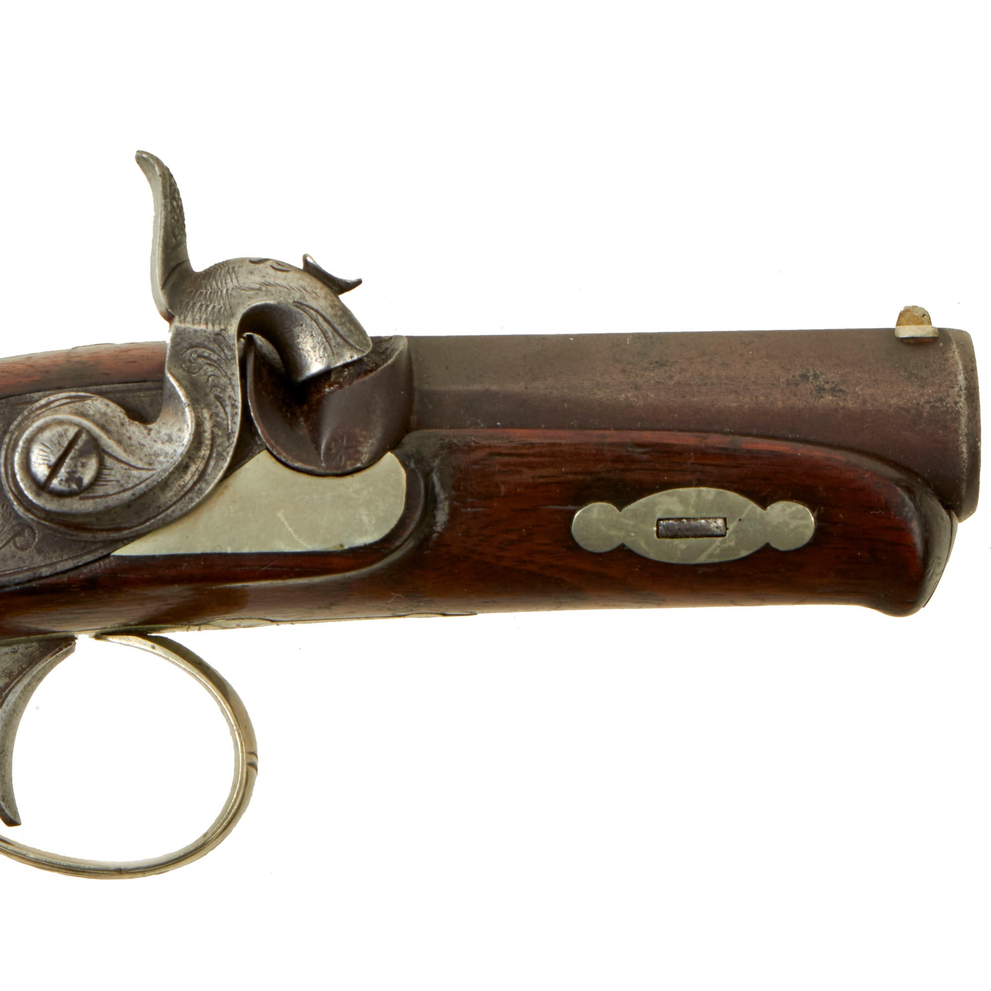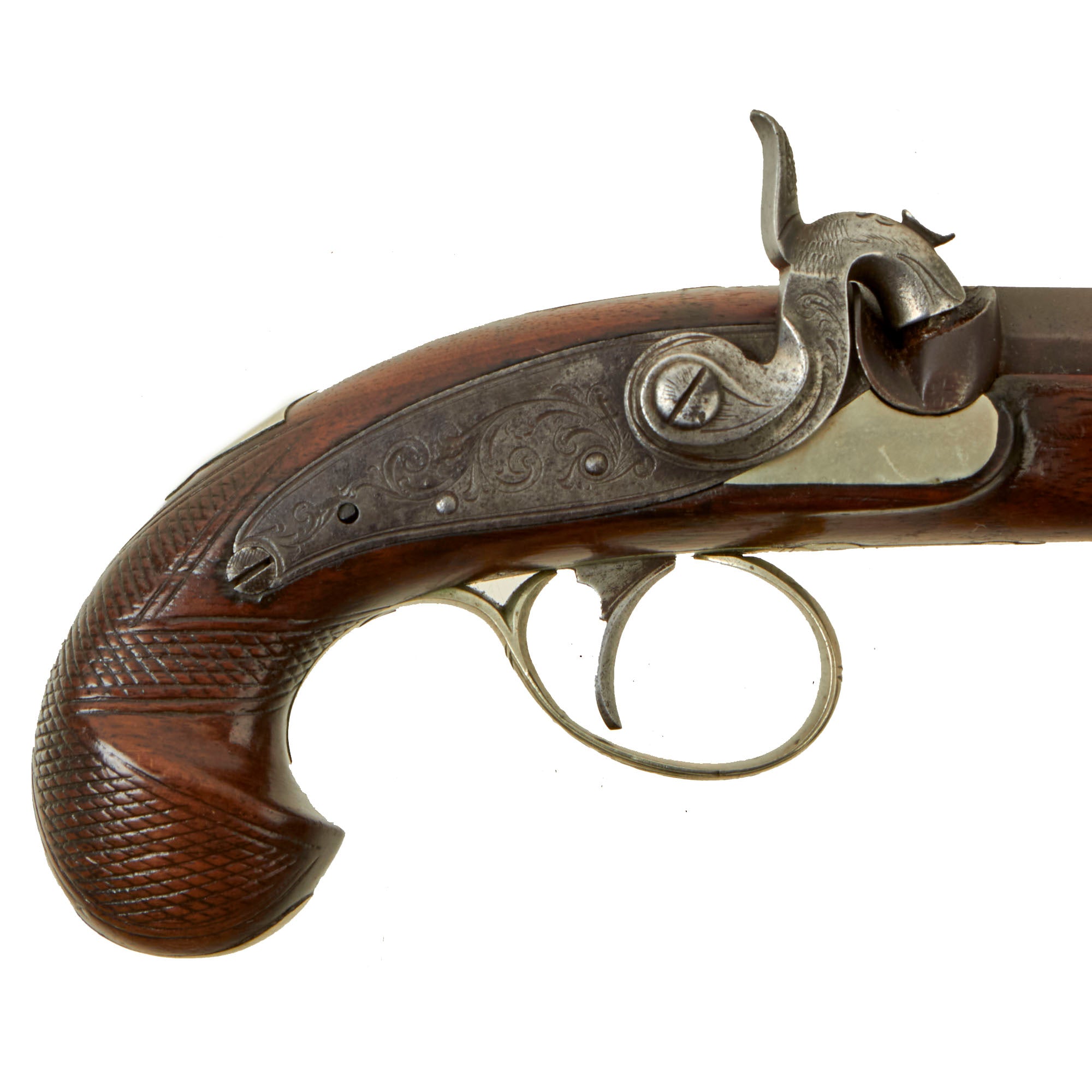 This is one of the many copies made during the Civil War Era, measuring 5 3/4" in overall length with a 2 1/2" rifled .41" bore barrel, though the rifling looks to have no twist at all. This is just about the size of most "Baby Deringer" style models, and is very concealable. These were the ideal assassin's pistol of the Civil War era, and if you look up the pistol that killed Lincoln, it is nearly identical in form.