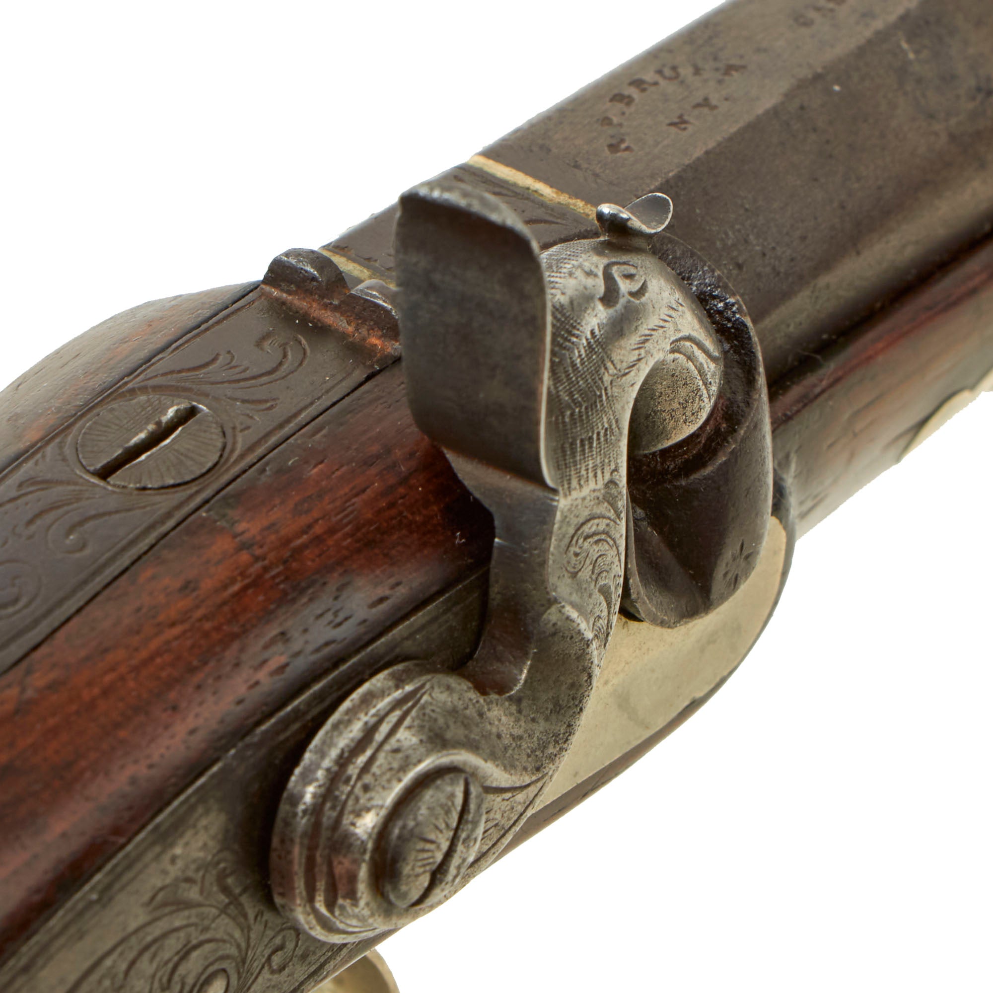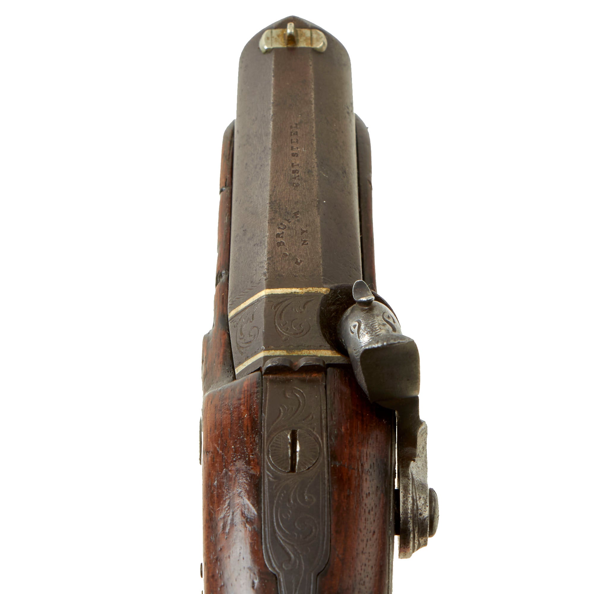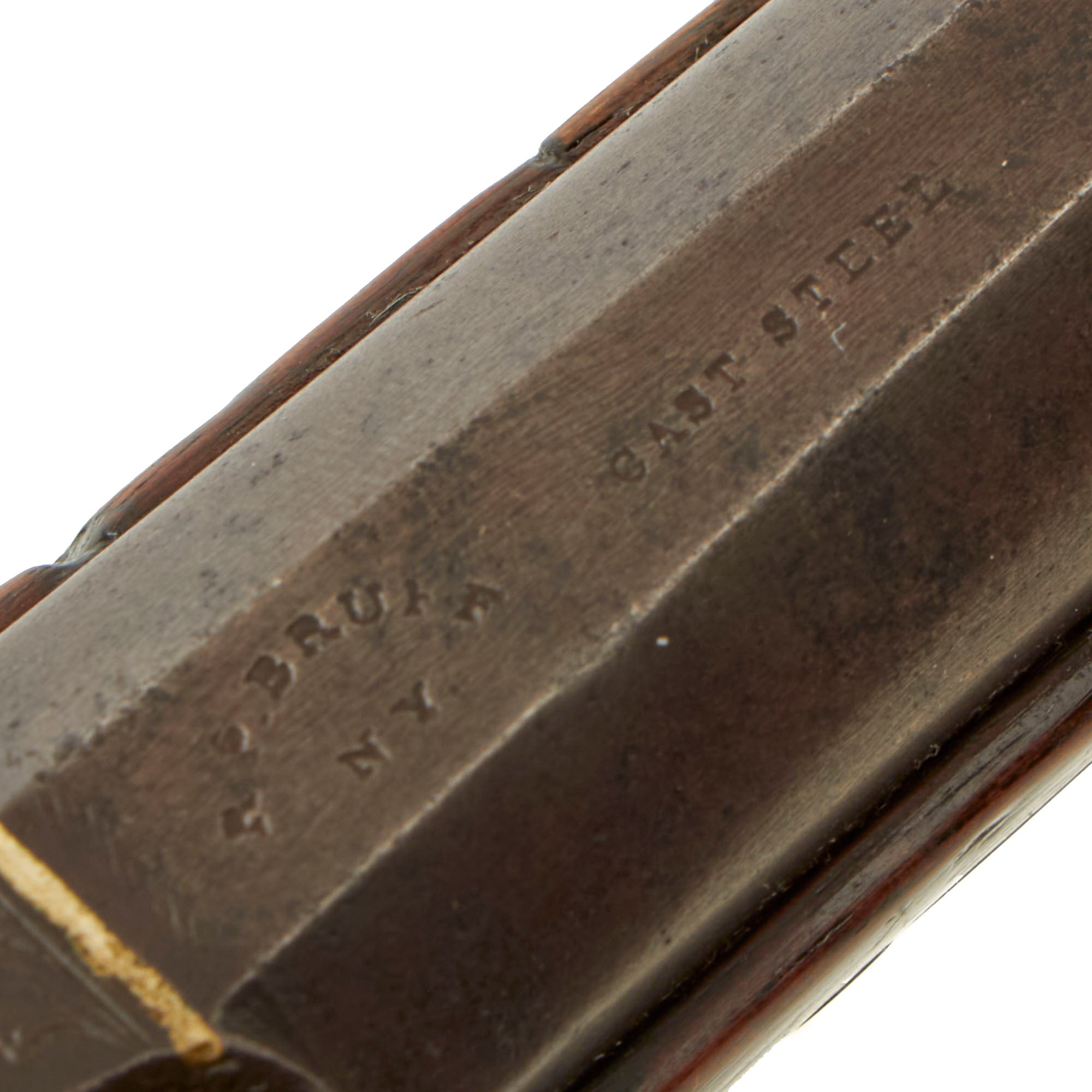 This example is marked on the top of the barrel with R. P. BRUFF in an arc over N.Y., with CAST STEEL forward of the maker mark. Richard P. Bruff and his brother Charles are known to have made Derringers as early as 1858 through the Civil War and into the 1870’s. We have seen several other examples from this maker, and they all seem to be relatively well appointed.
