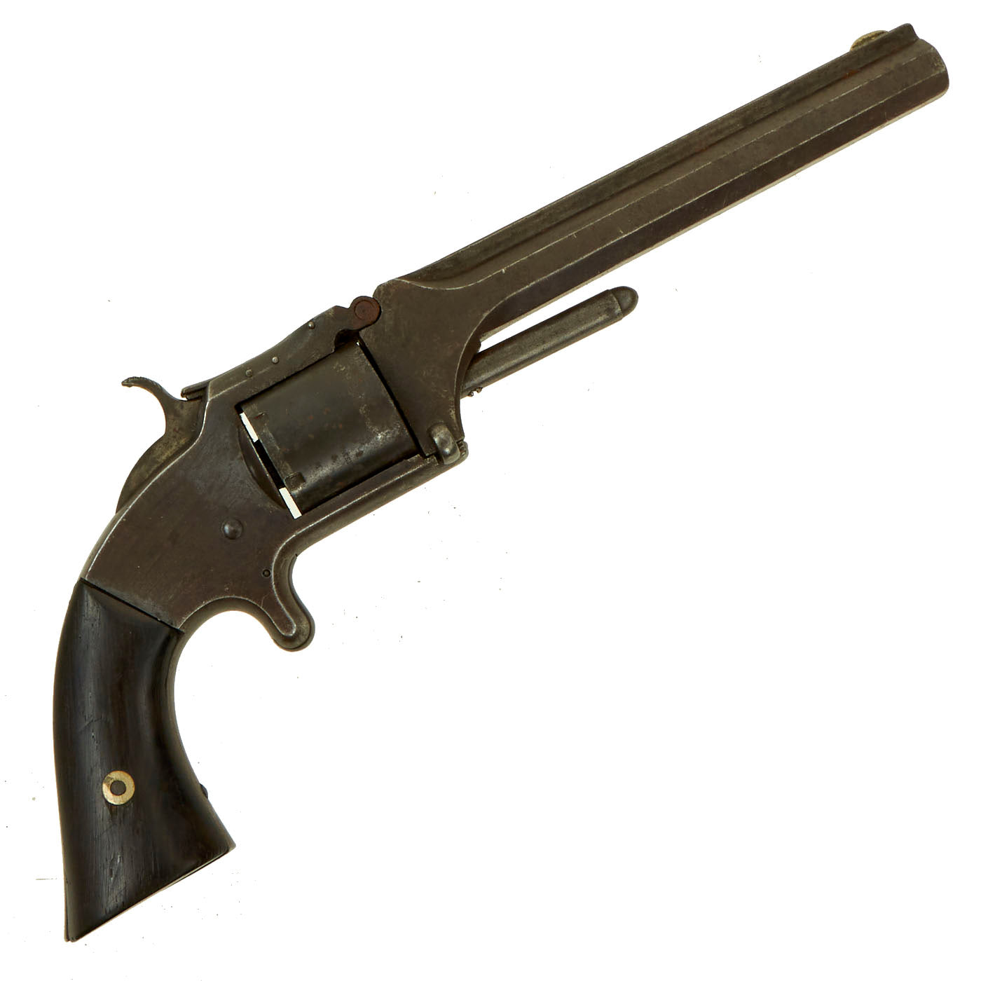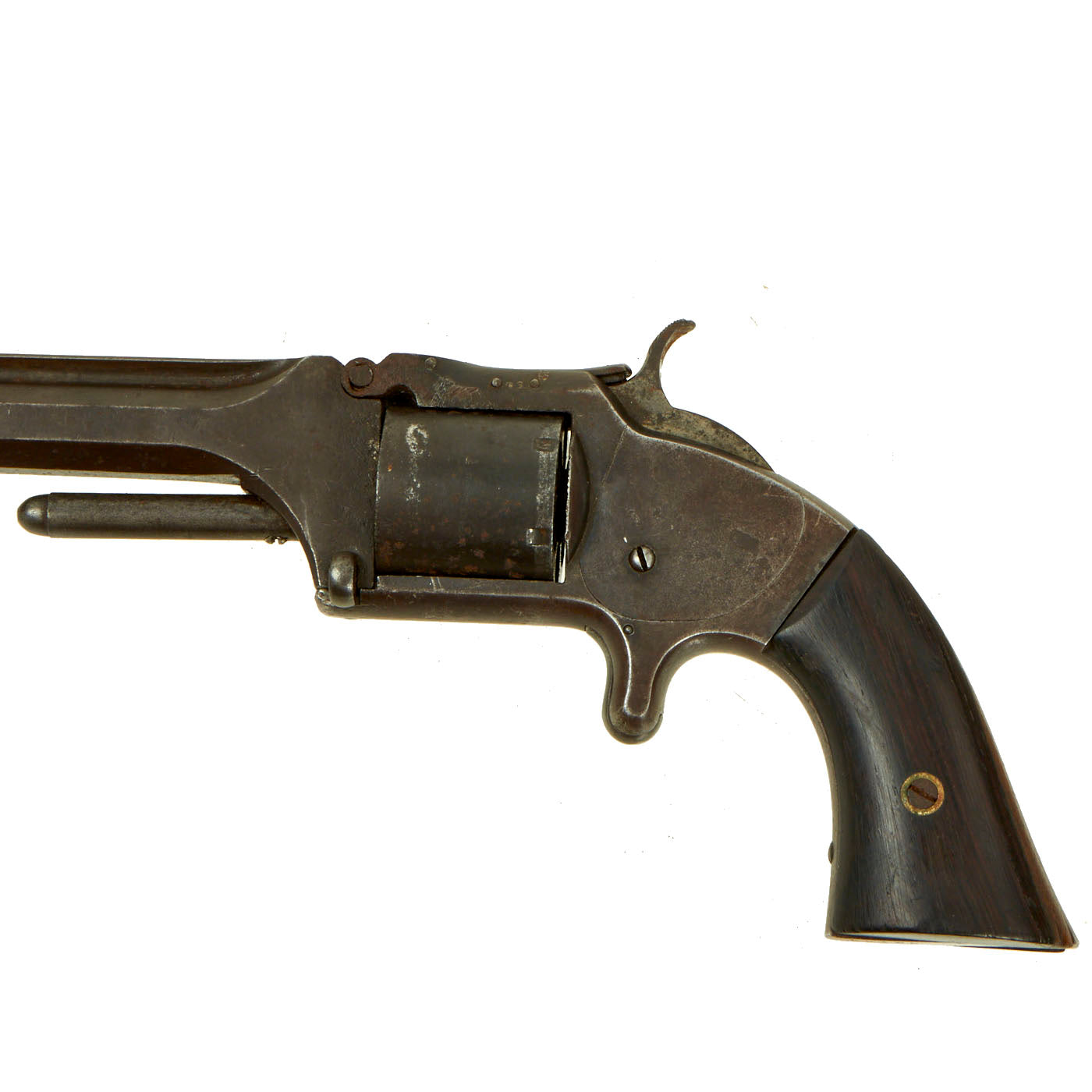 Original Item: Only One Available. This is a very nice example of a Smith & Wesson .32-caliber rimfire Model 2 Army Revolver, made just after the end of the U.S. Civil War. It features a 6 inch unshortened barrel, and has a lovely service worn patina of age. These were very popular as backup weapons for Union officers, used after their percussion revolver's cylinder was spent.