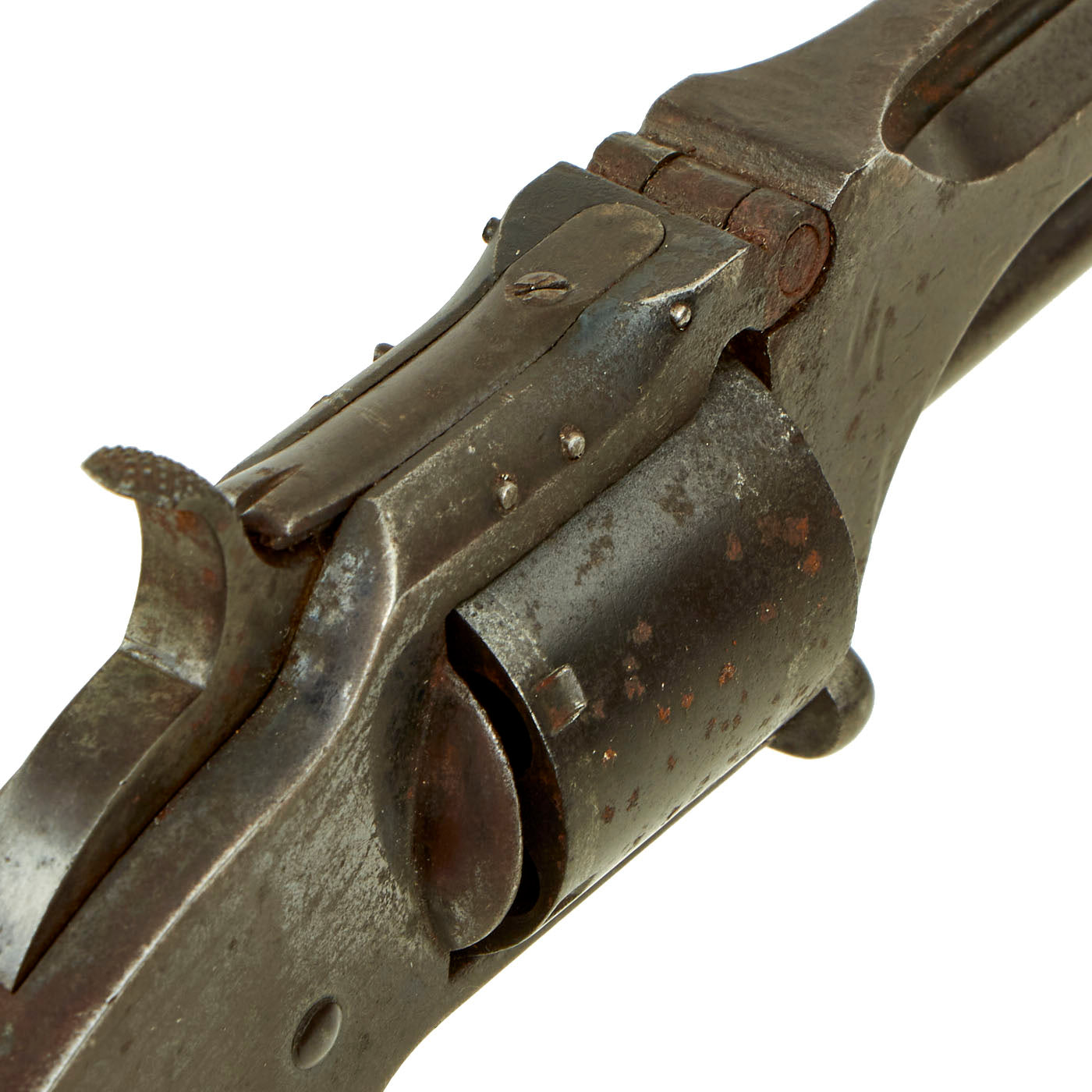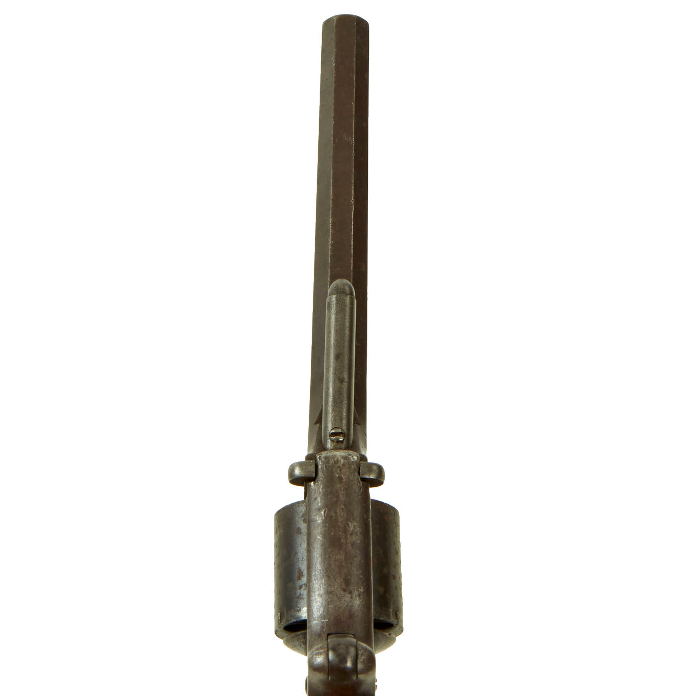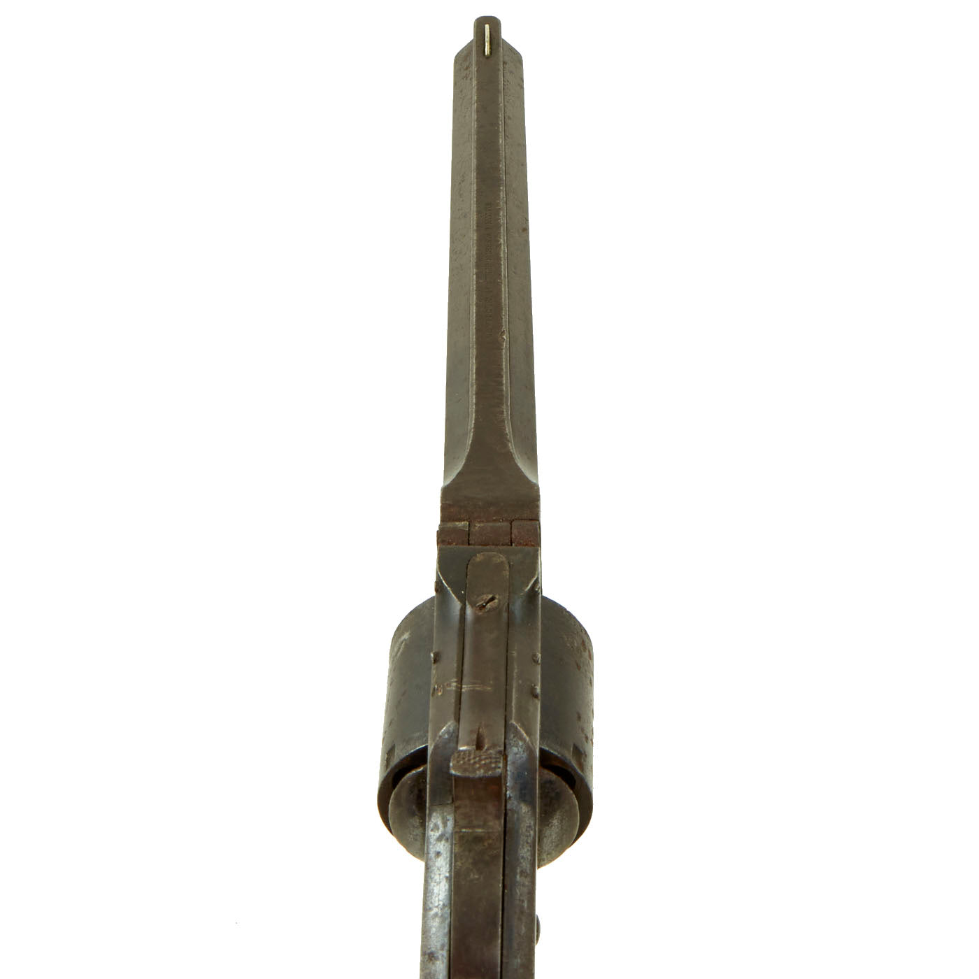 The revolver cycles well, with relatively good indexing and and a crisp dry fire. There is however some slop in the action due to wear, and the cylinder lock is worn, so the cylinder can be turned at full cock with only light force. The bore is in fair to good condition, with clear lands and grooves, but also showing past pitting an oxidation as well as wear.