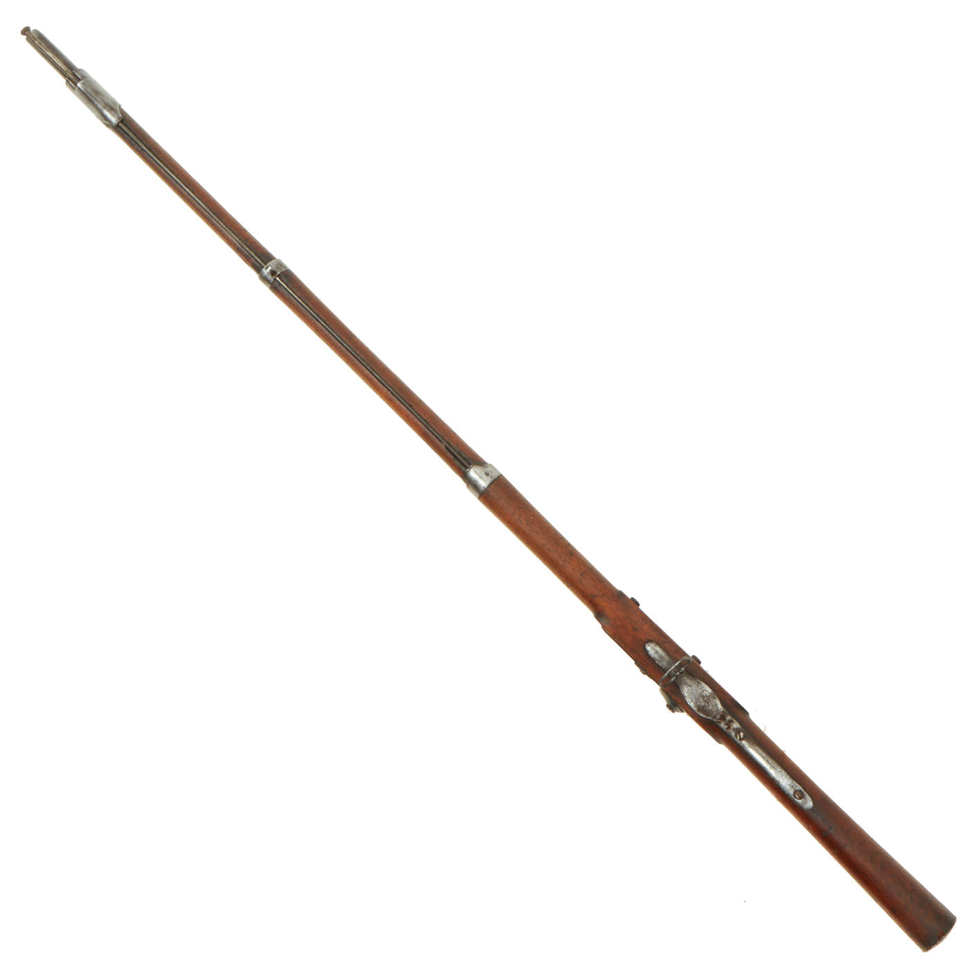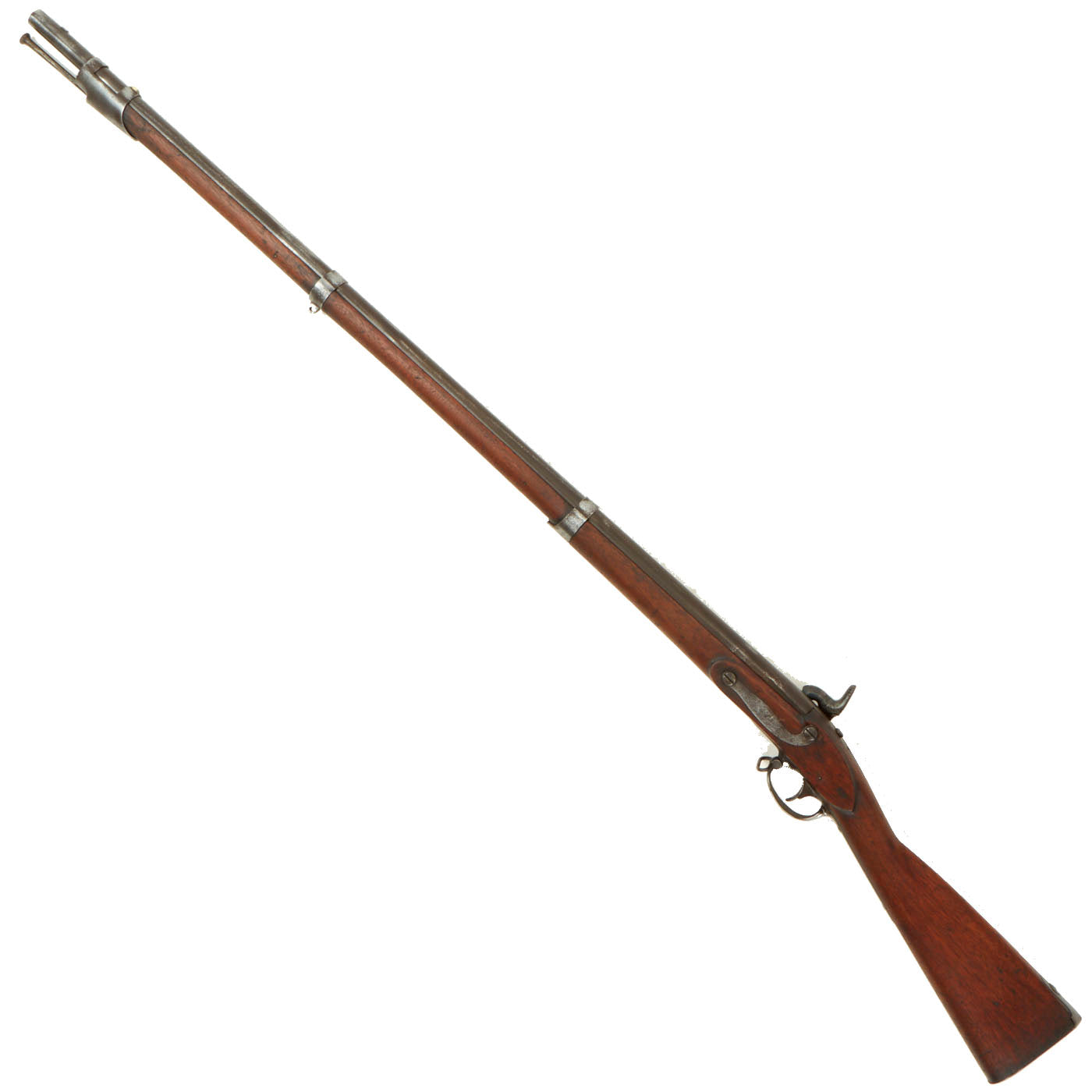The entire weapon has been fully cleaned to its very best display condition. There is a lovely aged patina on most of the metalwork, with no major pitting or other damage. The lock functions, holding correctly at half cock, and firing at full. The bore was not rifled on this musket, and it shows fouling and oxidation on the interior. The original cleaning rod is still present, however the upper sling swivel is missing.