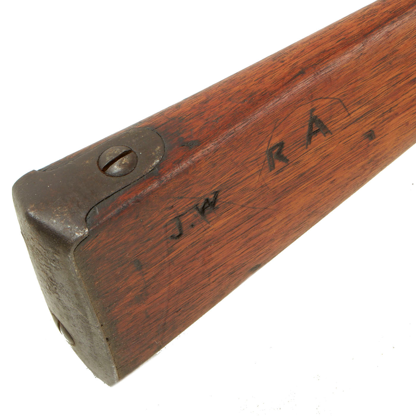 The stock is in very good shape, with the expected wear and dents from service. There is a crack just above the side plate, a common place for stock issues due to how thin the wood is in that area. There are still cartouches visible, which look to read FW and EG, definitely a potential for future research. There are also some initials carved into the right side of the butt stock.