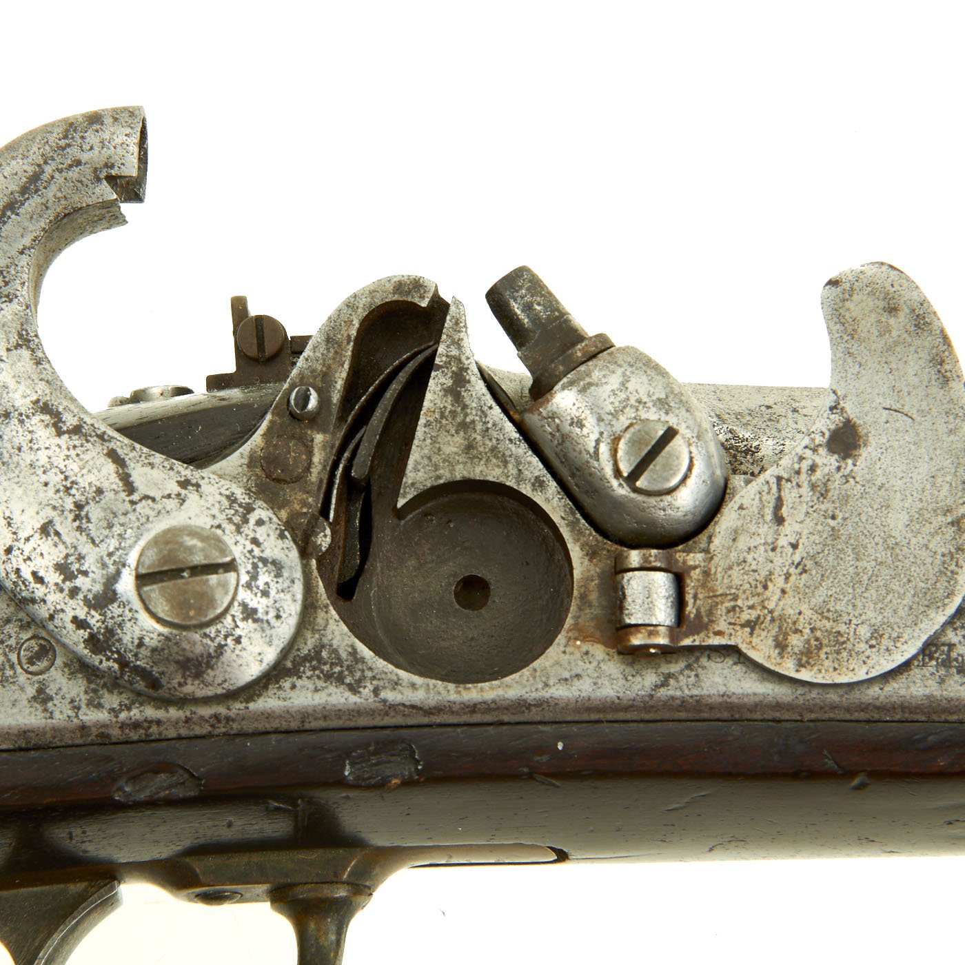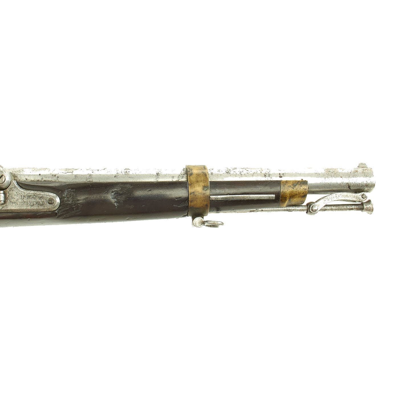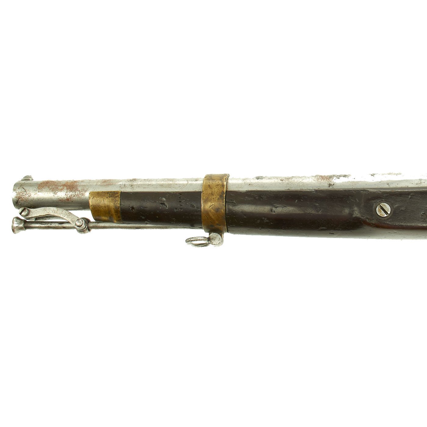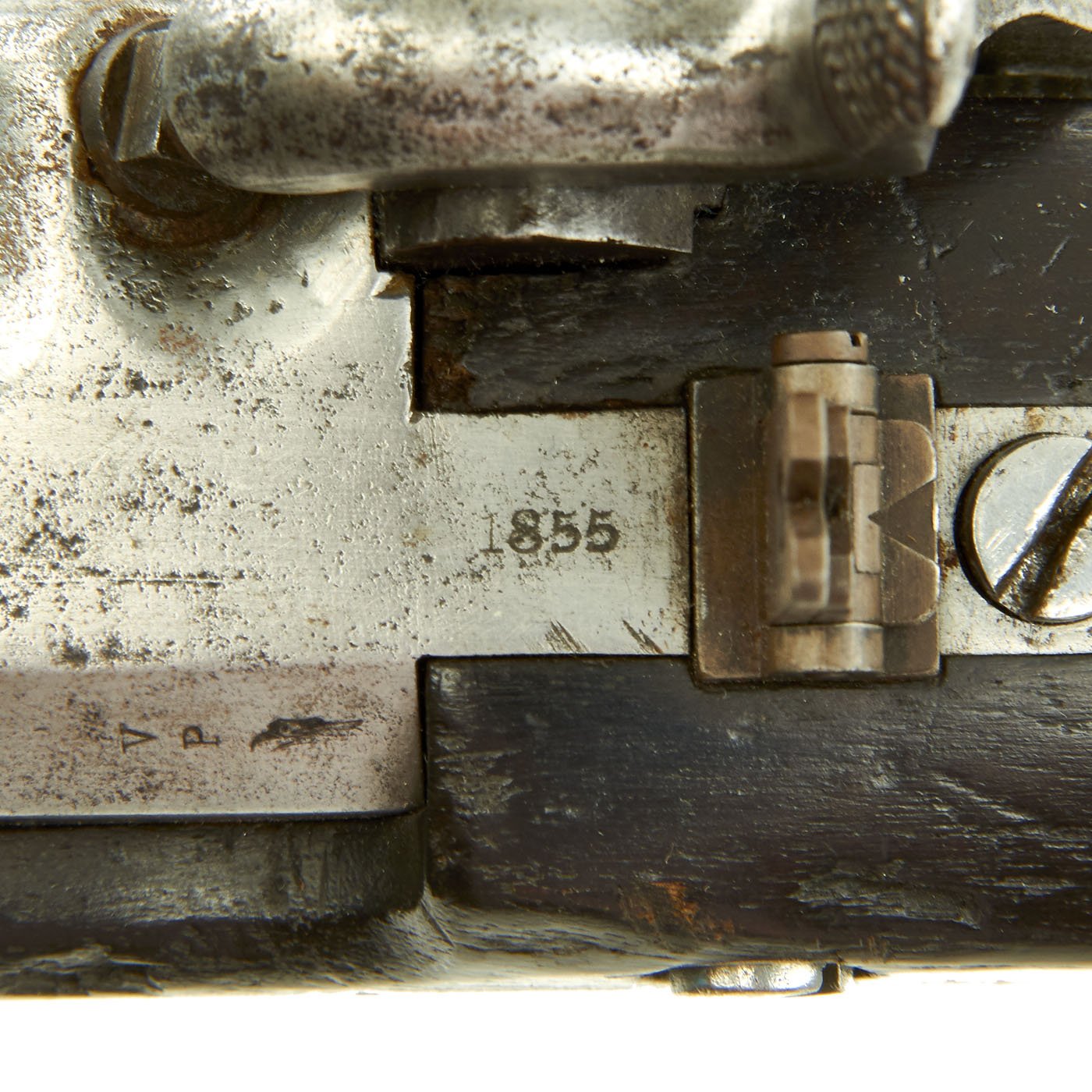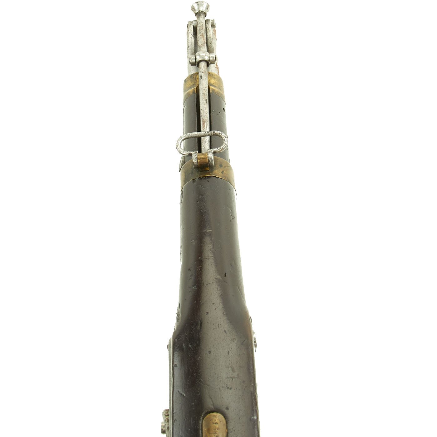 Steel parts all bright, not blued showing scattered minor old rust stains. The V / P / Eagle Head proofs are present and crisp, with almost no degradation. The bore shows original three groove rifling, with some powder fouling and oxidation. The lock functions correctly, holding at half cock and firing at full. It also still has the connector to the Tape primer system working, though we do not know if it is still able to properly work with the primers.