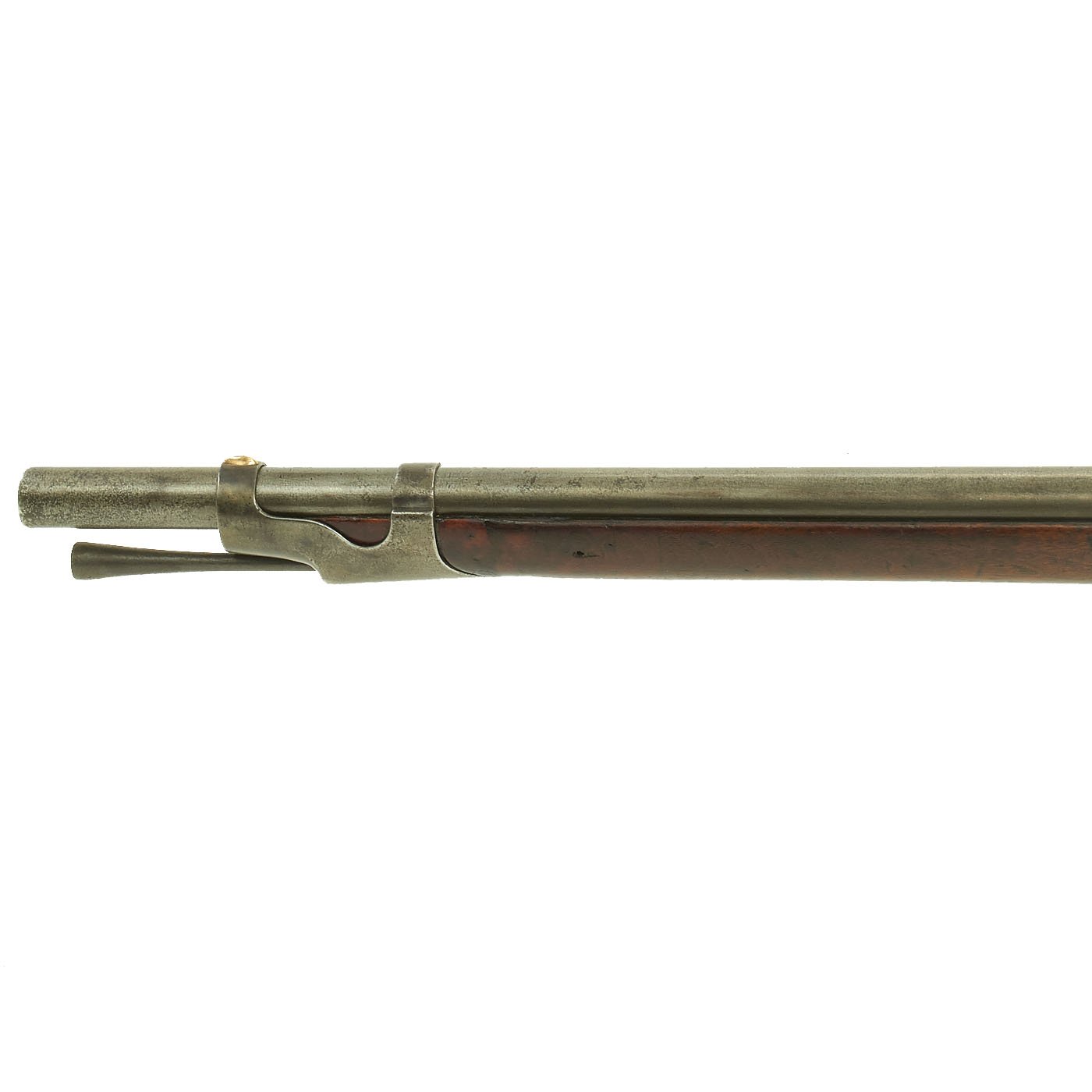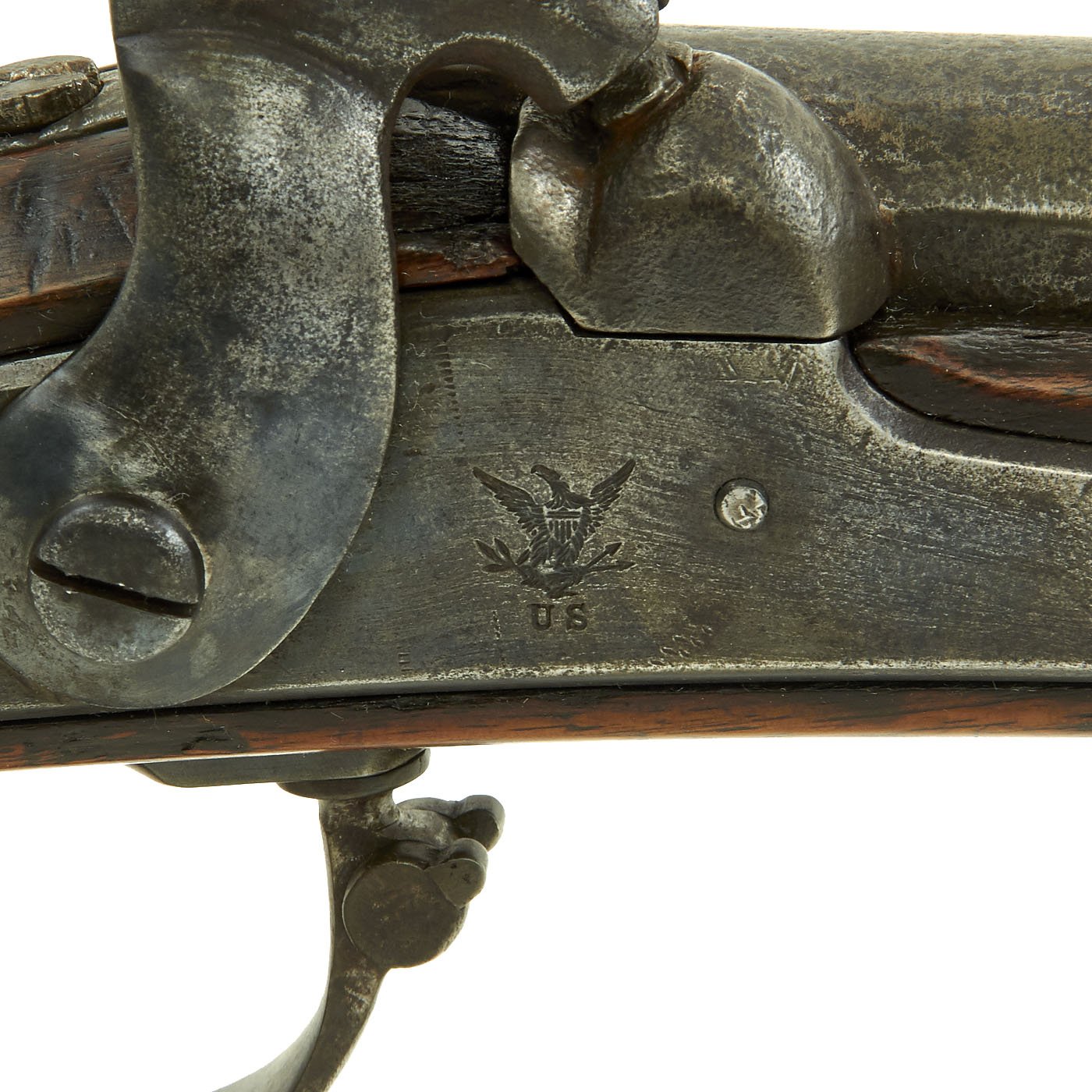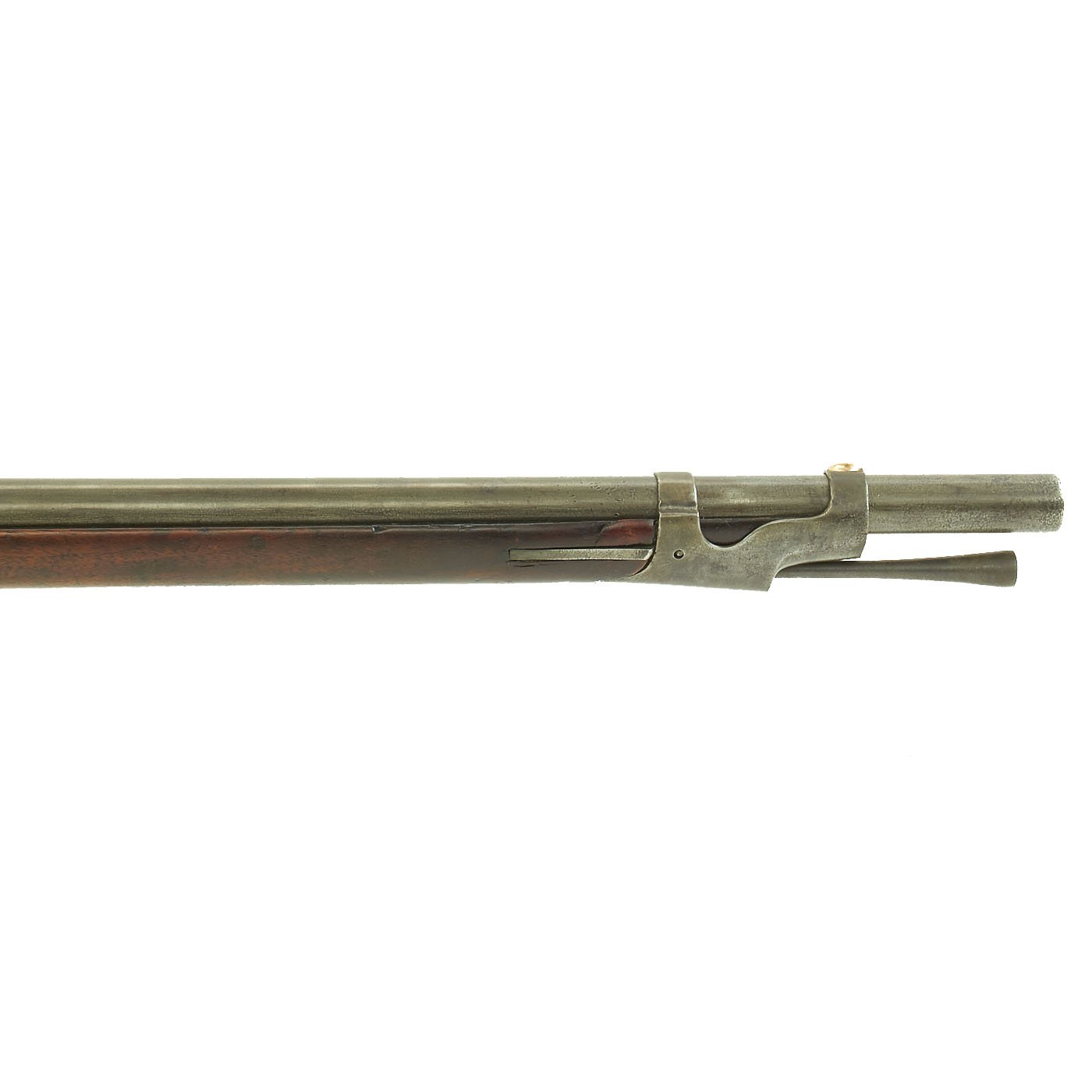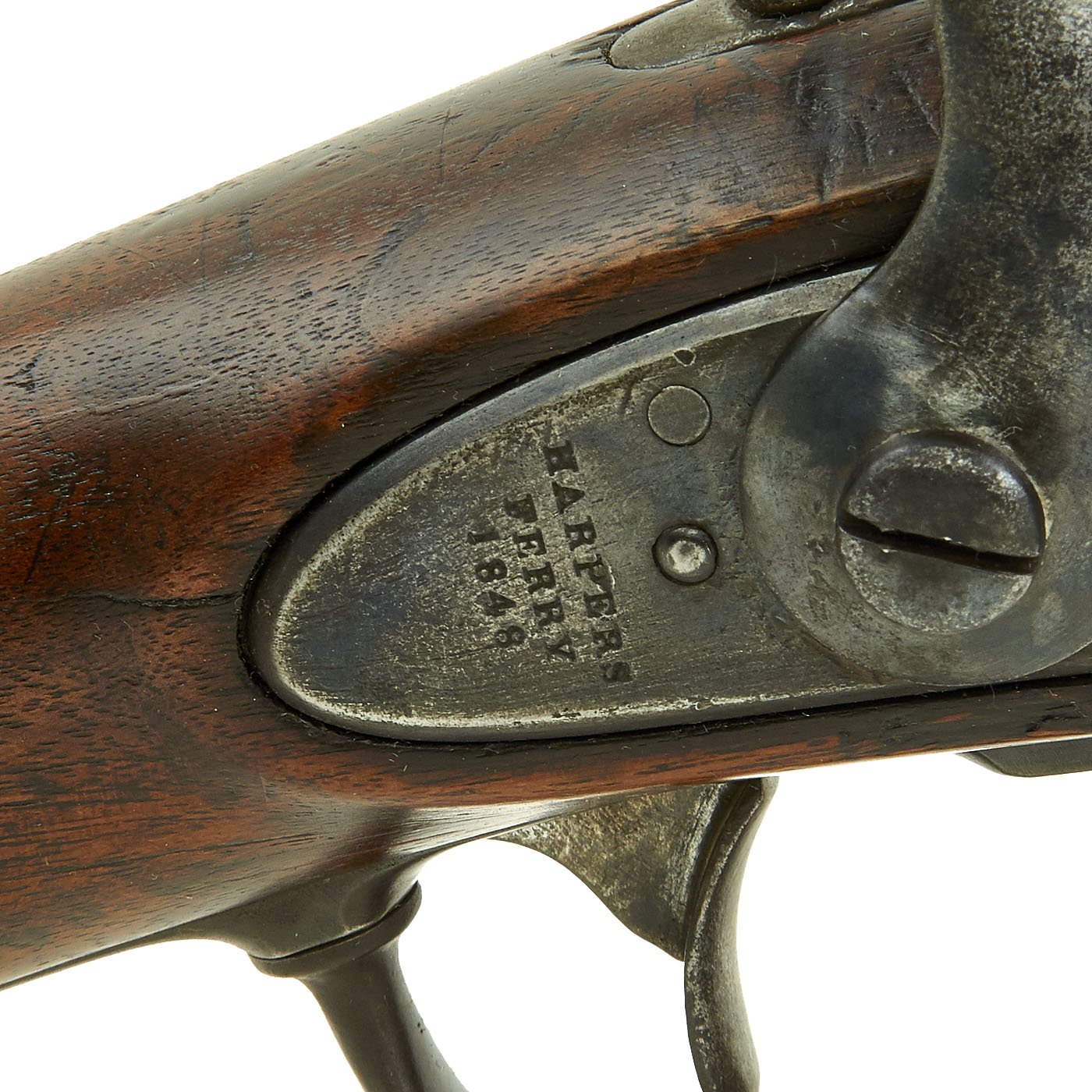 This example is marked with the usual "American Eagle" over US, and the lock plate tail is faintly marked HARPERS / FERRY / 1849. It is a shorter musket, either purpose made or converted to be an Artillery Short Musket, which were not carried over the shoulder, so they did not require sling swivels. Many of the Model 1842 muskets were produced under contract, however this example was made at the Government Harpers Ferry Armory. The rifle side plate is thin and not bulged, as typical of the Model 1842 Musket. Previous iterations had had a more pronounced side plate with a bulge in the middle. The barrel Knoxform has the correct V / P / Eagle's head proof marks on the left side, and there is a trace of the stock cartouche behind the side plate.
