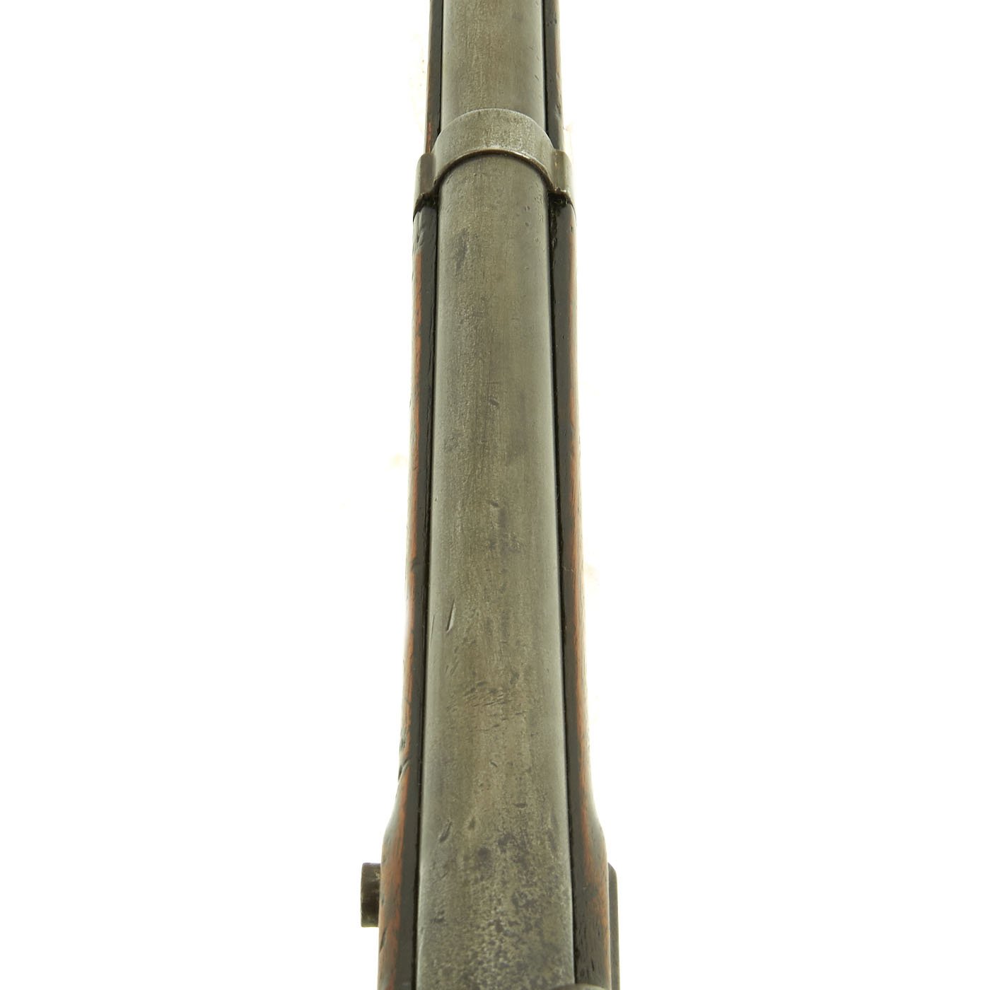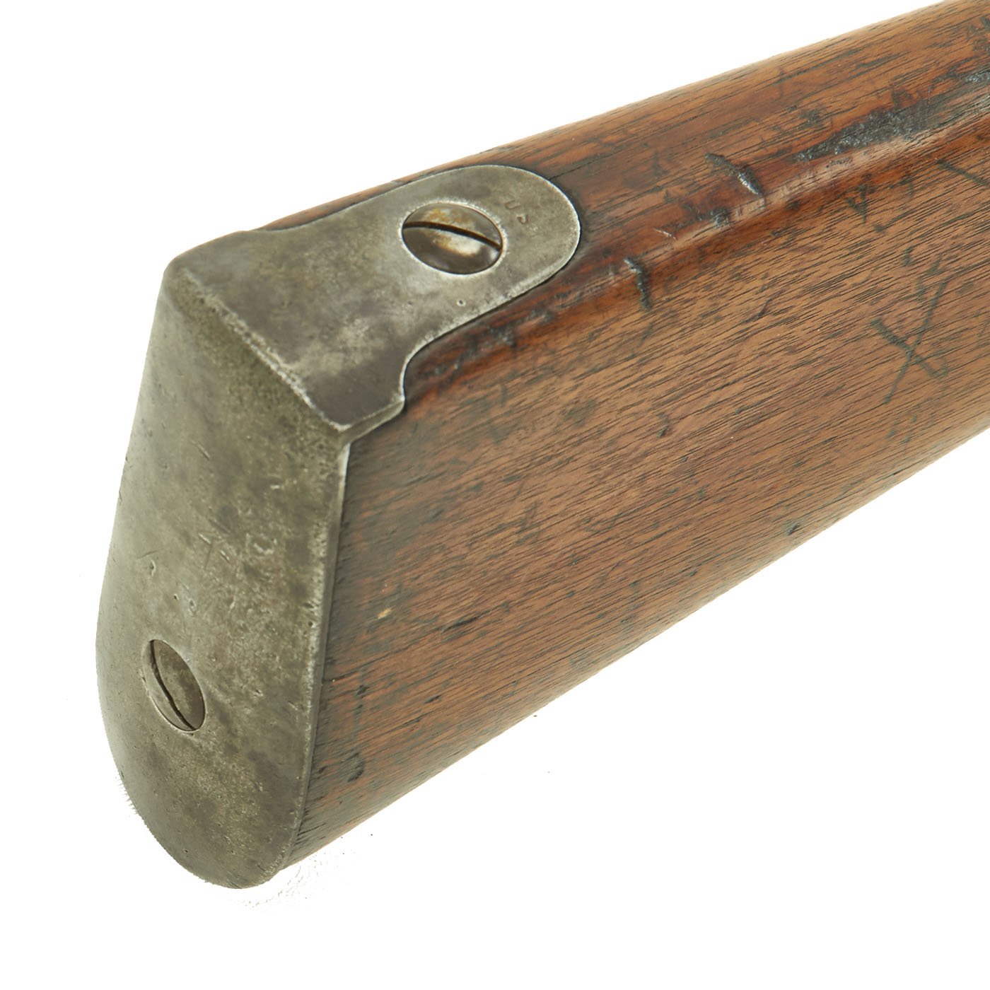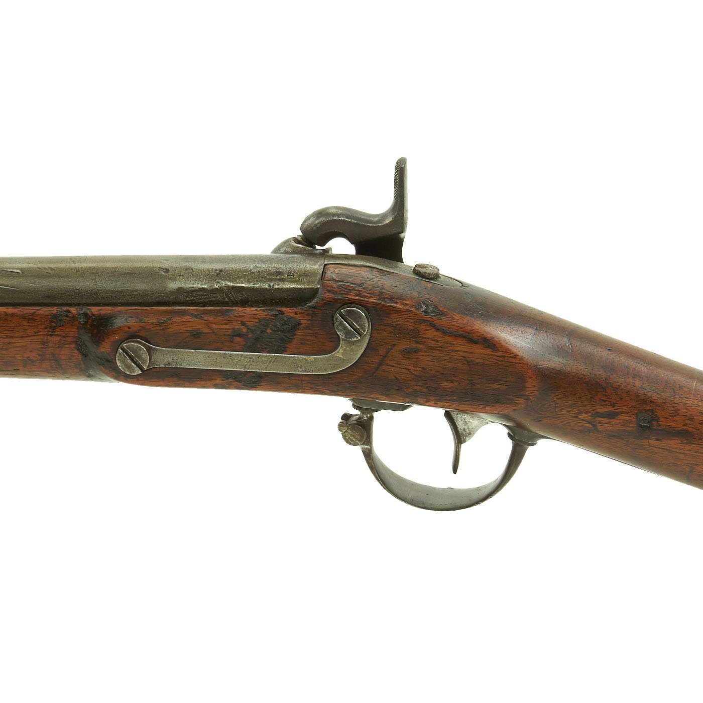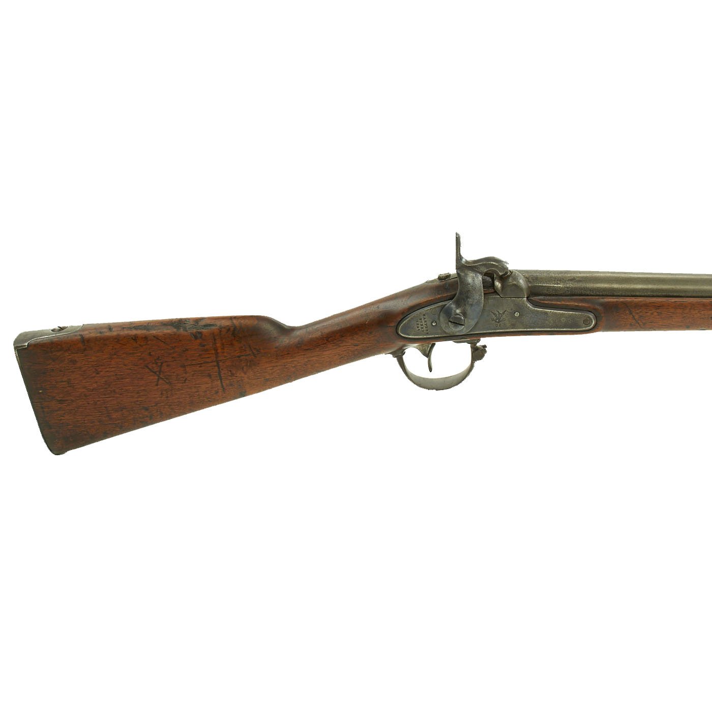 This example is marked with the usual "American Eagle" over US, and the lock plate tail is faintly marked HARPERS / FERRY / 1849. It is a shorter musket, either purpose made or converted to be an Artillery Short Musket, which were not carried over the shoulder, so they did not require sling swivels. Many of the Model 1842 muskets were produced under contract, however this example was made at the Government Harpers Ferry Armory. The rifle side plate is thin and not bulged, as typical of the Model 1842 Musket. Previous iterations had had a more pronounced side plate with a bulge in the middle. The barrel Knoxform has the correct V / P / Eagle's head proof marks on the left side, and there is a trace of the stock cartouche behind the side plate.