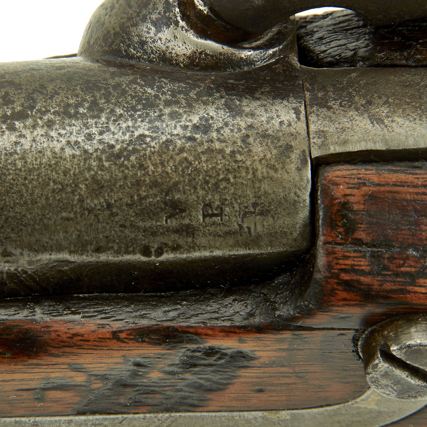 All iron mounts this .69 caliber artillery musket is in good condition, with the original ramrod present, and correct single barrel band and muzzle fitting. Having seen use it is speckled overall with old pits, but is still in fine condition and really good for display. The lock functions correctly, holding at half cock and firing at full. The left side of the butt stock is marked A. B. C. F, but we do not know what the meaning is.