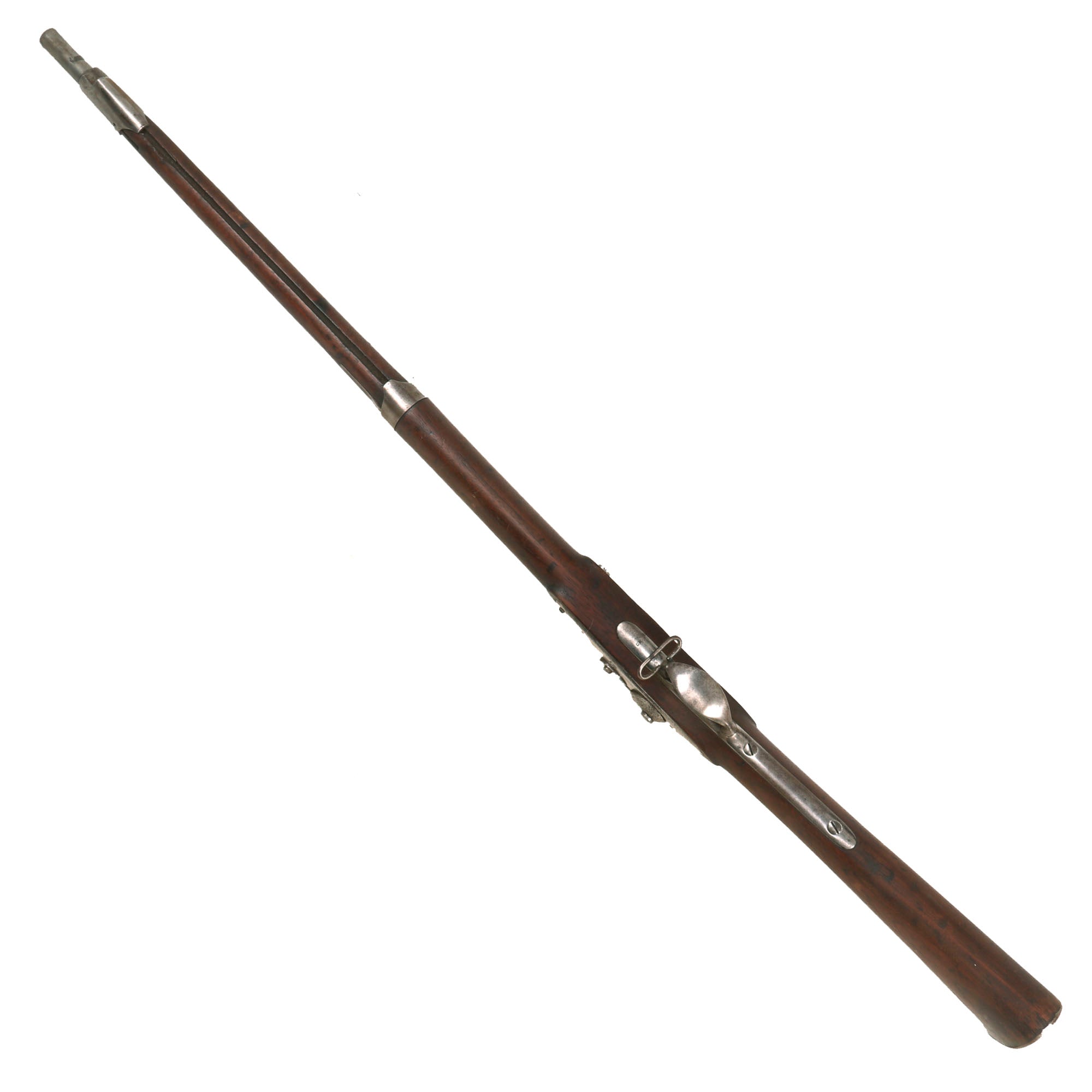 The musket’s barrel has been shortened by roughly 10 inches, from 42” to 32”. This may have been done for several reasons, including the barrel being blown out or damaged. The nose cap was kept, though it is just fitted on by force, as the band spring is missing. Normally a musket with this kind of damage would be discarded, but it may have been pressed into service as an "artillery short musket", particularly if it was in the south when the Civil War broke out.