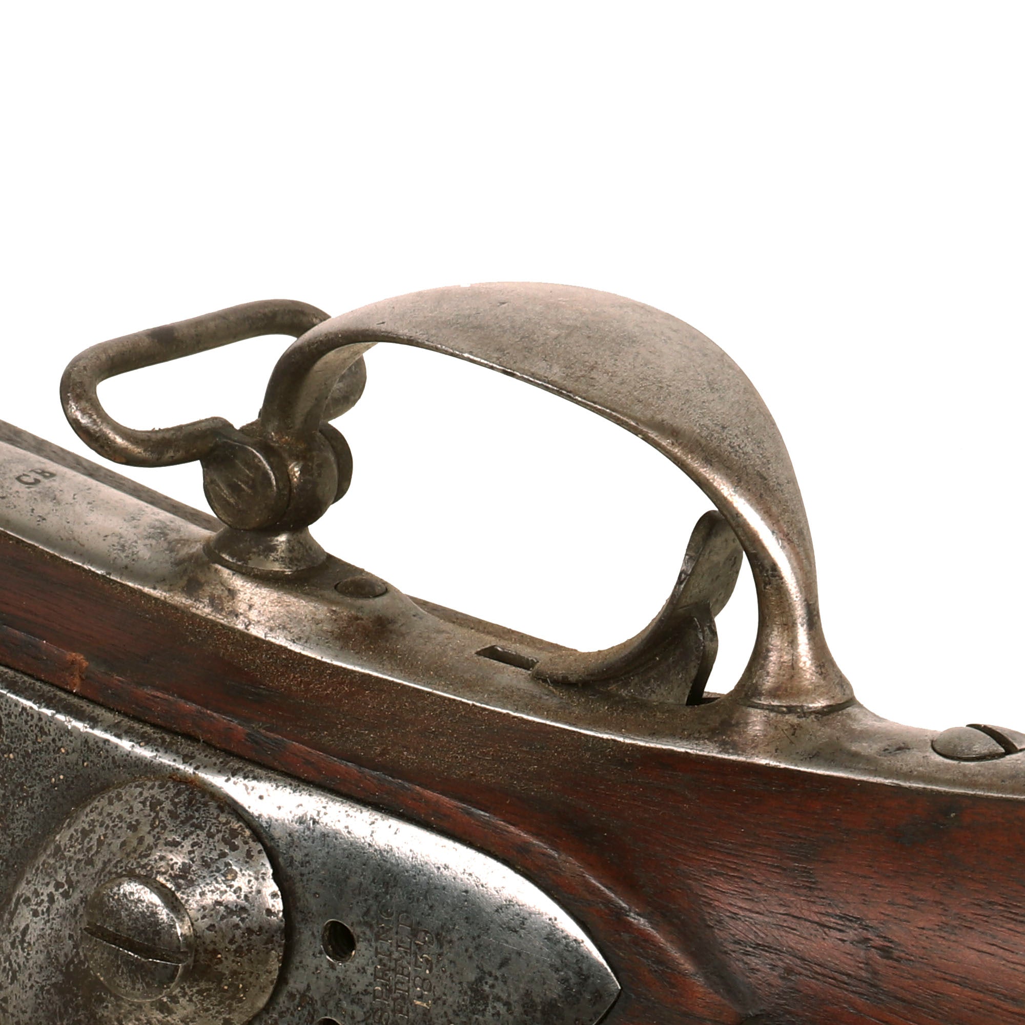 The side plate is bulged and not thin, typical of the Model 1835 Musket. Later iterations would move to a side plate without any bulge in the middle. As the nocks form was removed to convert this example, there are no inspection cartouches on the barrel, except possibly the remains of a "P in an Oval". There are also the remnants of an inspection cartouche on the left side of the stock.