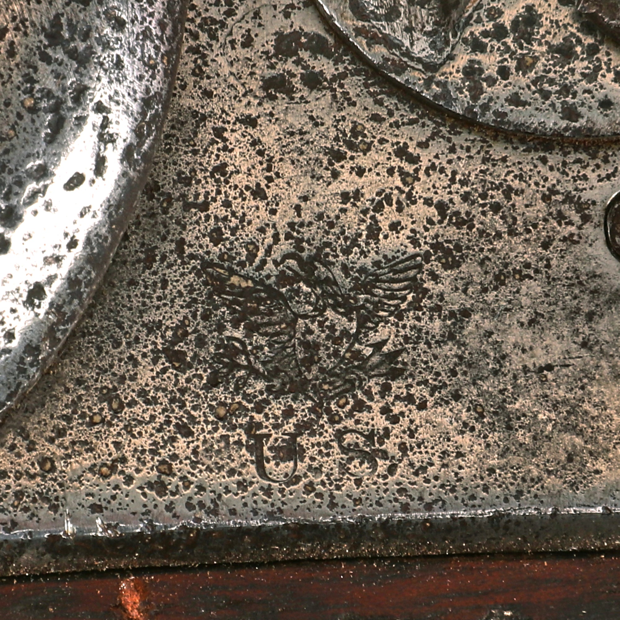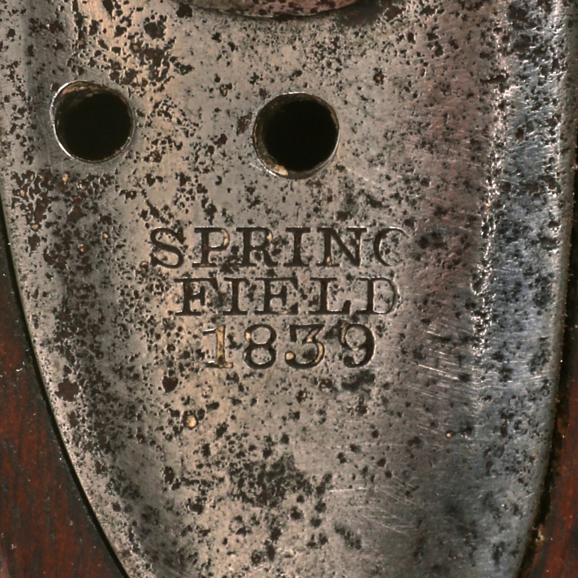 This is almost certainly what happened with this musket, which was converted to percussion at arsenal some time before the Civil War. The mounting points for the frizzen and frizzen spring can still be seen, though they are plugged, and the hammer is a 1842 type. There are no remains of the brass powder pan, removed to make room for the new bolster. The lock plate shows a faint correct "Federal Eagle" / U.S. under of the hammer, and was produced at the United States Armory and Arsenal at Springfield itself, as indicated on the lock plate tail: