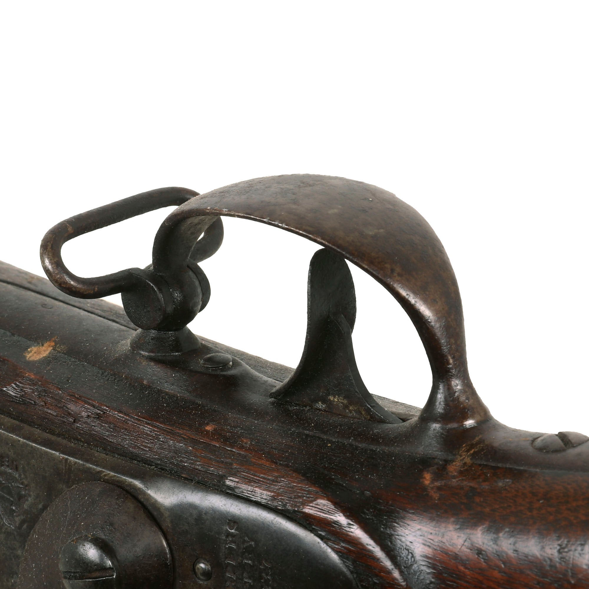The stock is in nice condition, though it definitely has seen its share of service and damage, with a repaired crack through the top of the wrist around the barrel tang, and another through the fore stock area near the lower barrel band. These are very old cracks which were repaired, and it looks like it probably saw additional service after this damage. If this was used on the Confederate side, they definitely were much more tolerant of damage to their weapons, as they had no way to procure replacements. The cleaning rod is still present, as are both sling swivels, however the trigger guard swivel is frozen.
