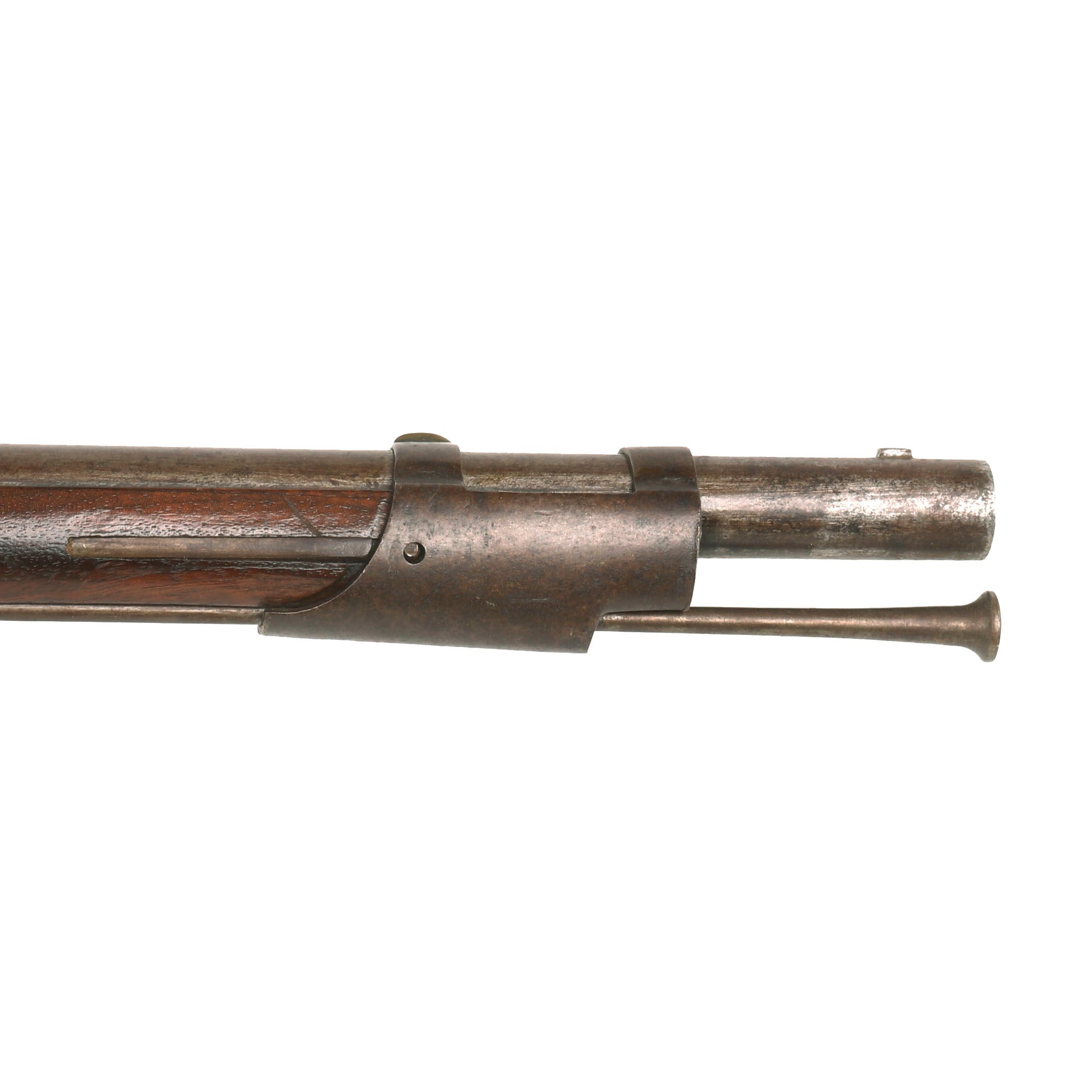 The musket overall shows that it saw long service, very possibly during the Civil War, most likely on the Confederate side. Many muskets were captured during battles near Harpers Ferry Armory, and were used throughout the war due to arms shortages in the South. The metalwork shows an aged patina overall, showing years of cleaning after long service. The lock functions, holding correctly at half cock, and firing at full. The rifled bore still shows the three grooves clearly, however it was definitely not cleaned after the last use, so there is powder fouling and oxidation overall. The cap nipple cone looks to original, and show a significant oxidation from powder burn.
