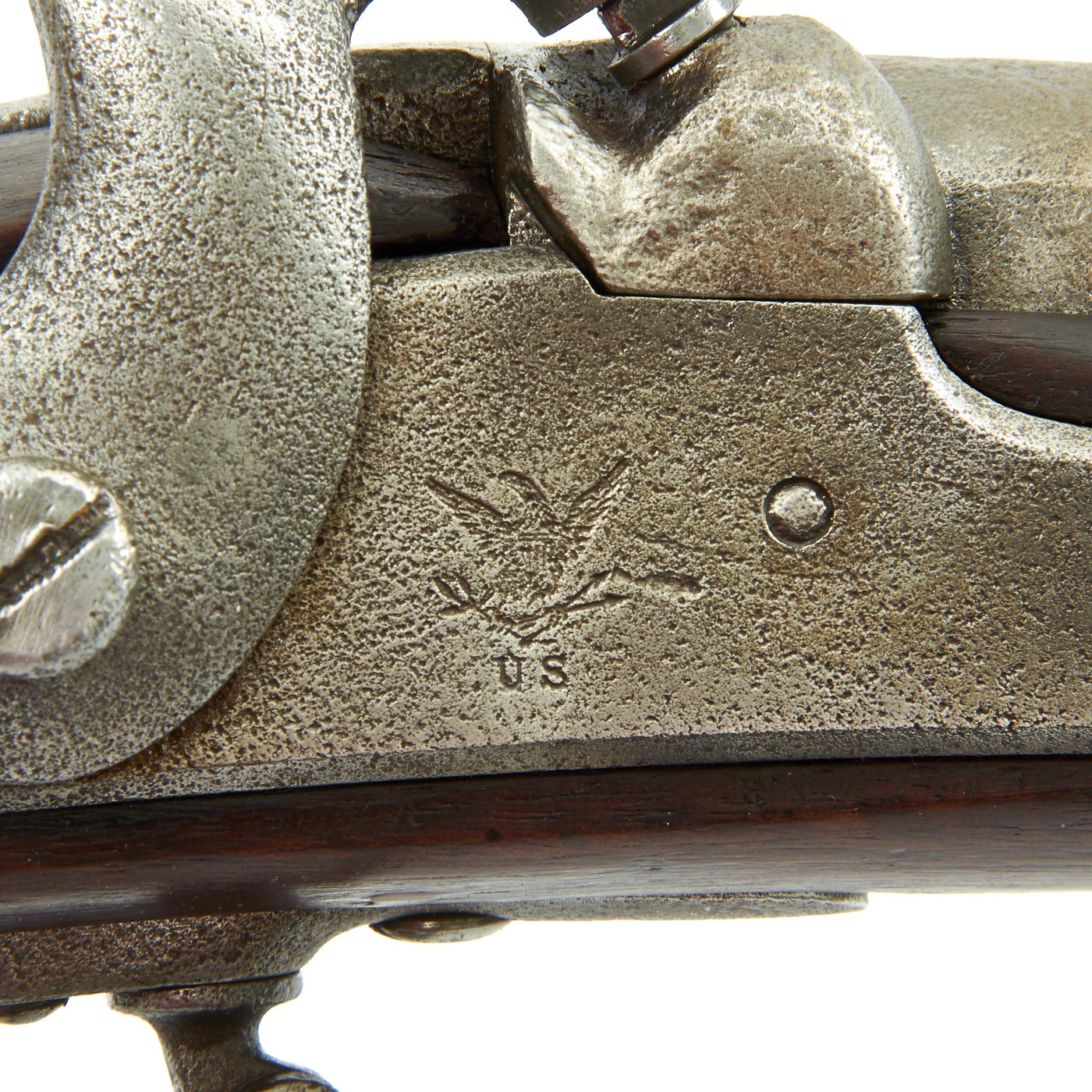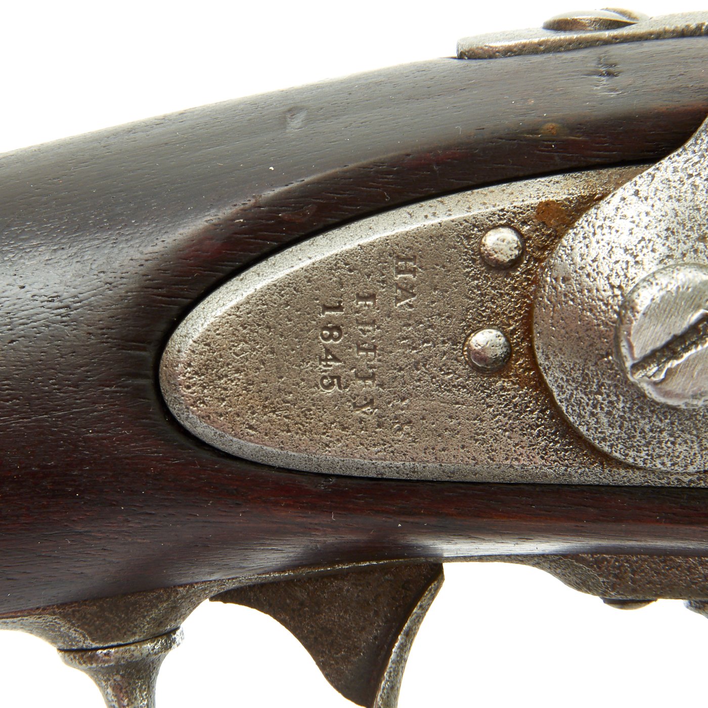 This example is marked with the usual "American Eagle" over US, and the lock plate tail is faintly marked HARPERS / FERRY / 1845. Many of these muskets were produced under contract, however this example was made at Harpers Ferry Armory. The rifle side plate is thin and not bulged, as typical of the Model 1842 Musket. Previous iterations had had a more pronounced side plate with a bulge in the middle. The barrel Knoxform is unmarked, as oxidation and powder burn have eroded away the markings.