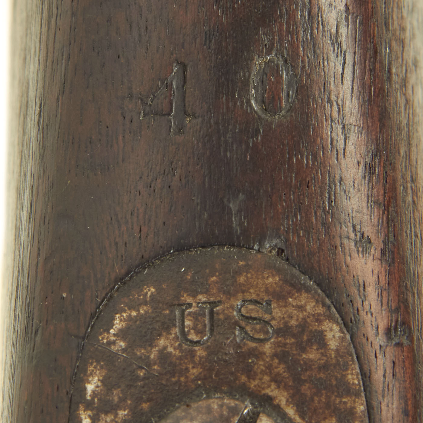 With all iron mounts this .69 caliber musket is in very good condition, with the original ramrod present, along with both barrel bands and the nose cap. The butt plate is correctly U.S. marked. It still has both sling swivels present, one on the middle barrel band and one on the front of the trigger guard. There is some light powder burn near the cap bolster, and the metalwork shows some deterioration in that area. The cap nipple cone looks to be original, and shows wear from oxidation and cleaning. The lock still functions correctly, holding correctly at half cock and firing at full. We checked the bore, and it is still smoothbore, and was not rifled later, as many were.