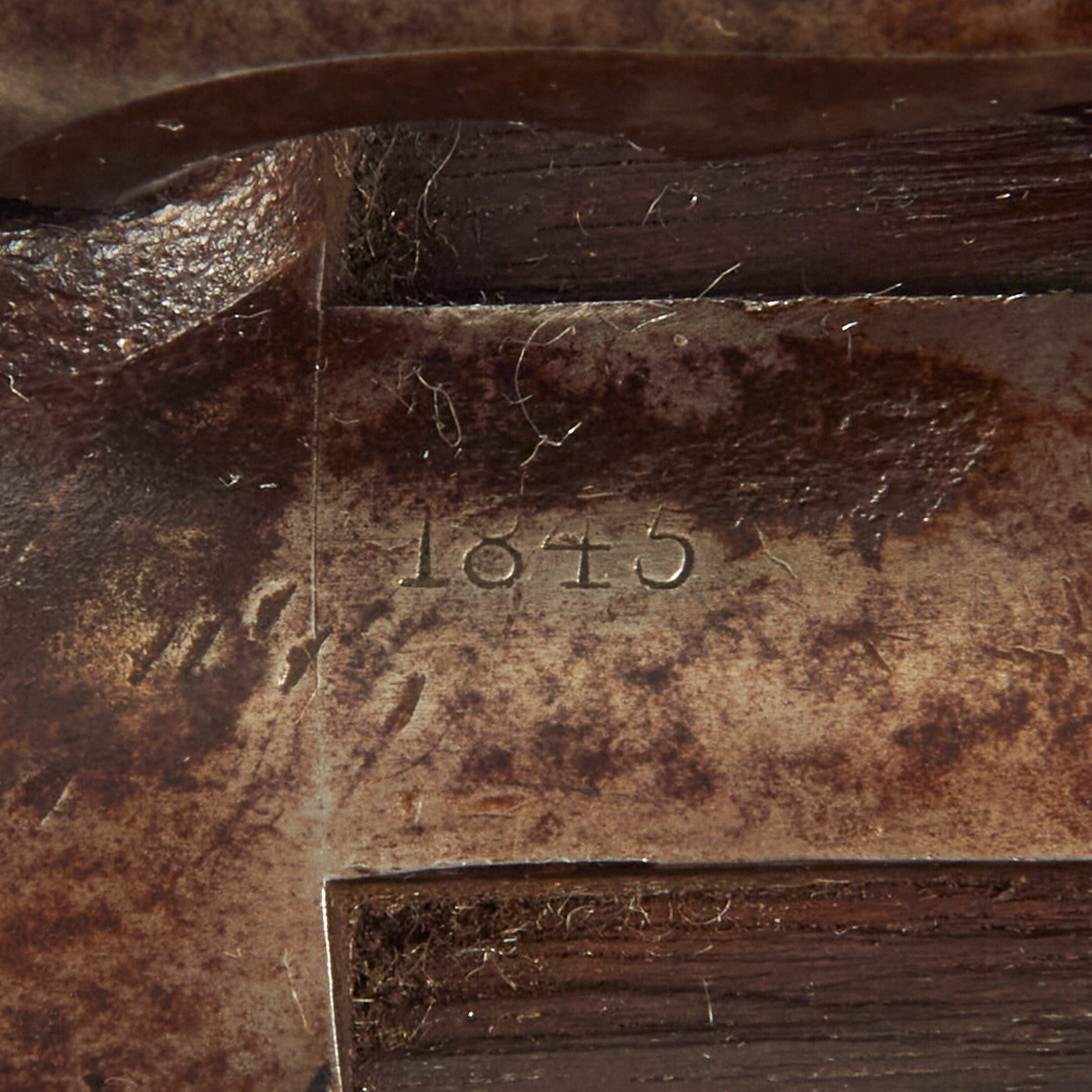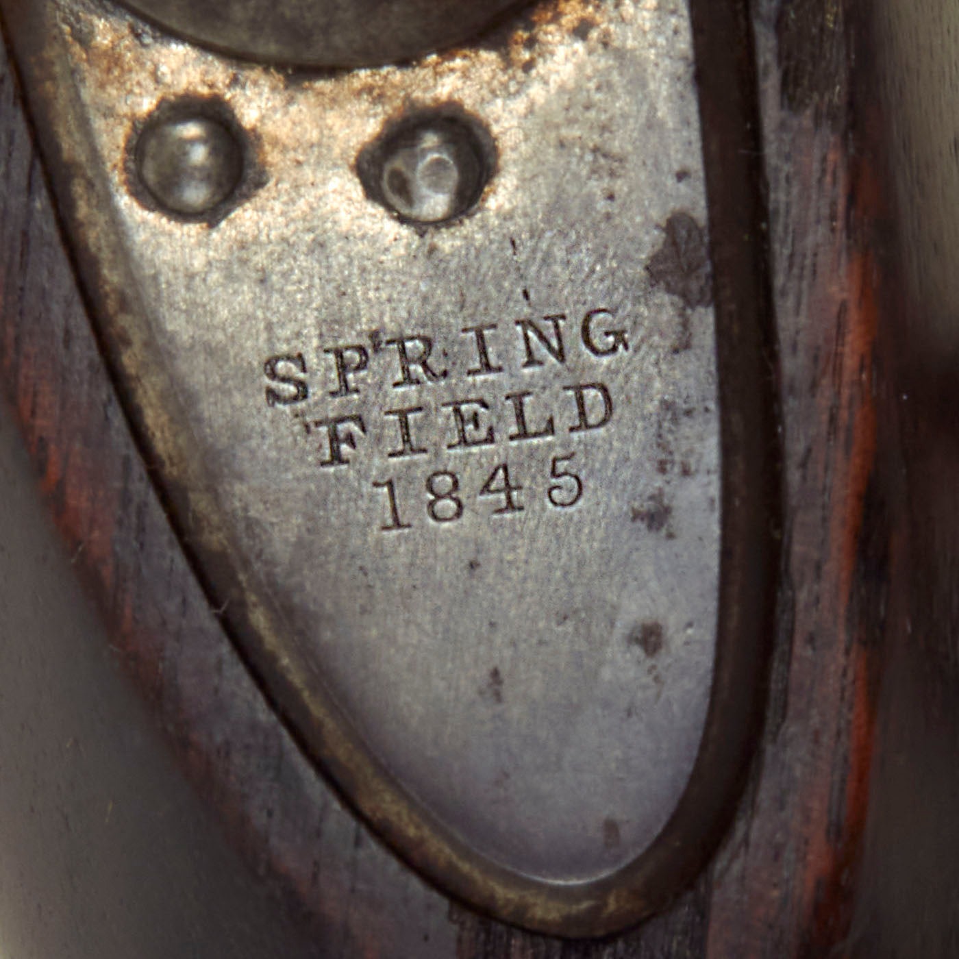 The Models 1840 & 1842 were made with thicker barrel walls, with the intention that they could be rifled later, however this example is still in the original smoothbore configuration. It is marked with an "American Eagle" over US, and the lock plate tail is clearly marked SPRING / FIELD / 1845. Many of these muskets were produced under contract, however this example was made at the United States Armory and Arsenal at Springfield itself. The rifle side plate is thin and not bulged, as typical of the Model 1842 Musket. Previous iterations had had a more pronounced side plate with a bulge in the middle. The barrel nocks form still has V / P / Eagle's Head proof marks visible, as well as a barrel tang date of 1845.