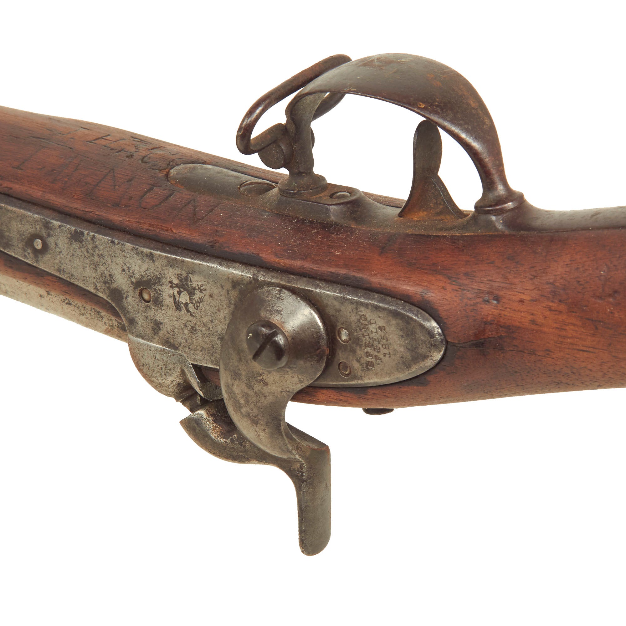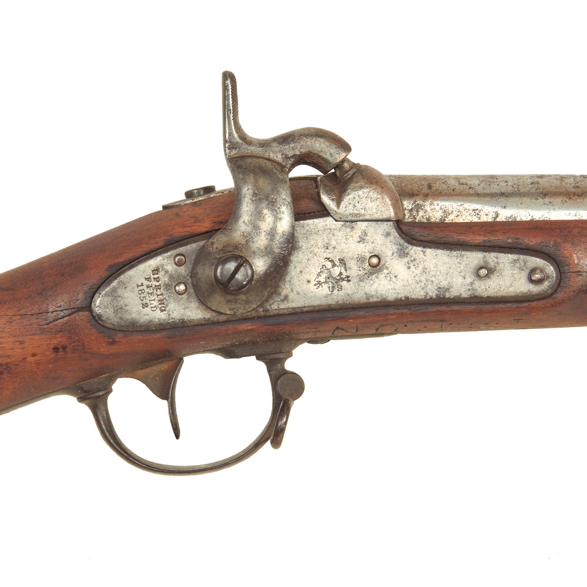 The Models 1840 & 1842 were made with thicker barrel walls, with the intention that they could be rifled later, however this example is still in the original smoothbore configuration. It is marked with an "American Eagle" over US, and the lock plate tail is clearly marked SPRING / FIELD / 1852. Many of these muskets were produced under contract, however this example was made at the United States Armory and Arsenal at Springfield itself. The rifle side plate is thin and not bulged, as typical of the Model 1842 Musket. Previous iterations had had a more pronounced side plate with a bulge in the middle. The barrel nocks form still has V / P / Eagle's Head proof marks visible and CRISP, with a fully legible 1852 date on the barrel tang.
