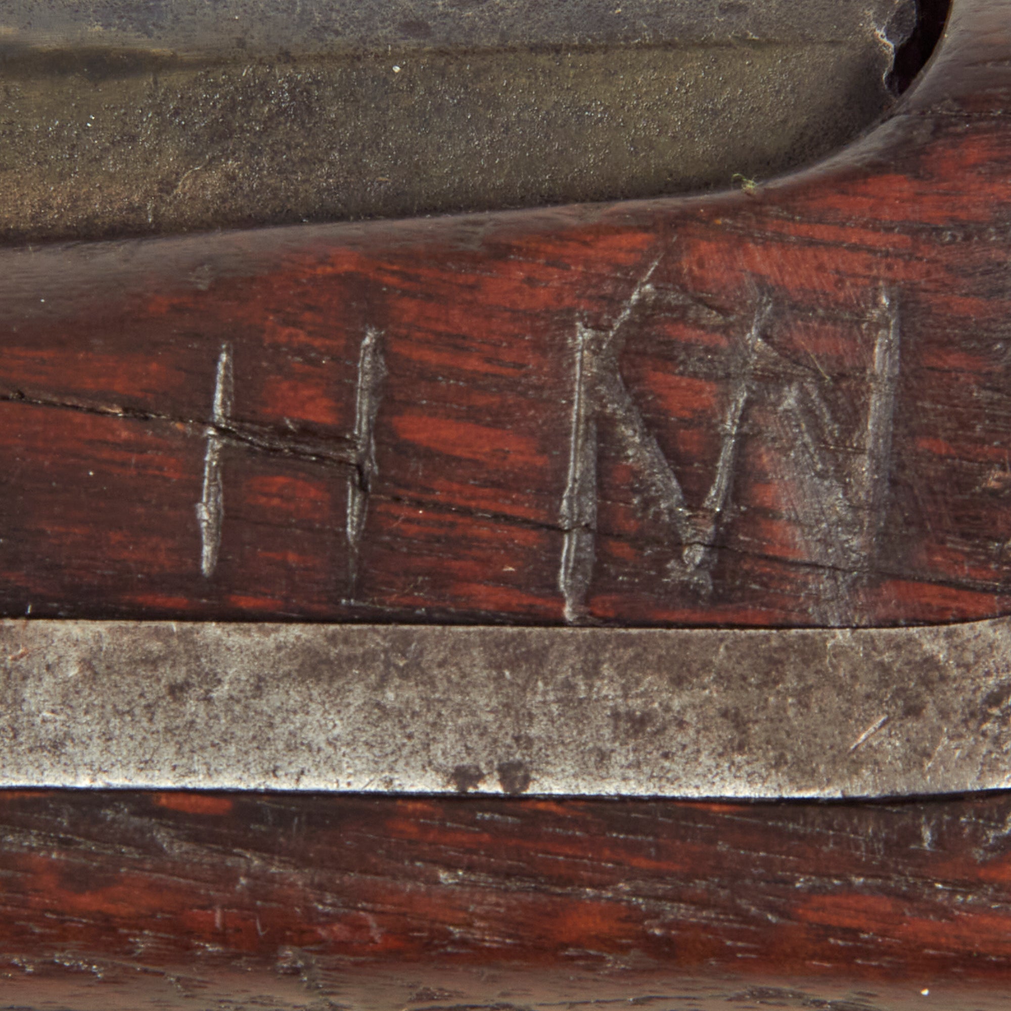 With all iron mounts this .69 caliber musket is in very good condition, with the original ramrod present, along with both barrel bands and the nose cap. The butt plate is correctly U.S. marked. It still has both sling swivels present, one on the middle barrel band and one on the front of the trigger guard. There is powder burn near the cap bolster, and the metalwork shows some deterioration in that area. The cap nipple cone looks to be original, and shows wear from oxidation and cleaning, and can still be unscrewed relatively easily. The lock still functions correctly, holding correctly at half cock and firing at full. We checked the bore, and it is still smoothbore, and was not rifled later, as many were, though it is a bit fouled and oxidized inside.